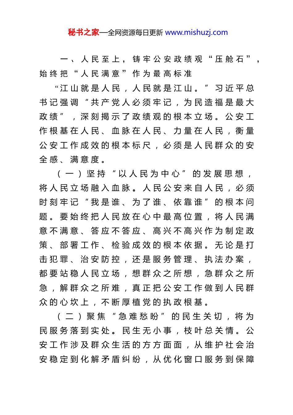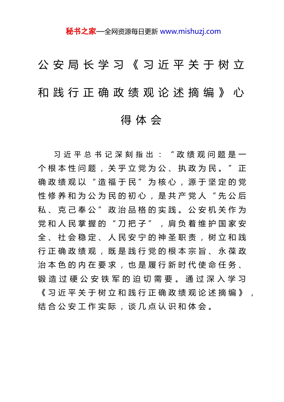 秘书之家—全网资源每日更新 www.mishuzj.com公 安 局 长 学 习 《 习 近 平 关 于 树 立和 践 行 正 确 政 绩 观 论 述 摘 编 》 心得 体 会习 近 平 总 书 记 深 刻 指 出 : “ 政 绩 观 问 题 是 一个 根 本 性 问 题 , 关 乎 立 党 为 公 、 执 政 为 民 。 ” 正确 政 绩 观 以 “ 造 福 于 民 ” 为 核 心 , 源 于 坚 定 的 党性 修 养 和 为 公 为 民 的 初 心 , 是 共 产 党 人 “ 先 公 后私 、 克 己 奉 公 ” 政 治 品 格 的 实 践 。 公 安 机 关 作 为党 和 人 民 掌 握 的 “ 刀 把 子 ” , 肩 负 着 维 护 国 家 安全 、 社 会 稳 定 、 人 民 安 宁 的 神 圣 职 责 , 树 立 和 践行 正 确 政 绩 观 , 既 是 践 行 党 的 根 本 宗 旨 、 永 葆 政治 本 色 的 内 在 要 求 , 也 是 履 行 新 时 代 使 命 任 务 、锻 造 过 硬 公 安 铁 军 的 迫 切 需 要 。 通 过 深 入 学 习《 习 近 平 关 于 树 立 和 践 行 正 确 政 绩 观 论 述 摘 编 》 ,结 合 公 安 工 作 实 际 , 谈 几 点 认 识 和 体 会 。秘书之家—全网资源每日更新 www.mishuzj.com一 、 人 民 至 上 , 铸 牢 公 安 政 绩 观 “ 压 舱 石 ” ,始 终 把 “ 人 民 满 意 ” 作 为 最 高 标 准“ 江 山 就 是 人 民 , 人 民 就 是 江 山 。 ” 习 近 平 总书 记 强 调 “ 共 产 党 人 必 须 牢 记 , 为 民 造 福 是 最 大政 绩 ” , 深 刻 揭 示 了 政 绩 观 的 根 本 立 场 。 公 安 工作 根 基 在 人 民 、 血 脉 在 人 民 、 力 量 在 人 民 , 衡 量公 安 工 作 成 效 的 根 本 标 尺 , 必 须 是 人 民 群 众 的 安全 感 、 满 意 度 。( 一 ) 坚 持 “ 以 人 民 为 中 心 ” 的 发 展 思 想 ,将 人 民 立 场 融 入 血 脉 。 人 民 公 安 来 自 人 民 , 必 须时 刻 牢 记 “ 我 是 谁 、 为 了 谁 、 依 靠 谁 ” 的 根 本 问题 。 要 始 终 把 人 民 放 在 心 中 最 高 位 置 , 将 人 民 满意 不 满 意 、 答 应 不 答 应 、 高 兴 不 高 兴 作 为 制 定 政策 、 部 署 工 作 、 检 验 成 效 的 根 本 依 据 。 无 论 是 打击 犯 罪 、 治 安 防 控 , 还 是 服 务 管 理 、 执 法 办 案 ,都 要 站 稳 人 民 立 场 , 想 群 众 之 所 想 , 急 群 众 之 所急 , 解 群 众 之 所 难 , 真 正 把 公 安 工 作 做 到 人 民 群众 的 心 坎 上 , 不 断 厚 植 党 的 执 政 根 基 。( 二 ) 聚 焦 “ 急 难 愁 盼 ” 的 民 生 关 切 , 将 为民 服 务 落 到 实 处 。 民 生 无 小 事 , 枝 叶 总 关 情 。 公安 工 作 涉 及 群 众 生 活 的 方 方 面 面 , 从 维 护 社 会 治安 稳 定 到 化 解 矛 盾 纠 纷 , 从 优 化 窗 口 服 务 到 保 障秘书之家—全网资源每日更新 www.mishuzj.com公 共 安 全 , 每 一 项 工 作 都 与 群 众 利 益 息 息 相 关 。要 建 立 完 善 “ 民 有 所 呼 、 我 有 所 应 ” 的 快 速 响 应机 制 , 紧 盯 群 众 反 映 强 烈 的 突 出 治 安 问 题 、 执 法服 务 中 的 顽 瘴 痼 疾 、 影 响 安 全 感 的 “ 小 案 小 事 ” ,出 重 拳 、 下 猛 药 、 求 实 效 。 要 坚 决 杜 绝 “ 门 难 进 、脸 难 看 、 ...