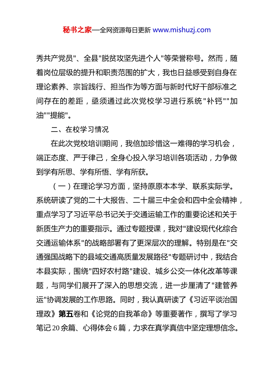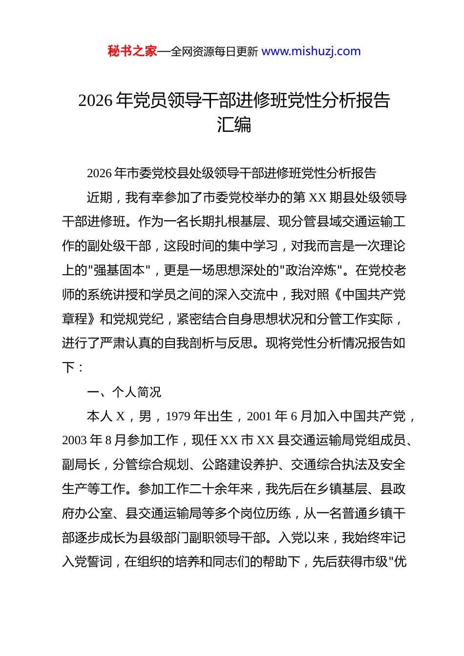 秘书之家—全网资源每日更新 www.mishuzj.com2026 年党员领导干部进修班党性分析报告汇编 2026 年市委党校县处级领导干部进修班党性分析报告近期,我有幸参加了市委党校举办的第 XX 期县处级领导干部进修班。作为一名长期扎根基层、现分管县域交通运输工作的副处级干部,这段时间的集中学习,对我而言是一次理论上的"强基固本",更是一场思想深处的"政治淬炼"。在党校老师的系统讲授和学员之间的深入交流中,我对照《中国共产党章程》和党规党纪,紧密结合自身思想状况和分管工作实际,进行了严肃认真的自我剖析与反思。现将党性分析情况报告如下:一、个人简况本人 X,男,1979 年出生,2001 年 6 月加入中国共产党,2003 年 8 月参加工作,现任 XX 市 XX 县交通运输局党组成员、副局长,分管综合规划、公路建设养护、交通综合执法及安全生产等工作。参加工作二十余年来,我先后在乡镇基层、县政府办公室、县交通运输局等多个岗位历练,从一名普通乡镇干部逐步成长为县级部门副职领导干部。入党以来,我始终牢记入党誓词,在组织的培养和同志们的帮助下,先后获得市级"优秘书之家—全网资源每日更新 www.mishuzj.com秀共产党员"、全县"脱贫攻坚先进个人"等荣誉称号。然而,随着岗位层级的提升和职责范围的扩大,我也日益感受到自身在理论素养、宗旨践行、担当作为等方面与新时代好干部标准之间存在的差距,亟须通过此次党校学习进行系统 "补钙""加油""提能"。二、在校学习情况在此次党校培训期间,我倍加珍惜这一难得的学习机会,端正态度、严于律己,全身心投入学习培训各项活动,力争做到学有所思、学有所悟、学有所获。(一)在理论学习方面,坚持原原本本学、联系实际学。系统研读了党的二十大报告、二十届三中全会和四中全会精神,重点学习了习近平总书记关于交通运输工作的重要论述和关于新质生产力的重要指示。通过专题授课,我对"建设现代化综合交通运输体系"的战略部署有了更深层次的理解。特别是在"交通强国战略下的县域交通高质量发展路径"专题研讨中,我结合本县实际,围绕"四好农村路"建设、城乡公交一体化改革等课题,与同学们展开了深入的思想交流,进一步厘清了"建管养运"协调发展的工作思路。同时,我认真研读了《习近平谈治国理政》第五卷和《论党的自我革命》等重要著作,撰写了学习笔记 20 余篇、心得体会 6 篇,力求在真学真信中坚定理想信念。秘书之家—全网资源每日更新 www.mishuzj.com(二)在党性锻炼方面,坚持知行合一、锤炼品格。积极参加班级组织的红色教育基地现场教学活动,在 XX 革命纪念馆重温入党誓词,在 XX 烈士陵园缅怀先烈事迹,受到了深刻的精神洗礼。在党性分析专题课上,我敞开心扉、坦诚交流,主动亮丑揭短,接受了同学们的善意批评和组织的真诚帮助。在学员论坛上,我围绕"如何破解县域交通资金瓶颈"这一主题做了经验分享,同时也认真听取了其他县区同志的做法和建议,在比较中找差距、在交流中拓视野。(三)在学风纪律方面,坚持严以律己、以身作则。严格遵守党校各项规章制度和培训纪律,坚持全勤参训,无迟到、早退、缺课现象。在小组讨论中积极发言、主动建言;在课后自学中合理安排时间,不搞应酬、不搞吃请。作为班委成员,我带头遵守中央八项规定精神,在住宿、就餐等方面厉行节约,自觉维护领导干部良好形象。三、查摆问题对照《中国共产党章程》《关于新形势下党内政治生活的若干准则》和《中国共产党纪律处分条例》等党内法规要求,结合党校学习的深刻触动和思想洗礼,我坚持刀刃向内、深挖细查,发现自身在以下六个方面存在突出问题和明显差距:第一,理论学习的"深度"有所欠缺,政治站位不够高。虽秘书之家—全网资源每日更新 www.mishuzj.com然日常工作中能够坚持参加党组理论学习中心组集中学习,但个人自学存在明显的碎片化、随意化倾向。学习党的创新理论往往满足于"了解大概""掌握要点",对蕴含其中的马克思主义立场观点方法研究不深、领悟不透。特别是在运用习近平新时代中国特色社会主义思想指导交通规划决策方面,存在"学归学、用归用"的"两张皮"现象。例如,在 2025 年编制全...