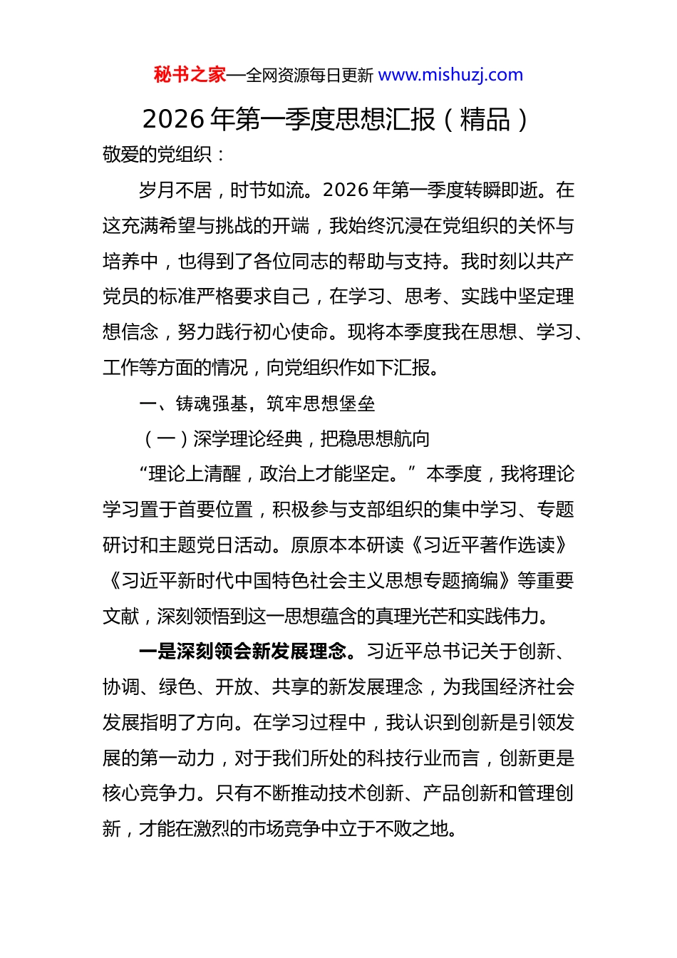 秘书之家—全网资源每日更新 www.mishuzj.com2026 年第一季度思想汇报(精品)敬爱的党组织:岁月不居,时节如流。2026 年第一季度转瞬即逝。在这充满希望与挑战的开端,我始终沉浸在党组织的关怀与培养中,也得到了各位同志的帮助与支持。我时刻以共产党员的标准严格要求自己,在学习、思考、实践中坚定理想信念,努力践行初心使命。现将本季度我在思想、学习、工作等方面的情况,向党组织作如下汇报。一、铸魂强基,筑牢思想堡垒(一)深学理论经典,把稳思想航向“理论上清醒,政治上才能坚定。”本季度,我将理论学习置于首要位置,积极参与支部组织的集中学习、专题研讨和主题党日活动。原原本本研读《习近平著作选读》《习近平新时代中国特色社会主义思想专题摘编》等重要文献,深刻领悟到这一思想蕴含的真理光芒和实践伟力。一是深刻领会新发展理念。习近平总书记关于创新、协调、绿色、开放、共享的新发展理念,为我国经济社会发展指明了方向。在学习过程中,我认识到创新是引领发展的第一动力,对于我们所处的科技行业而言,创新更是核心竞争力。只有不断推动技术创新、产品创新和管理创新,才能在激烈的市场竞争中立于不败之地。秘书之家—全网资源每日更新 www.mishuzj.com二是感悟“以人民为中心”的发展思想。总书记强调“人民对美好生活的向往,就是我们的奋斗目标”。这让我更加明确工作的出发点和落脚点,我们所做的一切工作都是为了满足人民群众日益增长的美好生活需要。无论是开发新产品还是提供服务,都要以人民的需求为导向,切实提高人民群众的获得感、幸福感和安全感。三是坚定“两个确立”的思想认同。通过深入学习,我更加深刻地认识到“两个确立”是党在新时代取得的重大政治成果,是推动党和国家事业取得历史性成就、发生历史性变革的决定性因素。我将坚决拥护“两个确立”,做到思想上高度认同、政治上坚决维护、组织上自觉服从行动上紧紧跟随。(二)紧跟政策导向,明晰行动坐标全国两会的胜利召开,为全年的工作指明了方向。我通过认真学习两会精神,关注政府工作报告中的各项政策举措,深刻认识到我们正处在一个大有可为的时代。一是聚焦科技自立自强。两会强调要加快实现高水平科技自立自强,这对于我们科技工作者来说既是机遇也是挑战。我们要加大研发投入,加强关键核心技术攻关,突破“卡脖子”技术难题,掌握科技发展的主动权。同时,要加强科技创新人才培养,营造良好的创新生态环境。秘书之家—全网资源每日更新 www.mishuzj.com二是关注民生福祉提升。两会提出了一系列保障和改善民生的政策措施,如促进就业、提高教育质量、加强医疗卫生服务等。这让我更加深刻地认识到,作为一名入党积极分子,要始终把人民的利益放在首位,积极参与社会公益活动,为解决民生问题贡献自己的力量。三是践行绿色发展理念。两会强调要推动绿色发展,促进人与自然和谐共生。在工作中,我们要积极推广绿色技术和产品,减少能源消耗和环境污染。同时,要加强环保宣传教育,提高公众的环保意识,共同营造美丽家园。(三)注重学用结合,转化学习成效理论的价值在于指导实践,学习的目的在于运用。在实际工作中,我努力将所学的理论知识转化为实际行动。一是将创新理念融入工作。在项目研发过程中,我积极提出创新思路和建议,推动项目的技术升级和产品优化。通过引入新的算法和技术,提高了产品的性能和效率,得到了客户的认可和好评。二是关注民生需求开展工作。我们公司开发的一款智能健康监测产品,主要面向老年人群体。在产品设计和开发过程中,我深入了解老年人群体的需求和使用习惯,提出了一系列人性化的设计建议,如简化操作界面、增加语音提示等,使产品更加方便老年人使用。秘书之家—全网资源每日更新 www.mishuzj.com三是宣传环保理念促进工作。在公司组织的环保宣传活动中,我积极参与,向同事和客户宣传环保知识和绿色发展理念。通过发放宣传资料、举办讲座等形式,提高了大家的环保意识,营造了良好的环保氛围。二、求知奋进,提升综合素养(一)专业学习精益求精作为一名科技工作者,专业知识的学习至关重要。本季度,我制定了详细的学习计...
