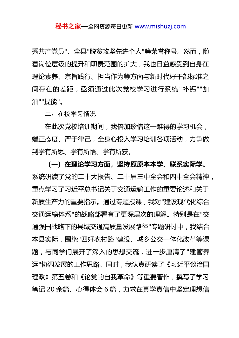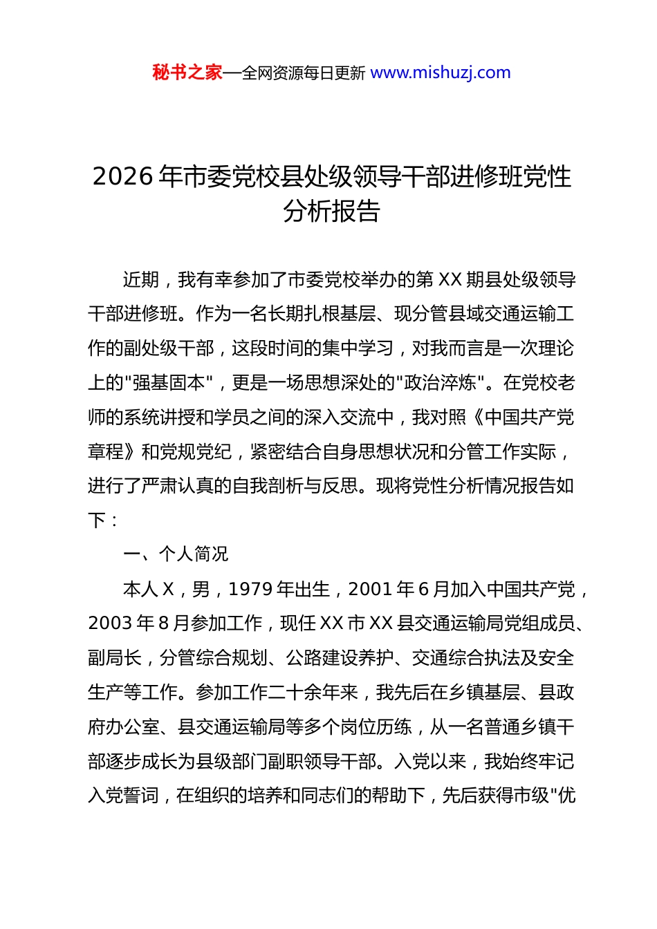 秘书之家—全网资源每日更新 www.mishuzj.com2026 年市委党校县处级领导干部进修班党性分析报告近期,我有幸参加了市委党校举办的第 XX 期县处级领导干部进修班。作为一名长期扎根基层、现分管县域交通运输工作的副处级干部,这段时间的集中学习,对我而言是一次理论上的"强基固本",更是一场思想深处的"政治淬炼"。在党校老师的系统讲授和学员之间的深入交流中,我对照《中国共产党章程》和党规党纪,紧密结合自身思想状况和分管工作实际,进行了严肃认真的自我剖析与反思。现将党性分析情况报告如下:一、个人简况本人 X,男,1979 年出生,2001 年 6 月加入中国共产党,2003 年 8 月参加工作,现任 XX 市 XX 县交通运输局党组成员、副局长,分管综合规划、公路建设养护、交通综合执法及安全生产等工作。参加工作二十余年来,我先后在乡镇基层、县政府办公室、县交通运输局等多个岗位历练,从一名普通乡镇干部逐步成长为县级部门副职领导干部。入党以来,我始终牢记入党誓词,在组织的培养和同志们的帮助下,先后获得市级"优秘书之家—全网资源每日更新 www.mishuzj.com秀共产党员"、全县"脱贫攻坚先进个人"等荣誉称号。然而,随着岗位层级的提升和职责范围的扩大,我也日益感受到自身在理论素养、宗旨践行、担当作为等方面与新时代好干部标准之间存在的差距,亟须通过此次党校学习进行系统 "补钙""加油""提能"。二、在校学习情况在此次党校培训期间,我倍加珍惜这一难得的学习机会,端正态度、严于律己,全身心投入学习培训各项活动,力争做到学有所思、学有所悟、学有所获。(一)在理论学习方面,坚持原原本本学、联系实际学。系统研读了党的二十大报告、二十届三中全会和四中全会精神,重点学习了习近平总书记关于交通运输工作的重要论述和关于新质生产力的重要指示。通过专题授课,我对"建设现代化综合交通运输体系"的战略部署有了更深层次的理解。特别是在"交通强国战略下的县域交通高质量发展路径"专题研讨中,我结合本县实际,围绕"四好农村路"建设、城乡公交一体化改革等课题,与同学们展开了深入的思想交流,进一步厘清了"建管养运"协调发展的工作思路。同时,我认真研读了《习近平谈治国理政》第五卷和《论党的自我革命》等重要著作,撰写了学习笔记 20 余篇、心得体会 6 篇,力求在真学真信中坚定理想信秘书之家—全网资源每日更新 www.mishuzj.com念。(二)在党性锻炼方面,坚持知行合一、锤炼品格。积极参加班级组织的红色教育基地现场教学活动,在 XX 革命纪念馆重温入党誓词,在 XX 烈士陵园缅怀先烈事迹,受到了深刻的精神洗礼。在党性分析专题课上,我敞开心扉、坦诚交流,主动亮丑揭短,接受了同学们的善意批评和组织的真诚帮助。在学员论坛上,我围绕"如何破解县域交通资金瓶颈"这一主题做了经验分享,同时也认真听取了其他县区同志的做法和建议,在比较中找差距、在交流中拓视野。(三)在学风纪律方面,坚持严以律己、以身作则。严格遵守党校各项规章制度和培训纪律,坚持全勤参训,无迟到、早退、缺课现象。在小组讨论中积极发言、主动建言;在课后自学中合理安排时间,不搞应酬、不搞吃请。作为班委成员,我带头遵守中央八项规定精神,在住宿、就餐等方面厉行节约,自觉维护领导干部良好形象。三、查摆问题对照《中国共产党章程》《关于新形势下党内政治生活的若干准则》和《中国共产党纪律处分条例》等党内法规要求,结合党校学习的深刻触动和思想洗礼,我坚持刀刃向内、深挖细查,发现自身在以下六个方面存在突出问题和明显差距:秘书之家—全网资源每日更新 www.mishuzj.com第一,理论学习的"深度"有所欠缺,政治站位不够高。虽然日常工作中能够坚持参加党组理论学习中心组集中学习,但个人自学存在明显的碎片化、随意化倾向。学习党的创新理论往往满足于"了解大概""掌握要点",对蕴含其中的马克思主义立场观点方法研究不深、领悟不透。特别是在运用习近平新时代中国特色社会主义思想指导交通规划决策方面,存在"学归学、用归用"的"两张皮"现象。例如,在 2025 年编制全县"十五五"交通发展规划初期,对新发展理念的贯...