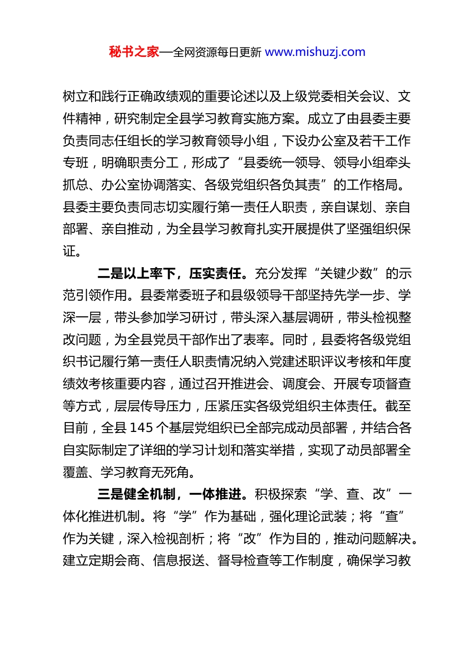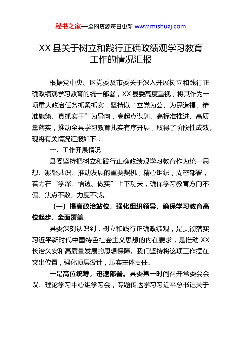 秘书之家—全网资源每日更新 www.mishuzj.comXX 县关于树立和践行正确政绩观学习教育工作的情况汇报根据党中央、区党委及市委关于深入开展树立和践行正确政绩观学习教育的统一部署,XX 县委高度重视,将其作为一项重大政治任务抓紧抓实,坚持以“立党为公、为民造福、精准施策、真抓实干”为导向,高起点谋划、高标准推进、高质量落实,推动全县学习教育扎实有序开展,取得了阶段性成效。现将有关情况汇报如下:一、工作开展情况县委坚持把树立和践行正确政绩观学习教育作为统一思想、凝聚共识、推动发展的重要契机,精心组织,周密部署,着力在“学深、悟透、做实”上下功夫,确保学习教育方向不偏、焦点不散、力度不减。(一)提高政治站位,强化组织领导,确保学习教育高位起步、全面覆盖。县委深刻认识到,树立和践行正确政绩观,是贯彻落实习近平新时代中国特色社会主义思想的内在要求,是推动 XX长治久安和高质量发展的思想保障。我们坚持将这项工作摆在突出位置,强化顶层设计,压实主体责任。一是高位统筹,迅速部署。县委第一时间召开常委会会议、理论学习中心组学习会,专题传达学习习近平总书记关于秘书之家—全网资源每日更新 www.mishuzj.com树立和践行正确政绩观的重要论述以及上级党委相关会议、文件精神,研究制定全县学习教育实施方案。成立了由县委主要负责同志任组长的学习教育领导小组,下设办公室及若干工作专班,明确职责分工,形成了“县委统一领导、领导小组牵头抓总、办公室协调落实、各级党组织各负其责”的工作格局。县委主要负责同志切实履行第一责任人职责,亲自谋划、亲自部署、亲自推动,为全县学习教育扎实开展提供了坚强组织保证。二是以上率下,压实责任。充分发挥“关键少数”的示范引领作用。县委常委班子和县级领导干部坚持先学一步、学深一层,带头参加学习研讨,带头深入基层调研,带头检视整改问题,为全县党员干部作出了表率。同时,县委将各级党组织书记履行第一责任人职责情况纳入党建述职评议考核和年度绩效考核重要内容,通过召开推进会、调度会、开展专项督查等方式,层层传导压力,压紧压实各级党组织主体责任。截至目前,全县 145 个基层党组织已全部完成动员部署,并结合各自实际制定了详细的学习计划和落实举措,实现了动员部署全覆盖、学习教育无死角。三是健全机制,一体推进。积极探索“学、查、改”一体化推进机制。将“学”作为基础,强化理论武装;将“查”作为关键,深入检视剖析;将“改”作为目的,推动问题解决。建立定期会商、信息报送、督导检查等工作制度,确保学习教秘书之家—全网资源每日更新 www.mishuzj.com育各项任务环环相扣、有序衔接、同步推进。领导小组办公室定期编发工作简报,交流经验做法,营造了比学赶超的浓厚氛围。(二)聚焦理论学习,深化思想武装,推动正确政绩观内化于心、外化于行。县委始终坚持把理论学习作为首要任务并贯穿始终,教育引导广大党员干部深刻领会正确政绩观的精髓要义和实践要求,筑牢“为官一任、造福一方”的思想根基。一是突出重点,深学细悟。将学习习近平总书记关于树立和践行正确政绩观的重要论述作为核心内容,与学习党的二十大和二十届历次全会精神以及自治区党委、市委重要决策部署结合起来,纳入县委理论学习中心组学习、干部教育培训、“三会一课”、主题党日的必修课程。县委理论学习中心组先后召开 3 次专题学习(扩大)会,特别邀请全国人大代表罗布央宗同志现场宣讲全国“两会”精神,深刻阐释高质量发展与正确政绩观的内在联系,引导全县干部自觉将贯彻落实“两会”精神与践行正确政绩观融为一体,确保 XX 各项工作始终沿着正确政治方向前进。二是创新载体,丰富形式。在抓好集中学习、个人自学的基础上,积极探索形式多样、富有实效的学习载体。精心举办“树立正确政绩观,奋进 XX 新征程”专题培训班 2 期,覆盖科级以上领导干部及重点岗位干部 94 人次,邀请专家学者、秘书之家—全网资源每日更新 www.mishuzj.com先进典型进行专题辅导。组织开展“书香 XX·政绩观大家谈”读书沙龙、知识竞赛、主题征文等活动,激发学习热情。各级...
