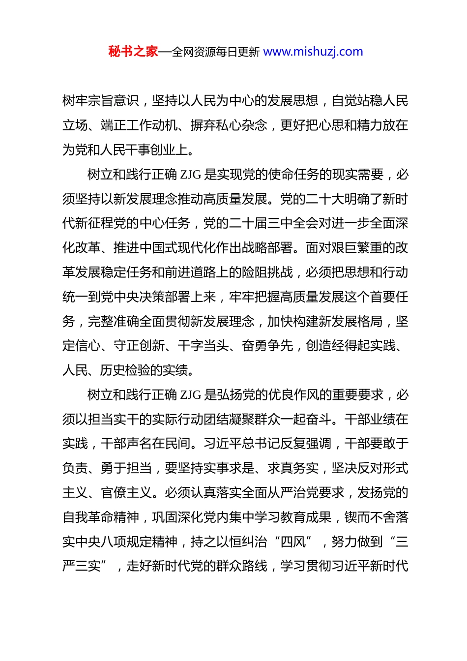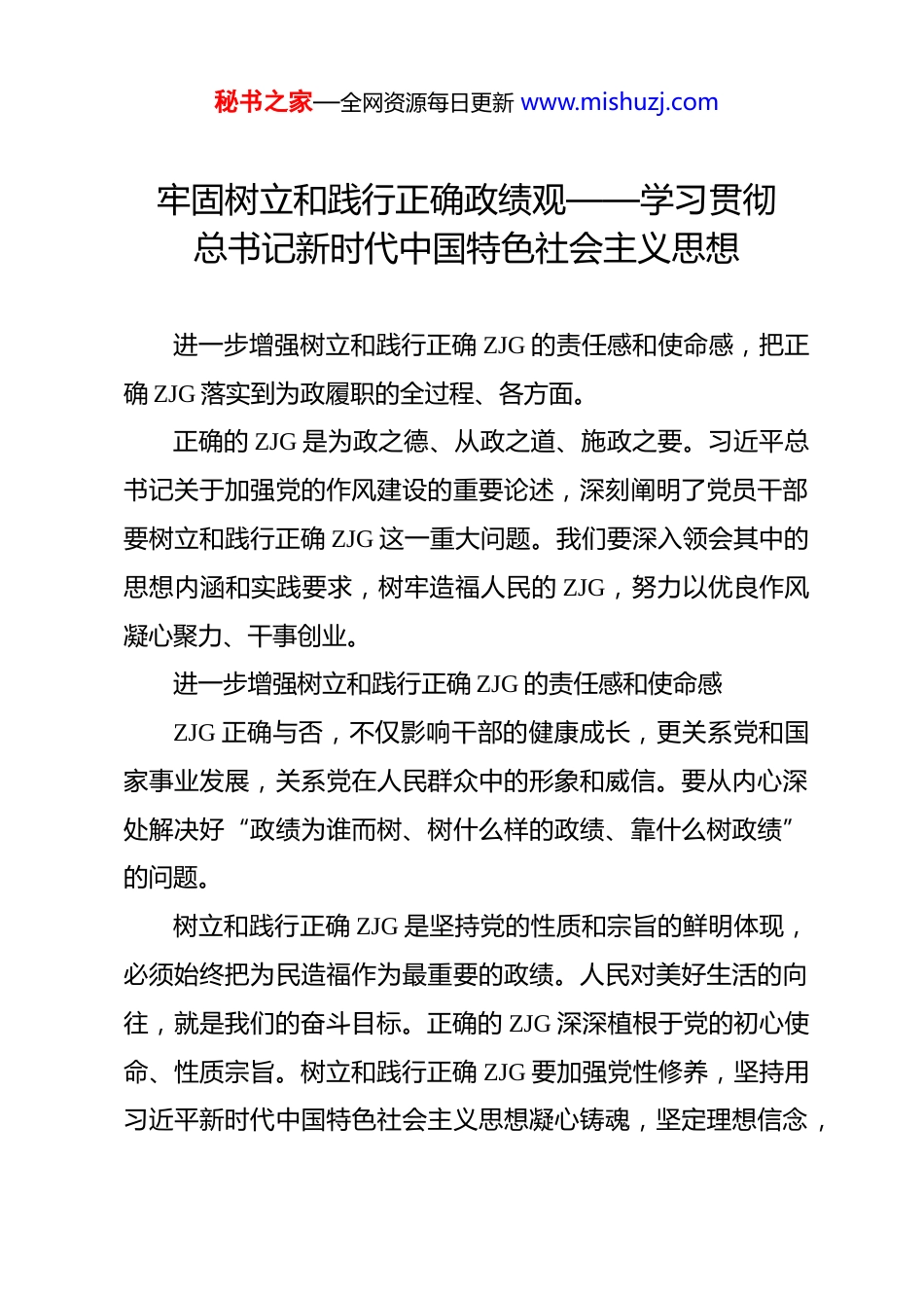 秘书之家—全网资源每日更新 www.mishuzj.com牢固树立和践行正确政绩观——学习贯彻总书记新时代中国特色社会主义思想 进一步增强树立和践行正确 ZJG 的责任感和使命感,把正确 ZJG 落实到为政履职的全过程、各方面。正确的 ZJG 是为政之德、从政之道、施政之要。习近平总书记关于加强党的作风建设的重要论述,深刻阐明了党员干部要树立和践行正确 ZJG 这一重大问题。我们要深入领会其中的思想内涵和实践要求,树牢造福人民的 ZJG,努力以优良作风凝心聚力、干事创业。进一步增强树立和践行正确 ZJG 的责任感和使命感ZJG 正确与否,不仅影响干部的健康成长,更关系党和国家事业发展,关系党在人民群众中的形象和威信。要从内心深处解决好“政绩为谁而树、树什么样的政绩、靠什么树政绩”的问题。树立和践行正确 ZJG 是坚持党的性质和宗旨的鲜明体现,必须始终把为民造福作为最重要的政绩。人民对美好生活的向往,就是我们的奋斗目标。正确的 ZJG 深深植根于党的初心使命、性质宗旨。树立和践行正确 ZJG 要加强党性修养,坚持用习近平新时代中国特色社会主义思想凝心铸魂,坚定理想信念,秘书之家—全网资源每日更新 www.mishuzj.com树牢宗旨意识,坚持以人民为中心的发展思想,自觉站稳人民立场、端正工作动机、摒弃私心杂念,更好把心思和精力放在为党和人民干事创业上。树立和践行正确 ZJG 是实现党的使命任务的现实需要,必须坚持以新发展理念推动高质量发展。党的二十大明确了新时代新征程党的中心任务,党的二十届三中全会对进一步全面深化改革、推进中国式现代化作出战略部署。面对艰巨繁重的改革发展稳定任务和前进道路上的险阻挑战,必须把思想和行动统一到党中央决策部署上来,牢牢把握高质量发展这个首要任务,完整准确全面贯彻新发展理念,加快构建新发展格局,坚定信心、守正创新、干字当头、奋勇争先,创造经得起实践、人民、历史检验的实绩。树立和践行正确 ZJG 是弘扬党的优良作风的重要要求,必须以担当实干的实际行动团结凝聚群众一起奋斗。干部业绩在实践,干部声名在民间。习近平总书记反复强调,干部要敢于负责、勇于担当,要坚持实事求是、求真务实,坚决反对形式主义、官僚主义。必须认真落实全面从严治党要求,发扬党的自我革命精神,巩固深化党内集中学习教育成果,锲而不舍落实中央八项规定精神,持之以恒纠治“四风”,努力做到“三严三实”,走好新时代党的群众路线,学习贯彻习近平新时代秘书之家—全网资源每日更新 www.mishuzj.com中国特色社会主义思想好作风重民意、集民智、聚民力,团结动员群众汇聚起攻坚克难、奋发进取的强大合力。把正确 ZJG 落实到为政履职的全过程、各方面树立和践行正确 ZJG,认识是基础,关键还在于笃行。要胸怀“国之大者”、党之大计,围绕中心、服务大局,立足岗位争先创优,奋力书写不负时代、不负人民的答卷。自觉与党中央精神对标对表。“两个维护”是党的最高政治原则和根本政治规矩,是确保各项事业始终沿着正确政治方向发展的根本保证。树立和践行正确 ZJG,必须深刻领悟“两个确立”的决定性意义,自觉增强“四个意识”、坚定“四个自信”、做到“两个维护”,筑牢政治忠诚,提高政治能力,履职尽责、干好工作。要善于从党的创新理论中悟规律、明方向、学方法、增智慧,做到学思用贯通、知信行统一。认真落实党中央重大决策部署和习近平总书记重要指示批示精神,坚决防止抓落实不用心、不务实、不尽力,搞变通、不到位等问题,坚决防止“低级红”“高级黑”。提升敢担当善作为的素质本领。干部要做到想干事能干事干成事,就要努力使自身能力素质跟上时代步伐、同推进中国式现代化要求相适应。调研了解到,有的干部出现 ZJG 偏差问题,一定程度上也与“不善为”有较大关系,破除思维惯性、秘书之家—全网资源每日更新 www.mishuzj.com行为惰性,还需持续用力。要自觉加强学习,适应新形势新任务新情况,更新思想观念,开阔工作视野,努力成为工作的行家里手。自觉强化实践锻炼,多当几次“热锅上的蚂蚁”,多接几个“烫手山芋”,不断增强推动高质量发展本领、服务群众本领、防...