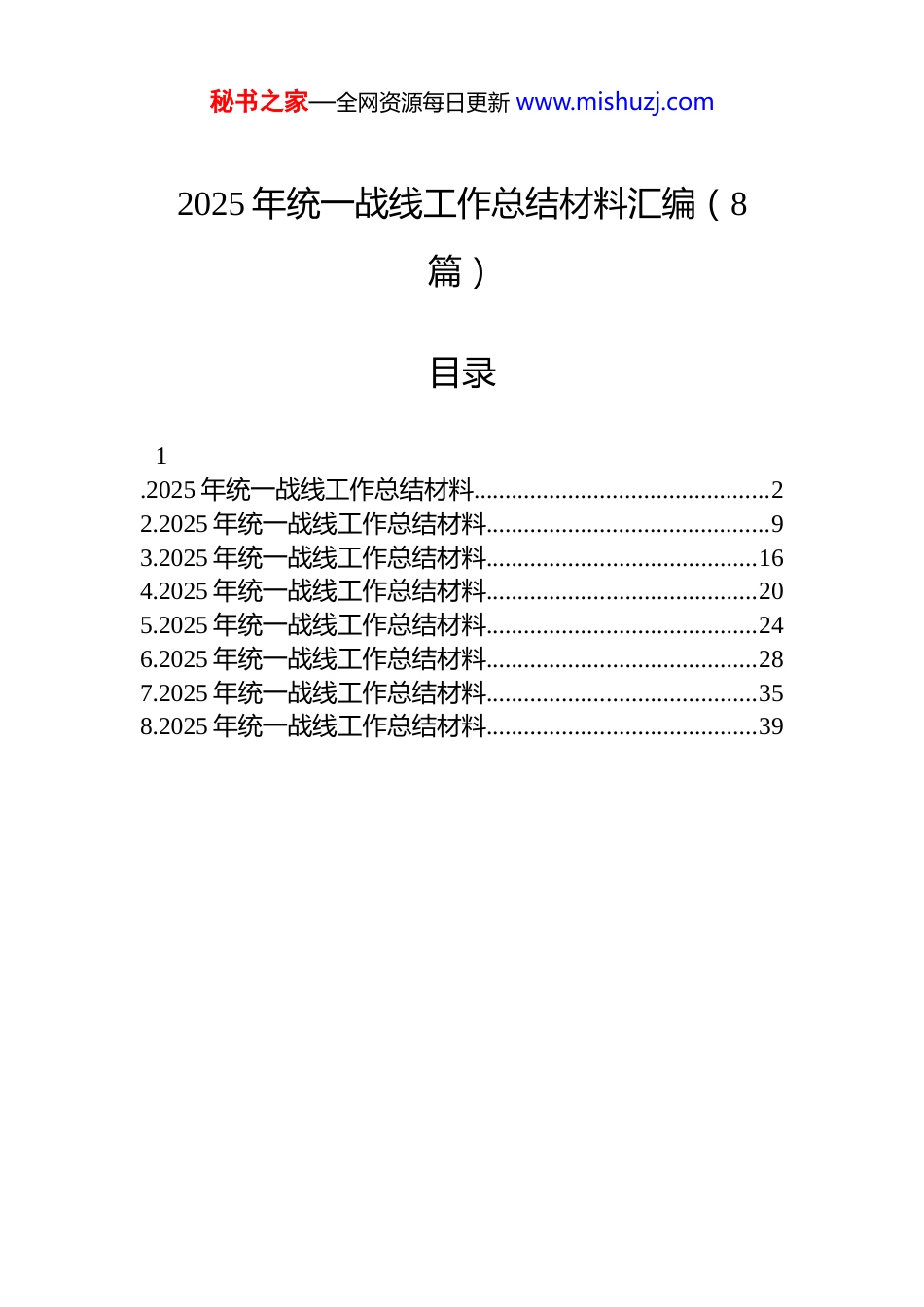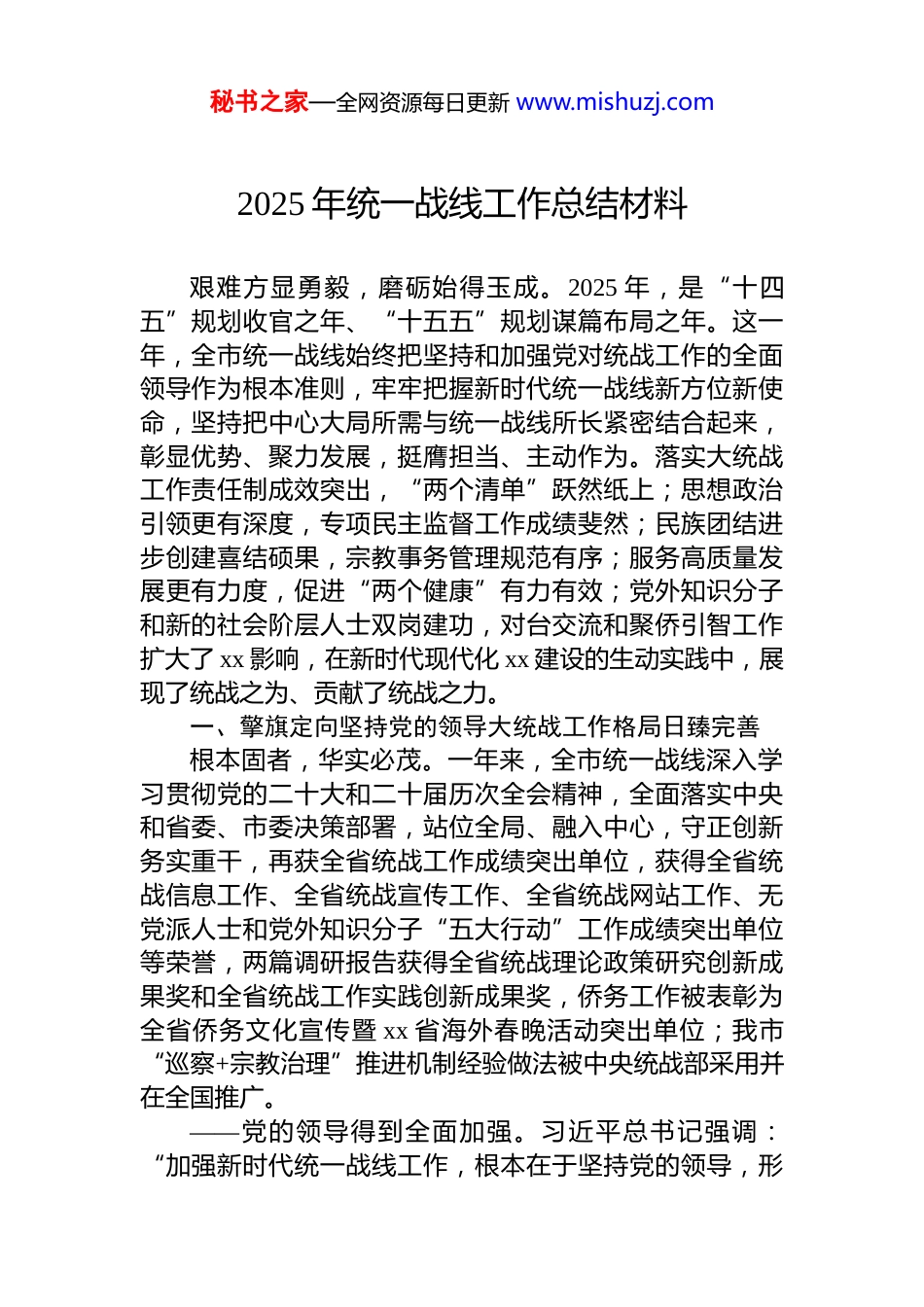 秘书之家—全网资源每日更新 www.mishuzj.com2025 年统一战线工作总结材料汇编(8篇)目录1.2025 年统一战线工作总结材料...............................................22.2025 年统一战线工作总结材料.............................................93.2025 年统一战线工作总结材料...........................................164.2025 年统一战线工作总结材料...........................................205.2025 年统一战线工作总结材料...........................................246.2025 年统一战线工作总结材料...........................................287.2025 年统一战线工作总结材料...........................................358.2025 年统一战线工作总结材料...........................................39秘书之家—全网资源每日更新 www.mishuzj.com2025 年统一战线工作总结材料艰难方显勇毅,磨砺始得玉成。2025 年,是“十四五”规划收官之年、“十五五”规划谋篇布局之年。这一年,全市统一战线始终把坚持和加强党对统战工作的全面领导作为根本准则,牢牢把握新时代统一战线新方位新使命,坚持把中心大局所需与统一战线所长紧密结合起来,彰显优势、聚力发展,挺膺担当、主动作为。落实大统战工作责任制成效突出,“两个清单”跃然纸上;思想政治引领更有深度,专项民主监督工作成绩斐然;民族团结进步创建喜结硕果,宗教事务管理规范有序;服务高质量发展更有力度,促进“两个健康”有力有效;党外知识分子和新的社会阶层人士双岗建功,对台交流和聚侨引智工作扩大了 xx 影响,在新时代现代化 xx 建设的生动实践中,展现了统战之为、贡献了统战之力。一、擎旗定向坚持党的领导大统战工作格局日臻完善根本固者,华实必茂。一年来,全市统一战线深入学习贯彻党的二十大和二十届历次全会精神,全面落实中央和省委、市委决策部署,站位全局、融入中心,守正创新务实重干,再获全省统战工作成绩突出单位,获得全省统战信息工作、全省统战宣传工作、全省统战网站工作、无党派人士和党外知识分子“五大行动”工作成绩突出单位等荣誉,两篇调研报告获得全省统战理论政策研究创新成果奖和全省统战工作实践创新成果奖,侨务工作被表彰为全省侨务文化宣传暨 xx 省海外春晚活动突出单位;我市“巡察+宗教治理”推进机制经验做法被中央统战部采用并在全国推广。——党的领导得到全面加强。习近平总书记强调:“加强新时代统一战线工作,根本在于坚持党的领导,形秘书之家—全网资源每日更新 www.mishuzj.com成全党上下一齐动手、有关方面协同联动的工作局面。”市委坚持强化党对统一战线工作的集中统一领导,牢固树立“党管统战”意识,将统战工作纳入年度工作要点,市委常委会 xx 次研究统战工作,xx 余次作出工作批示,示范带动各级党组织扛牢统战工作主体责任。“四个纳入”工作机制实现了制度化常态化,推动各级各部门党组织增强统战意识、强化统战思维、夯实统战责任,大统战工作格局效能持续提升,“全党共同来做” 的氛围更加浓厚。——牵头协调作用有效发挥。市委统战部积极履行市委统战工作领导小组办公室工作职责,积极探索市委统战工作领导小组与其他议事协调机构“互嵌式”工作机制,领导小组办公室每月分领域召开领导小组成员单位相关会议,在市委党校举办统战理论政策培训班。将统战工作纳入市委党建工作领导小组、深改工作领导小组、营商环境领导小组等市委、市政府议事协调机构工作台账。向成员单位下发目标任务 xx 类 xxx 项,形成了安排部署、督查落实、考核评比闭环管理,推动了统战工作主体责任落实。我市在省委统战工作领导小组经验交流会上作典型发言。——统战责任落实不断增强。制定《中共 xx 市委统战工作责任清单和领导班子成员职责清单》,其中市委责任清单涵盖 x 项 xx 条核心内容,市委领导班子成员职责清单明确 x 项共同职责和 xx 项个性职责。推动市、县两级党委和 xx 家专项协调机制成员单位完成“两张清单”的制定,建立了全链条责任体系。印发领导小组年度工作要点,指导各成员单位制...