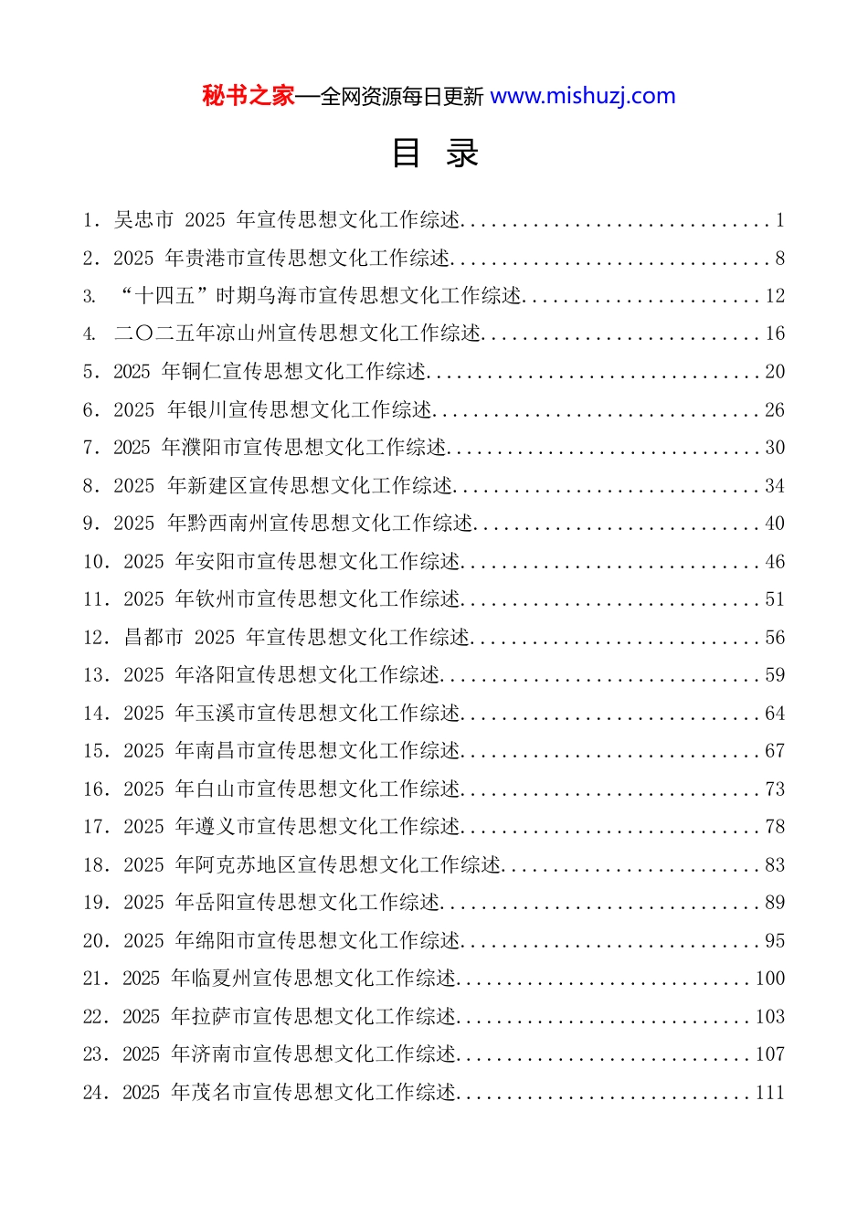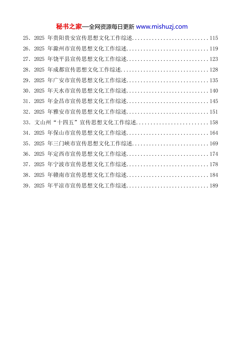 秘书之家—全网资源每日更新 www.mishuzj.com目 录1.吴忠市 2025 年宣传思想文化工作综述..............................1 2.2025 年贵港市宣传思想文化工作综述...............................8 3. “十四五”时期乌海市宣传思想文化工作综述.......................12 4. 二〇二五年凉山州宣传思想文化工作综述...........................16 5.2025 年铜仁宣传思想文化工作综述.................................20 6.2025 年银川宣传思想文化工作综述................................26 7.2025 年濮阳市宣传思想文化工作综述...............................30 8.2025 年新建区宣传思想文化工作综述..............................34 9.2025 年黔西南州宣传思想文化工作综述............................40 10.2025 年安阳市宣传思想文化工作综述.............................46 11.2025 年钦州市宣传思想文化工作综述.............................51 12.昌都市 2025 年宣传思想文化工作综述............................56 13.2025 年洛阳宣传思想文化工作综述...............................59 14.2025 年玉溪市宣传思想文化工作综述.............................64 15.2025 年南昌市宣传思想文化工作综述.............................67 16.2025 年白山市宣传思想文化工作综述.............................73 17.2025 年遵义市宣传思想文化工作综述.............................78 18.2025 年阿克苏地区宣传思想文化工作综述.........................83 19.2025 年岳阳宣传思想文化工作综述...............................89 20.2025 年绵阳市宣传思想文化工作综述.............................95 21.2025 年临夏州宣传思想文化工作综述.............................100 22.2025 年拉萨市宣传思想文化工作综述.............................103 23.2025 年济南市宣传思想文化工作综述.............................107 24.2025 年茂名市宣传思想文化工作综述.............................111 秘书之家—全网资源每日更新 www.mishuzj.com25.2025 年贵阳贵安宣传思想文化工作综述...........................115 26.2025 年滁州市宣传思想文化工作综述.............................119 27.2025 年饶平县宣传思想文化工作综述.............................123 28.2025 年成都宣传思想文化工作综述...............................128 29.2025 年广安市宣传思想文化工作综述.............................135 30.2025 年天水市宣传思想文化工作综述.............................140 31.2025 年金昌市宣传思想文化工作综述.............................145 32.2025 年雅安市宣传思想文化工作综述.............................151 33.文山州“十四五”宣传思想文化工作综述.........................158 34.2025 年保山市宣传思想文化工作综述.............................164 35.2025 年三门峡市宣传思想文化工作综述...........................169 36.2025 年定西市宣传思想文化工作综述.............................174 37.2025 年宁波市宣传思想文化工作综述.............................178 38.2025 年赣南市宣传思想文化工作综述.............................184 39.2025 年平凉市宣传思想文化工作综述.............................189 秘书之家—全网资源每日更新 www.mishuzj.com唱响新时代“黄河大合唱”吴忠市 2025 年宣传思想文化工作综述(2026 年 2 月 4 日)大河奔涌千重浪,山川焕颜绘新卷。山的怀抱和水的臂弯孕育了吴忠独特的人文历史。从涓涓而起至奔腾入海, 滔滔黄河见证着吴忠经济社会高质量发展的历史进程,也见证着全市宣传思想文化战线的精彩实践。回首过去一年,吴忠市的宣传思想文化工作既有宏大的时代主题引领,又有细致入微的实践浸润,齐心奏响了新时代的“黄河大合唱”,恢弘之音声...