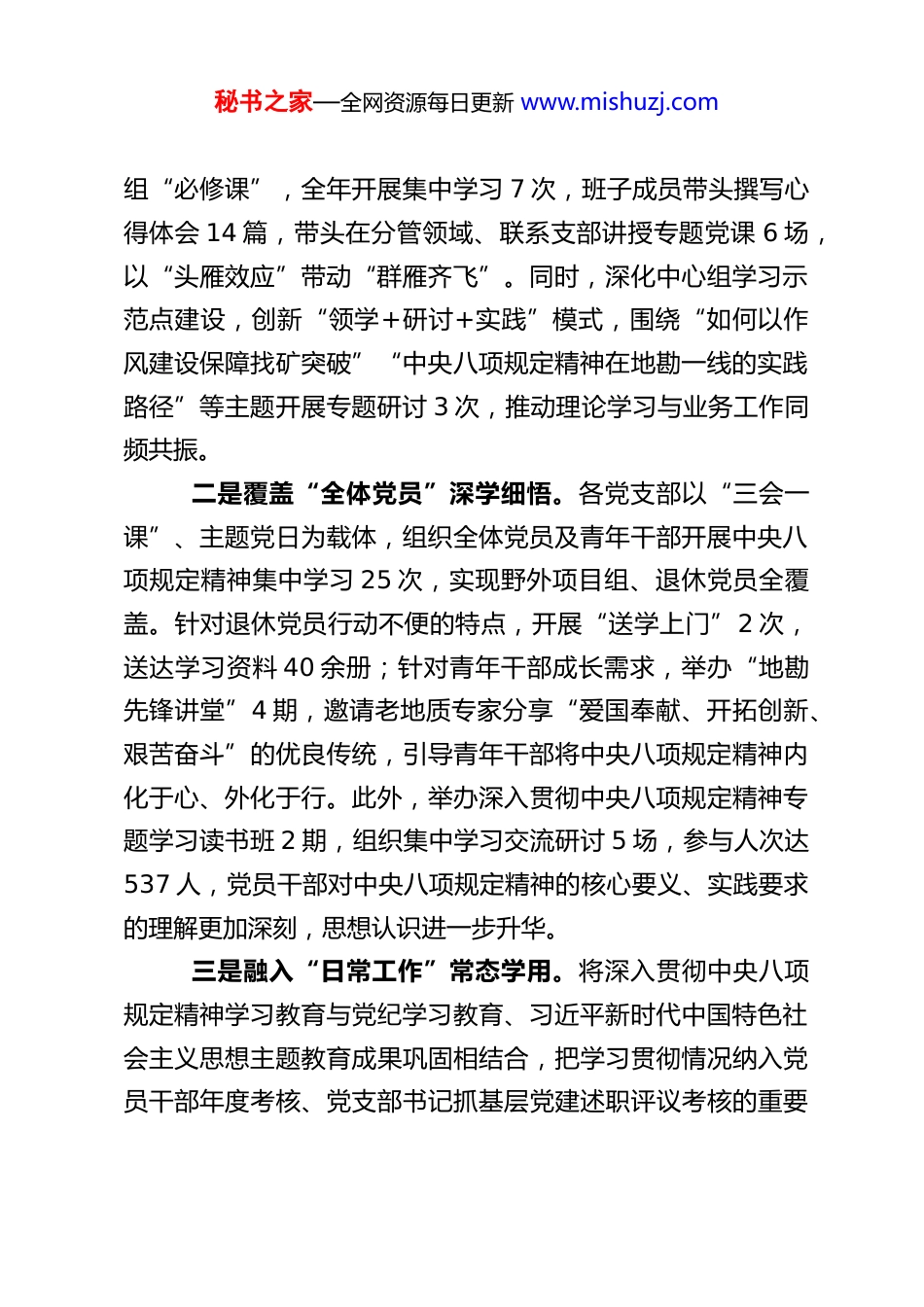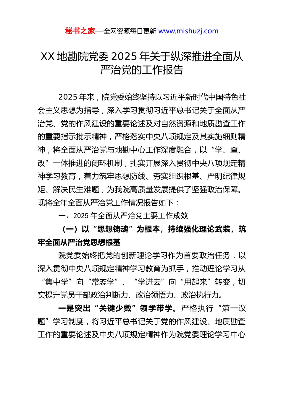 秘书之家—全网资源每日更新 www.mishuzj.comXX 地勘院党委 2025 年关于纵深推进全面从严治党的工作报告2025 年来,院党委始终坚持以习近平新时代中国特色社会主义思想为指导,深入学习贯彻习近平总书记关于全面从严治党、党的作风建设的重要论述及对自然资源和地质勘查工作的重要指示批示精神,严格落实中央八项规定及其实施细则精神,将全面从严治党与地勘中心工作深度融合,以“学、查、改”一体推进的闭环机制,扎实开展深入贯彻中央八项规定精神学习教育,着力筑牢思想防线、夯实组织根基、严明纪律规矩、解决民生难题,为我院高质量发展提供了坚强政治保障。现将全年全面从严治党工作情况报告如下:一、2025 年全面从严治党主要工作成效(一)以“思想铸魂”为根本,持续强化理论武装,筑牢全面从严治党思想根基院党委始终把党的创新理论学习作为首要政治任务,以深入贯彻中央八项规定精神学习教育为抓手,推动理论学习从“集中学”向“常态学”、“学进去”向“用起来”转变,切实提升党员干部政治判断力、政治领悟力、政治执行力。一是突出“关键少数”领学带学。严格执行“第一议题”学习制度,将习近平总书记关于党的作风建设、地质勘查工作的重要论述及中央八项规定精神作为院党委理论学习中心秘书之家—全网资源每日更新 www.mishuzj.com组“必修课”,全年开展集中学习 7 次,班子成员带头撰写心得体会 14 篇,带头在分管领域、联系支部讲授专题党课 6 场,以“头雁效应”带动“群雁齐飞”。同时,深化中心组学习示范点建设,创新“领学+研讨+实践”模式,围绕“如何以作风建设保障找矿突破”“中央八项规定精神在地勘一线的实践路径”等主题开展专题研讨 3 次,推动理论学习与业务工作同频共振。二是覆盖“全体党员”深学细悟。各党支部以“三会一课”、主题党日为载体,组织全体党员及青年干部开展中央八项规定精神集中学习 25 次,实现野外项目组、退休党员全覆盖。针对退休党员行动不便的特点,开展“送学上门”2 次,送达学习资料 40 余册;针对青年干部成长需求,举办“地勘先锋讲堂”4 期,邀请老地质专家分享“爱国奉献、开拓创新、艰苦奋斗”的优良传统,引导青年干部将中央八项规定精神内化于心、外化于行。此外,举办深入贯彻中央八项规定精神专题学习读书班 2 期,组织集中学习交流研讨 5 场,参与人次达537 人,党员干部对中央八项规定精神的核心要义、实践要求的理解更加深刻,思想认识进一步升华。三是融入“日常工作”常态学用。将深入贯彻中央八项规定精神学习教育与党纪学习教育、习近平新时代中国特色社会主义思想主题教育成果巩固相结合,把学习贯彻情况纳入党员干部年度考核、党支部书记抓基层党建述职评议考核的重要秘书之家—全网资源每日更新 www.mishuzj.com内容,倒逼学习走深走实。同时,利用院“地勘先锋号”微信公众号、宣传栏等载体,发布中央八项规定精神解读、作风建设典型案例等内容 23 篇,营造“时时学、处处学”的浓厚氛围,推动贯彻落实中央八项规定精神融入日常、化作经常。(二)以“问题整改”为导向,纵深推进中央八项规定精神落实,破解制约发展短板院党委坚持“学查改”一体推进,以“全方位问诊、清单化管理、闭环式整改”为路径,深入排查中央八项规定精神执行中的堵点难点,切实把问题找实、把根源挖深、把措施定细,确保学习教育取得实效。一是对标对表,全方位排查问题。严格对照中央八项规定学习教育要求,以巡视整改、纪检监察、审计监督等渠道发现的问题为导向,聚焦“两个清单”28 项具体问题及基层“四风”10 种隐形变异表现(如野外项目经费使用不规范、文山会海反弹回潮、服务职工主动性不足等),开展“地毯式”排查。院党委层面共梳理出问题 14 项,其中纳入整改台账 7 项,制定针对性整改措施 27 条;班子成员对照 28 项问题清单,结合分管领域实际,排查出个人及分管部门问题 35 项,纳入整改台账 30 项,制定整改措施 83 条,形成“党委抓总、班子带头、全员参与”的问题排查格局。二是建章立制,系统性整改提升。坚持“当下改”与“长久立”相结合,围绕...