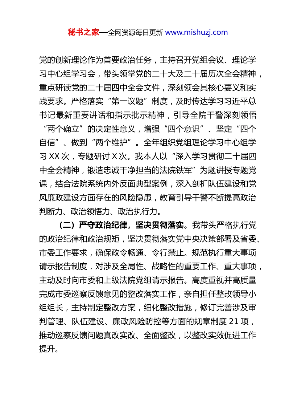 秘书之家—全网资源每日更新 www.mishuzj.comXX 市中级人民法院院长 2025 年度履行党风廉政建设责任制情况报告2025 年,在市委坚强领导和上级法院有力指导下,我作为 XX 市中级人民法院党组书记、院长,始终坚持以习近平新时代中国特色社会主义思想为指导,深入学习贯彻党的二十大和二十届二中、三中、四中全会精神,特别是将党的二十届四中全会关于全面从严治党、推进党的自我革命的重要部署作为根本遵循,紧紧围绕“公正与效率”工作主题,坚决扛起党风廉政建设第一责任人职责,团结带领全院干警,以“审判质效提升年”活动为载体,以严的基调、实的举措,坚定不移推进全面从严管党治院向纵深发展,为法院工作高质量发展提供了坚强的政治保证和纪律保障。现将一年来履行党风廉政建设主体责任情况报告如下:一、强化政治引领,筑牢忠诚根基,确保法院工作正确政治方向党的二十届四中全会对坚持和加强党的全面领导、推进国家治理体系和治理能力现代化作出了战略部署,特别强调要健全全面从严治党体系。我深刻认识到,人民法院首先是政治机关,必须把党的政治建设摆在首位,确保绝对忠诚、绝对纯洁、绝对可靠。(一)坚持理论武装,凝聚思想共识。我始终将学习贯彻秘书之家—全网资源每日更新 www.mishuzj.com党的创新理论作为首要政治任务,主持召开党组会议、理论学习中心组学习会,带头领学党的二十大及二十届历次全会精神,重点研读党的二十届四中全会文件,深刻领会其核心要义和实践要求。严格落实“第一议题”制度,及时传达学习习近平总书记最新重要讲话和指示批示精神,引导全院干警深刻领悟“两个确立”的决定性意义,增强“四个意识”、坚定“四个自信”、做到“两个维护”。全年组织党组理论学习中心组学习 XX 次,专题研讨 X 次。我本人以“深入学习贯彻二十届四中全会精神,锻造忠诚干净担当的法院铁军”为题讲授专题党课,结合法院系统内外反面典型案例,深入剖析队伍建设和党风廉政建设方面存在的风险隐患,教育引导干警不断提高政治判断力、政治领悟力、政治执行力。(二)严守政治纪律,坚决贯彻落实。我带头严格执行党的政治纪律和政治规矩,坚决贯彻落实党中央决策部署及省委、市委工作要求,确保政令畅通、令行禁止。规范执行重大事项请示报告制度,对涉及全局性、战略性的重要工作、重大事项,主动及时向市委和上级法院党组请示报告。高度重视并高质量完成市委巡察反馈意见的整改落实工作,亲自担任整改领导小组组长,主持制定整改方案,细化整改措施,修订完善涉及审判管理、队伍建设、廉政风险防控等方面的规章制度 21 项,推动巡察反馈问题真改实改、全面整改,以整改实效促进工作提升。秘书之家—全网资源每日更新 www.mishuzj.com(三)压实政治责任,健全责任体系。我认真履行第一责任人职责,坚持重要工作亲自部署、重大问题亲自过问、重点环节亲自协调、重要案件亲自督办。年初,主持召开全院党风廉政建设和反腐败工作会议,分析形势,部署任务,审定《XX市中级人民法院 2025 年党风廉政建设和反腐败工作要点》。推动完善全面从严治党责任体系,牵头制定并动态更新院党组主体责任清单、党组书记“第一责任人”责任清单、班子成员“一岗双责”个性清单,形成明责、履责、考责、问责的闭环链条。定期召开党风廉政建设形势分析会,听取班子成员履行“一岗双责”情况汇报,研究解决突出问题,确保压力层层传导、责任环环相扣。二、深化思想教育,严明纪律规矩,夯实拒腐防变思想堤坝我深知,思想“总开关”拧不紧,行为就会出偏差。一年来,我坚持教育在先、预防为主,将纪律教育和廉洁文化建设融入日常、抓在经常,引导干警知敬畏、存戒惧、守底线。(一)扎实开展纪律学习教育。将新修订的《中国共产党纪律处分条例》等党内法规作为学习重点,纳入各支部“三会一课”和主题党日活动内容。组织全院干警观看警示教育片《XX》,学习上级通报的违纪违法典型案例汇编,选取本院或本地区法院系统发生的典型案例进行深入剖析,用身边事教育身边人。组织青年干警旁听职务犯罪案件庭审,开展“以案说秘书之家—全网资源每日更新 www.mishuzj.co...