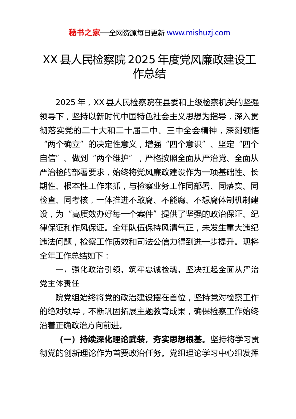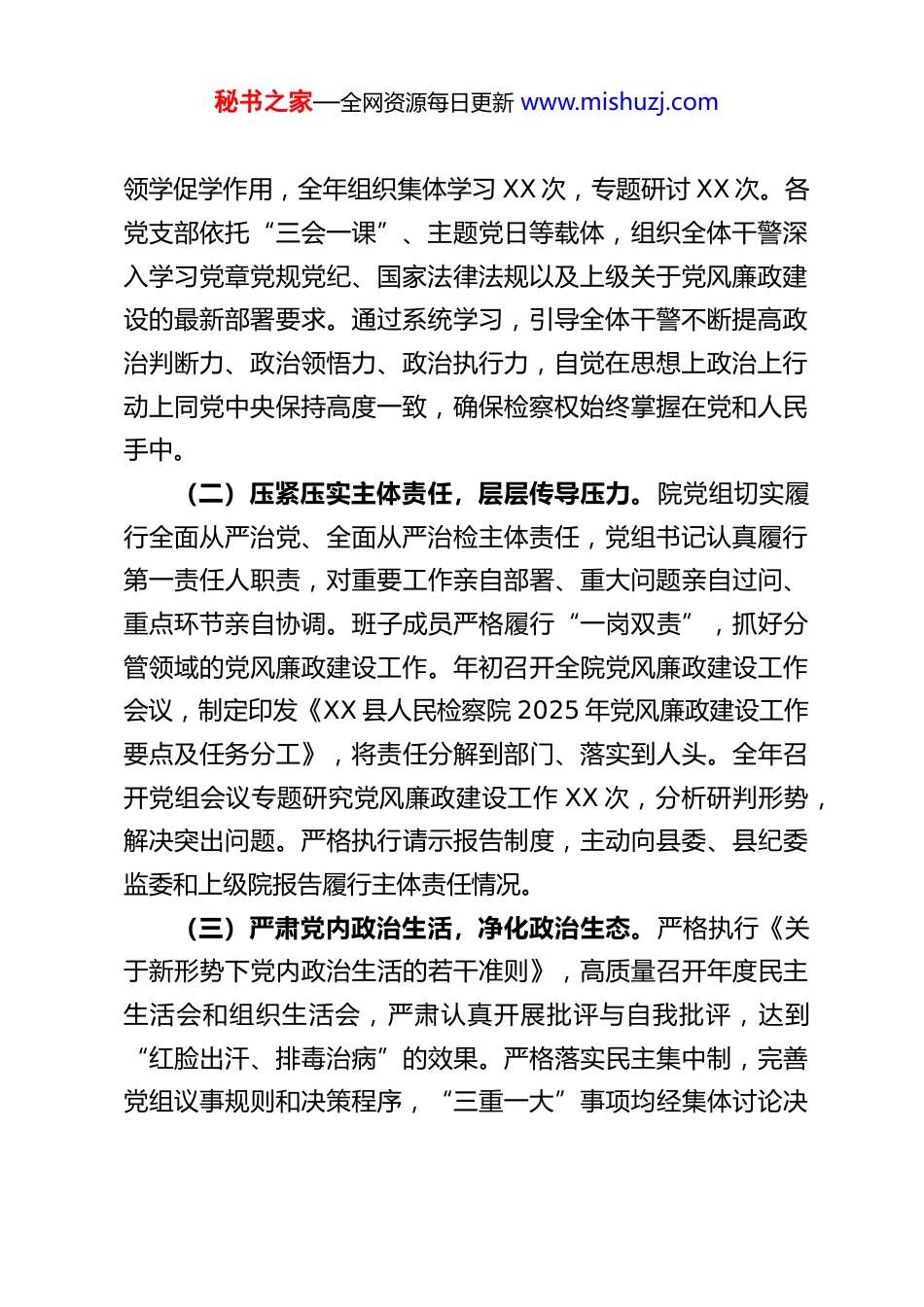 秘书之家—全网资源每日更新 www.mishuzj.comXX 县人民检察院 2025 年度党风廉政建设工作总结2025 年,XX 县人民检察院在县委和上级检察机关的坚强领导下,坚持以新时代中国特色社会主义思想为指导,深入贯彻落实党的二十大和二十届二中、三中全会精神,深刻领悟“两个确立”的决定性意义,增强“四个意识”、坚定“四个自信”、做到“两个维护”,严格按照全面从严治党、全面从严治检的部署要求,始终将党风廉政建设作为一项基础性、长期性、根本性工作来抓,与检察业务工作同部署、同落实、同检查、同考核,一体推进不敢腐、不能腐、不想腐体制机制建设,为“高质效办好每一个案件”提供了坚强的政治保证、纪律保证和作风保证。全年队伍保持风清气正,未发生重大违纪违法问题,检察工作质效和司法公信力得到进一步提升。现将全年工作总结如下:一、强化政治引领,筑牢忠诚检魂,坚决扛起全面从严治党主体责任院党组始终将党的政治建设摆在首位,坚持党对检察工作的绝对领导,不断巩固拓展主题教育成果,确保检察工作始终沿着正确政治方向前进。(一)持续深化理论武装,夯实思想根基。坚持将学习贯彻党的创新理论作为首要政治任务。党组理论学习中心组发挥秘书之家—全网资源每日更新 www.mishuzj.com领学促学作用,全年组织集体学习 XX 次,专题研讨 XX 次。各党支部依托“三会一课”、主题党日等载体,组织全体干警深入学习党章党规党纪、国家法律法规以及上级关于党风廉政建设的最新部署要求。通过系统学习,引导全体干警不断提高政治判断力、政治领悟力、政治执行力,自觉在思想上政治上行动上同党中央保持高度一致,确保检察权始终掌握在党和人民手中。(二)压紧压实主体责任,层层传导压力。院党组切实履行全面从严治党、全面从严治检主体责任,党组书记认真履行第一责任人职责,对重要工作亲自部署、重大问题亲自过问、重点环节亲自协调。班子成员严格履行“一岗双责”,抓好分管领域的党风廉政建设工作。年初召开全院党风廉政建设工作会议,制定印发《XX 县人民检察院 2025 年党风廉政建设工作要点及任务分工》,将责任分解到部门、落实到人头。全年召开党组会议专题研究党风廉政建设工作 XX 次,分析研判形势,解决突出问题。严格执行请示报告制度,主动向县委、县纪委监委和上级院报告履行主体责任情况。(三)严肃党内政治生活,净化政治生态。严格执行《关于新形势下党内政治生活的若干准则》,高质量召开年度民主生活会和组织生活会,严肃认真开展批评与自我批评,达到“红脸出汗、排毒治病”的效果。严格落实民主集中制,完善党组议事规则和决策程序,“三重一大”事项均经集体讨论决秘书之家—全网资源每日更新 www.mishuzj.com定。加强党内政治文化建设,弘扬忠诚老实、公道正派、实事求是、清正廉洁的价值观,营造了山清水秀的政治生态。二、深化警示教育,筑牢思想防线,持续增强拒腐防变免疫力坚持教育在先、预防在先,将警示教育贯穿队伍建设全过程,引导干警知敬畏、存戒惧、守底线。(一)常态化开展纪律教育。将党纪法规学习纳入干警教育培训必修课,通过全院干警大会、部门学习、在线学习平台等多种形式,组织学习《中国共产党纪律处分条例》《中华人民共和国公职人员政务处分法》以及防止干预司法“三个规定”等铁规禁令。组织开展“纪律教育学习月”活动,邀请纪委监委领导、党校教授作专题辅导报告 XX 场,观看警示教育片 XX 部,编印《违纪违法典型案例警示录》XXX 册,用身边事教育身边人,让铁的纪律转化为日常习惯和自觉遵循。(二)精准化实施警示教育。紧盯“关键少数”、重点岗位和年轻干警,分层分类开展警示教育。组织干警旁听职务犯罪案件庭审 XX 次,赴廉政教育基地、监狱等场所开展现场教学 XX 次,让干警“零距离”感受违纪违法的惨痛代价。针对上级通报的检察人员违纪违法典型案例,及时组织传达学习,深入剖析根源,开展大讨论活动,引导干警深刻汲取教训,举一反三,自查自纠。全年累计开展各类警示教育活动 XX 场次,受教育干警 XXX 人次。秘书之家—全网资源每日更新 www.mishuzj.com(三)系统化...