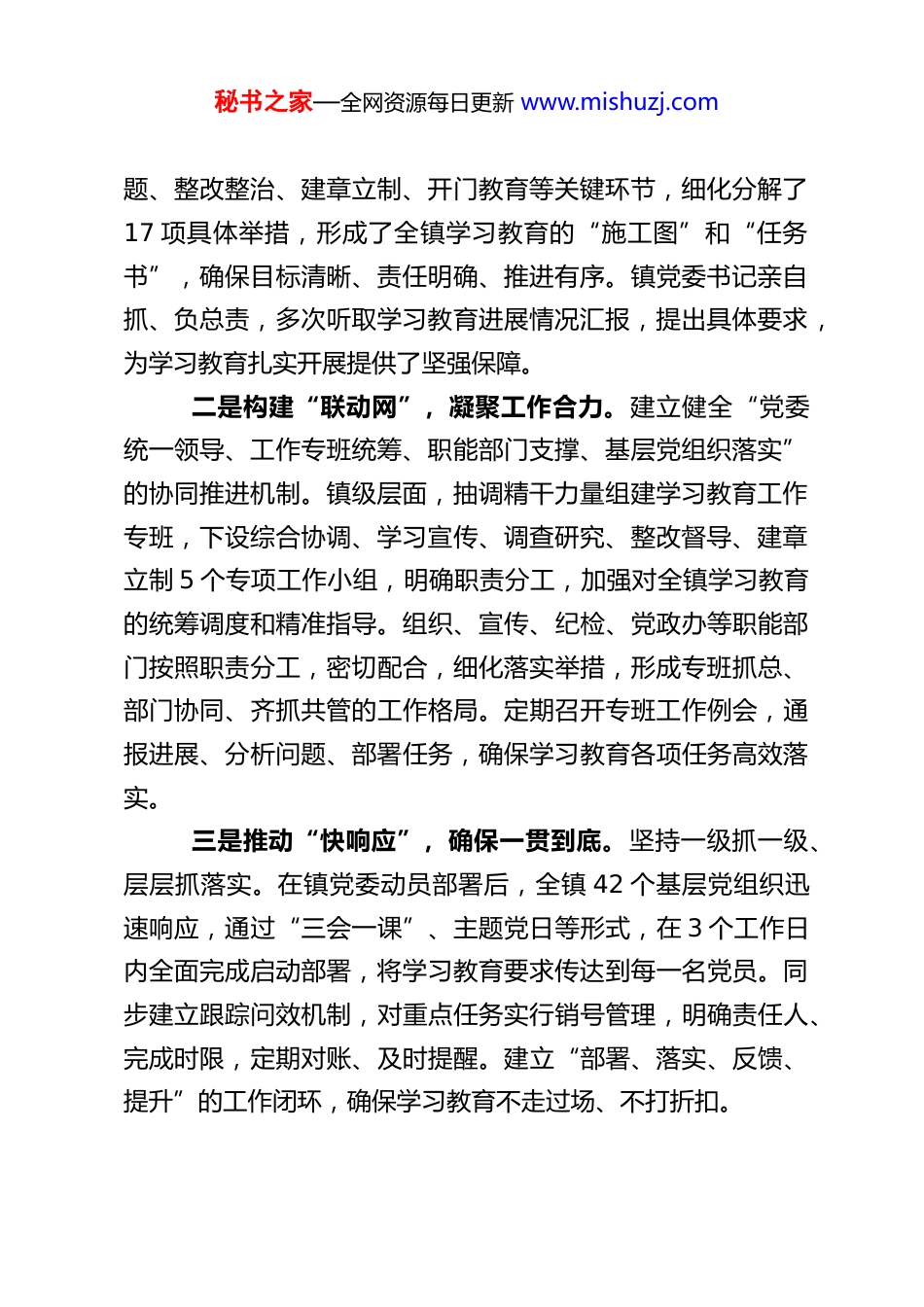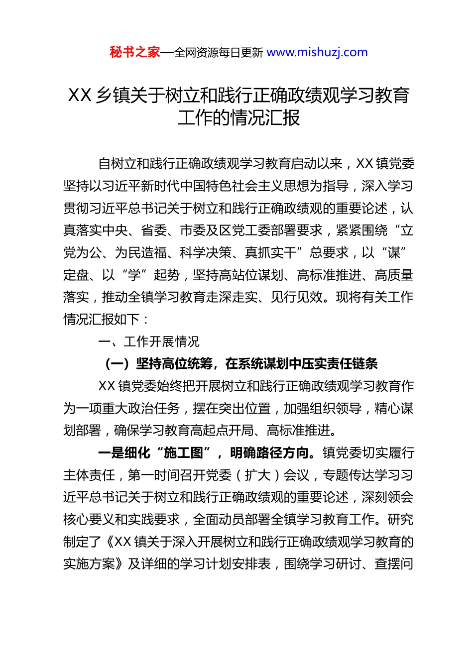 秘书之家—全网资源每日更新 www.mishuzj.comXX 乡镇关于树立和践行正确政绩观学习教育工作的情况汇报自树立和践行正确政绩观学习教育启动以来,XX 镇党委坚持以习近平新时代中国特色社会主义思想为指导,深入学习贯彻习近平总书记关于树立和践行正确政绩观的重要论述,认真落实中央、省委、市委及区党工委部署要求,紧紧围绕“立党为公、为民造福、科学决策、真抓实干”总要求,以“谋”定盘、以“学”起势,坚持高站位谋划、高标准推进、高质量落实,推动全镇学习教育走深走实、见行见效。现将有关工作情况汇报如下:一、工作开展情况(一)坚持高位统筹,在系统谋划中压实责任链条XX 镇党委始终把开展树立和践行正确政绩观学习教育作为一项重大政治任务,摆在突出位置,加强组织领导,精心谋划部署,确保学习教育高起点开局、高标准推进。一是细化“施工图”,明确路径方向。镇党委切实履行主体责任,第一时间召开党委(扩大)会议,专题传达学习习近平总书记关于树立和践行正确政绩观的重要论述,深刻领会核心要义和实践要求,全面动员部署全镇学习教育工作。研究制定了《XX 镇关于深入开展树立和践行正确政绩观学习教育的实施方案》及详细的学习计划安排表,围绕学习研讨、查摆问秘书之家—全网资源每日更新 www.mishuzj.com题、整改整治、建章立制、开门教育等关键环节,细化分解了17 项具体举措,形成了全镇学习教育的“施工图”和“任务书”,确保目标清晰、责任明确、推进有序。镇党委书记亲自抓、负总责,多次听取学习教育进展情况汇报,提出具体要求,为学习教育扎实开展提供了坚强保障。二是构建“联动网”,凝聚工作合力。建立健全“党委统一领导、工作专班统筹、职能部门支撑、基层党组织落实”的协同推进机制。镇级层面,抽调精干力量组建学习教育工作专班,下设综合协调、学习宣传、调查研究、整改督导、建章立制 5 个专项工作小组,明确职责分工,加强对全镇学习教育的统筹调度和精准指导。组织、宣传、纪检、党政办等职能部门按照职责分工,密切配合,细化落实举措,形成专班抓总、部门协同、齐抓共管的工作格局。定期召开专班工作例会,通报进展、分析问题、部署任务,确保学习教育各项任务高效落实。三是推动“快响应”,确保一贯到底。坚持一级抓一级、层层抓落实。在镇党委动员部署后,全镇 42 个基层党组织迅速响应,通过“三会一课”、主题党日等形式,在 3 个工作日内全面完成启动部署,将学习教育要求传达到每一名党员。同步建立跟踪问效机制,对重点任务实行销号管理,明确责任人、完成时限,定期对账、及时提醒。建立“部署、落实、反馈、提升”的工作闭环,确保学习教育不走过场、不打折扣。秘书之家—全网资源每日更新 www.mishuzj.com(二)坚持深学细悟,在分层分类中筑牢思想根基坚持把“学”字贯穿始终,通过头雁带动、分类施策、丰富形式,引导全镇党员干部在深学细悟中筑牢正确政绩观的思想根基。一是领导班子带头学,发挥“头雁效应”。镇党委班子充分发挥“关键少数”的示范引领作用,深化理论学习中心组“1+2+X”学习模式(即 1 次集中研讨、2 次个人自学、X 项实践调研)。坚持先学一步、学深一层,班子成员带头原原本本、逐字逐句学习《习近平关于树立和践行正确政绩观论述摘编》,围绕“政绩为谁树、树什么政绩、靠什么树政绩”等重大问题,结合分管领域工作和个人思想实际,深入开展交流研讨。截至目前,镇党委理论学习中心组已开展专题学习研讨 4次,班子成员撰写心得体会 12 篇,深入基层联系点开展领学促学活动 20 余场次,形成了以上率下、整体联动的良好学习氛围。二是党员干部全覆盖,推动“全域深学”。依托镇级特色学习平台“小美课堂”,先后邀请市委党校专家、区级宣讲团成员,围绕正确政绩观的内涵要求、实践路径及反面典型案例剖析,为全镇党员干部作专题辅导报告 3 场,覆盖党员干部800 余人次。各基层党组织结合实际,创新学习形式,推动学习教育入脑入心。例如,上海 XX 智地企业总部园区党总支针对园区企业多、党员分散的特点,在党群服务中心设立学习教秘书之家—全网资源每日更新 www....