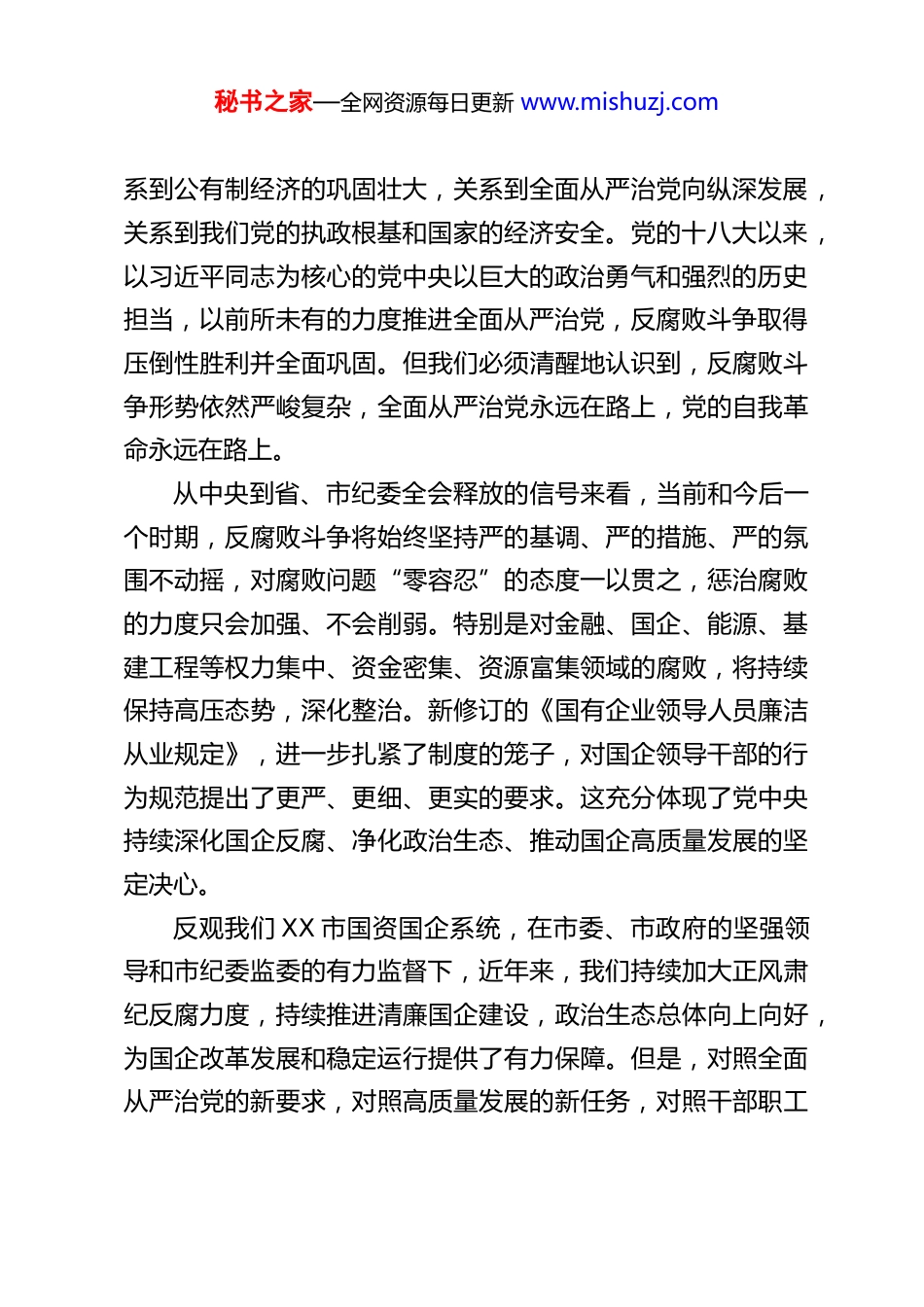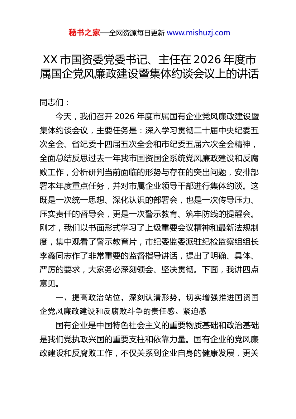 秘书之家—全网资源每日更新 www.mishuzj.comXX 市国资委党委书记、主任在 2026 年度市属国企党风廉政建设暨集体约谈会议上的讲话同志们:今天,我们召开 2026 年度市属国有企业党风廉政建设暨集体约谈会议,主要任务是:深入学习贯彻二十届中央纪委五次全会、省纪委十四届五次全会和市纪委五届六次全会精神,全面总结反思过去一年我市国资国企系统党风廉政建设和反腐败工作,分析研判当前面临的形势与存在的突出问题,安排部署本年度重点任务,并对市属企业领导干部进行集体约谈。这既是一次统一思想、深化认识的部署会,也是一次传导压力、压实责任的督导会,更是一次警示教育、筑牢防线的提醒会。刚才,我们以书面形式学习了上级重要会议精神和最新法规制度,集中观看了警示教育片,市纪委监委派驻纪检监察组组长李鑫同志作了非常重要的监督指导讲话,提出了明确、具体、严厉的要求,大家务必深刻领会、坚决贯彻。下面,我讲四点意见。一、提高政治站位,深刻认清形势,切实增强推进国资国企党风廉政建设和反腐败斗争的责任感、紧迫感国有企业是中国特色社会主义的重要物质基础和政治基础是我们党执政兴国的重要支柱和依靠力量。国有企业的党风廉政建设和反腐败工作,不仅关系到企业自身的健康发展,更关秘书之家—全网资源每日更新 www.mishuzj.com系到公有制经济的巩固壮大,关系到全面从严治党向纵深发展,关系到我们党的执政根基和国家的经济安全。党的十八大以来,以习近平同志为核心的党中央以巨大的政治勇气和强烈的历史担当,以前所未有的力度推进全面从严治党,反腐败斗争取得压倒性胜利并全面巩固。但我们必须清醒地认识到,反腐败斗争形势依然严峻复杂,全面从严治党永远在路上,党的自我革命永远在路上。从中央到省、市纪委全会释放的信号来看,当前和今后一个时期,反腐败斗争将始终坚持严的基调、严的措施、严的氛围不动摇,对腐败问题“零容忍”的态度一以贯之,惩治腐败的力度只会加强、不会削弱。特别是对金融、国企、能源、基建工程等权力集中、资金密集、资源富集领域的腐败,将持续保持高压态势,深化整治。新修订的《国有企业领导人员廉洁从业规定》,进一步扎紧了制度的笼子,对国企领导干部的行为规范提出了更严、更细、更实的要求。这充分体现了党中央持续深化国企反腐、净化政治生态、推动国企高质量发展的坚定决心。反观我们 XX 市国资国企系统,在市委、市政府的坚强领导和市纪委监委的有力监督下,近年来,我们持续加大正风肃纪反腐力度,持续推进清廉国企建设,政治生态总体向上向好,为国企改革发展和稳定运行提供了有力保障。但是,对照全面从严治党的新要求,对照高质量发展的新任务,对照干部职工秘书之家—全网资源每日更新 www.mishuzj.com的新期待,我们的工作还存在不少突出问题和薄弱环节,刚才李鑫组长也点出了一些现象,这里我再着重强调几个方面:一是管党治党责任压力传导存在“上热中温下冷”现象。一些企业党组织落实主体责任的政治自觉、思想自觉、行动自觉还不够强,“第一责任人”责任和“一岗双责”落实不到位,存在“重业务、轻党建”“重发展、轻监管”的倾向。责任传导层层递减,对下属二、三级企业的监督管理和压力传递不够,存在“沙滩流水不到头”的问题。个别领导干部对党风廉政建设工作满足于开会、发文、签责任书,具体指导、监督检查、跟踪问效不够,没有真正把责任扛在肩上、抓在手上。二是制度执行的刚性约束力有待进一步加强。我们制定了不少规章制度,涵盖“三重一大”决策、投资监管、招投标管理、财务管理、选人用人等方面,但有的制度停留在纸上、挂在墙上,执行起来打折扣、搞变通、做选择。比如,“三重一大”决策程序不规范、记录不完整,有的甚至以党政联席会、总经理办公会代替党委会研究重大事项;工程招投标领域围标串标、规避招标、虚假招标等问题仍有发生;物资采购、资产处置等环节存在程序不透明、监管不到位的问题,廉洁风险隐患较大。三是政绩观存在偏差,作风不严不实的问题尚未根除。有的企业领导干部存在急于求成、急功近利的思想,为了追求短期业绩、表面风光,忽视风险防控、合...