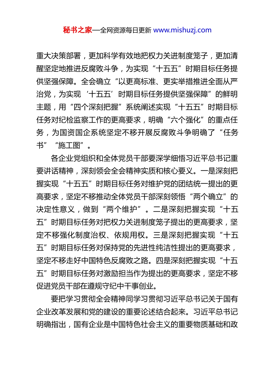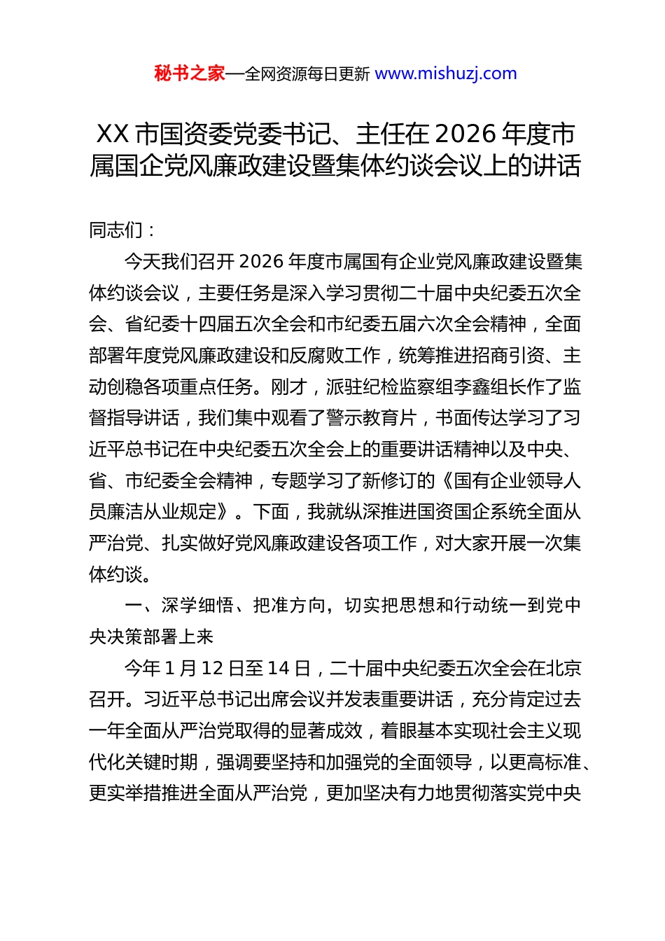 秘书之家—全网资源每日更新 www.mishuzj.comXX 市国资委党委书记、主任在 2026 年度市属国企党风廉政建设暨集体约谈会议上的讲话同志们:今天我们召开 2026 年度市属国有企业党风廉政建设暨集体约谈会议,主要任务是深入学习贯彻二十届中央纪委五次全会、省纪委十四届五次全会和市纪委五届六次全会精神,全面部署年度党风廉政建设和反腐败工作,统筹推进招商引资、主动创稳各项重点任务。刚才,派驻纪检监察组李鑫组长作了监督指导讲话,我们集中观看了警示教育片,书面传达学习了习近平总书记在中央纪委五次全会上的重要讲话精神以及中央、省、市纪委全会精神,专题学习了新修订的《国有企业领导人员廉洁从业规定》。下面,我就纵深推进国资国企系统全面从严治党、扎实做好党风廉政建设各项工作,对大家开展一次集体约谈。一、深学细悟、把准方向,切实把思想和行动统一到党中央决策部署上来今年 1 月 12 日至 14 日,二十届中央纪委五次全会在北京召开。习近平总书记出席会议并发表重要讲话,充分肯定过去一年全面从严治党取得的显著成效,着眼基本实现社会主义现代化关键时期,强调要坚持和加强党的全面领导,以更高标准、更实举措推进全面从严治党,更加坚决有力地贯彻落实党中央秘书之家—全网资源每日更新 www.mishuzj.com重大决策部署,更加科学有效地把权力关进制度笼子,更加清醒坚定地推进反腐败斗争,为实现“十五五”时期目标任务提供坚强保障。全会确立“以更高标准、更实举措推进全面从严治党,为实现‘十五五’时期目标任务提供坚强保障”的鲜明主题,用“四个深刻把握”系统阐述实现“十五五”时期目标任务对纪检监察工作的更高要求,明确“六个强化”的重点任务,为国资国企系统坚定不移开展反腐败斗争明确了“任务书”“施工图”。各企业党组织和全体党员干部要深学细悟习近平总书记重要讲话精神,深刻领会全会精神实质和核心要义。一是深刻把握实现“十五五”时期目标任务对维护党的团结统一提出的更高要求,坚定不移推动全体党员干部深刻领悟“两个确立”的决定性意义,做到“两个维护”。二是深刻把握实现“十五五”时期目标任务对把权力关进制度笼子提出的更高要求,坚定不移强化制度治权、依规用权。三是深刻把握实现“十五五”时期目标任务对保持党的先进性纯洁性提出的更高要求,坚定不移走好中国特色反腐败之路。四是深刻把握实现“十五五”时期目标任务对激励担当作为提出的更高要求,坚定不移促进党员干部在遵规守纪中干事创业。要把学习贯彻全会精神同学习贯彻习近平总书记关于国有企业改革发展和党的建设的重要论述结合起来。习近平总书记明确指出,国有企业是中国特色社会主义的重要物质基础和政秘书之家—全网资源每日更新 www.mishuzj.com治基础,坚持党的领导、加强党的建设是国有企业的“根”和“魂”,是我国国有企业的独特优势。市属国企必须始终牢记这一根本定位,把党的领导贯穿于企业改革发展全过程各方面,以全面从严治党新成效保障“十五五”良好开局。二、肯定成绩、正视问题,始终保持全面从严治党永远在路上的清醒坚定过去一年,在市委、市政府的坚强领导下,在市纪委监委的有力指导下,市国资国企系统深入贯彻全面从严治党战略方针,扎实开展中央八项规定精神学习教育,持续深化党风廉政建设和反腐败斗争,取得了积极成效。政治建设持续加强,各企业党组织严格落实“第一议题”制度,深化理论武装,政治判断力、政治领悟力、政治执行力有效提升。纪律作风持续向好,风清气正的政治生态不断巩固。腐败治理持续深入,一体推进不敢腐、不能腐、不想腐,企业治理效能有效提升。在肯定成绩的同时,我们必须清醒地看到,当前市属国企管党治党领域仍然存在一些突出问题,不容回避、不容忽视。一是管党治党责任传导层层递减,“上热中温下冷”的现象依然存在。一些企业党组织书记抓全面从严治党“第一责任人”意识不强,重业务轻党建,把全面从严治党当作“软任务”,存在“说起来重要、做起来次要、忙起来不要”的问题。一些班子成员履行“一岗双责”不到位,对分管领域的党风廉政建设抓得不紧不实。全面从严治党是一项系统...