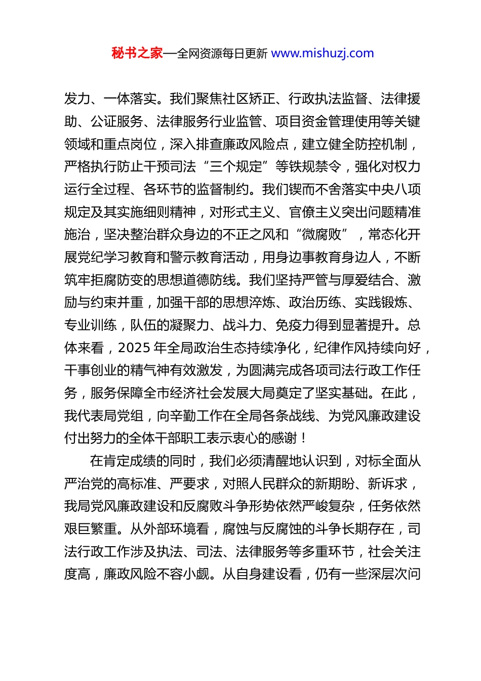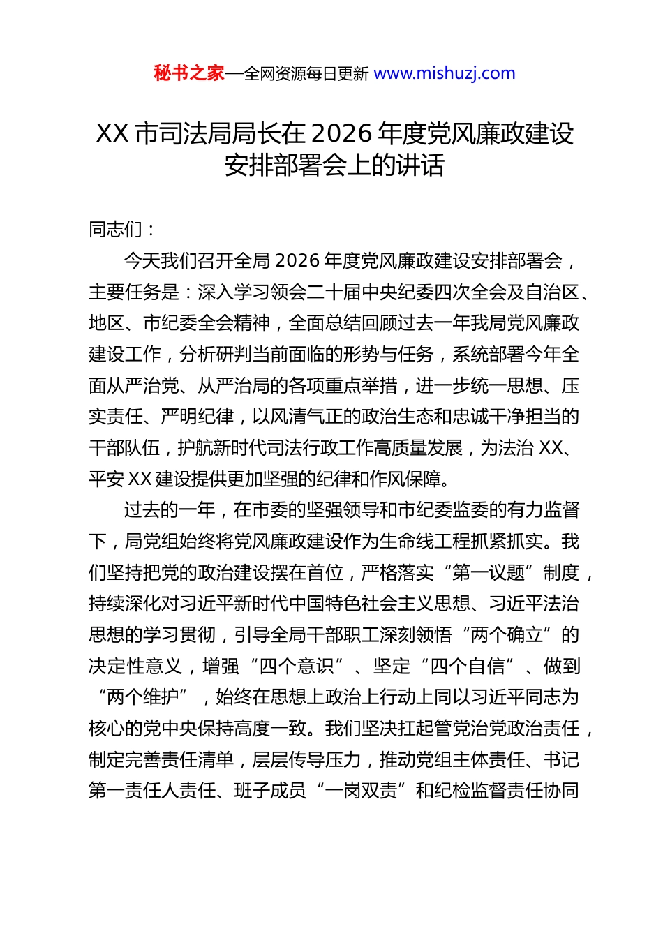 秘书之家—全网资源每日更新 www.mishuzj.comXX 市司法局局长在 2026 年度党风廉政建设安排部署会上的讲话同志们:今天我们召开全局 2026 年度党风廉政建设安排部署会,主要任务是:深入学习领会二十届中央纪委四次全会及自治区、地区、市纪委全会精神,全面总结回顾过去一年我局党风廉政建设工作,分析研判当前面临的形势与任务,系统部署今年全面从严治党、从严治局的各项重点举措,进一步统一思想、压实责任、严明纪律,以风清气正的政治生态和忠诚干净担当的干部队伍,护航新时代司法行政工作高质量发展,为法治 XX、平安 XX 建设提供更加坚强的纪律和作风保障。过去的一年,在市委的坚强领导和市纪委监委的有力监督下,局党组始终将党风廉政建设作为生命线工程抓紧抓实。我们坚持把党的政治建设摆在首位,严格落实“第一议题”制度,持续深化对习近平新时代中国特色社会主义思想、习近平法治思想的学习贯彻,引导全局干部职工深刻领悟“两个确立”的决定性意义,增强“四个意识”、坚定“四个自信”、做到“两个维护”,始终在思想上政治上行动上同以习近平同志为核心的党中央保持高度一致。我们坚决扛起管党治党政治责任,制定完善责任清单,层层传导压力,推动党组主体责任、书记第一责任人责任、班子成员“一岗双责”和纪检监督责任协同秘书之家—全网资源每日更新 www.mishuzj.com发力、一体落实。我们聚焦社区矫正、行政执法监督、法律援助、公证服务、法律服务行业监管、项目资金管理使用等关键领域和重点岗位,深入排查廉政风险点,建立健全防控机制,严格执行防止干预司法“三个规定”等铁规禁令,强化对权力运行全过程、各环节的监督制约。我们锲而不舍落实中央八项规定及其实施细则精神,对形式主义、官僚主义突出问题精准施治,坚决整治群众身边的不正之风和“微腐败”,常态化开展党纪学习教育和警示教育活动,用身边事教育身边人,不断筑牢拒腐防变的思想道德防线。我们坚持严管与厚爱结合、激励与约束并重,加强干部的思想淬炼、政治历练、实践锻炼、专业训练,队伍的凝聚力、战斗力、免疫力得到显著提升。总体来看,2025 年全局政治生态持续净化,纪律作风持续向好,干事创业的精气神有效激发,为圆满完成各项司法行政工作任务,服务保障全市经济社会发展大局奠定了坚实基础。在此,我代表局党组,向辛勤工作在全局各条战线、为党风廉政建设付出努力的全体干部职工表示衷心的感谢!在肯定成绩的同时,我们必须清醒地认识到,对标全面从严治党的高标准、严要求,对照人民群众的新期盼、新诉求,我局党风廉政建设和反腐败斗争形势依然严峻复杂,任务依然艰巨繁重。从外部环境看,腐蚀与反腐蚀的斗争长期存在,司法行政工作涉及执法、司法、法律服务等多重环节,社会关注度高,廉政风险不容小觑。从自身建设看,仍有一些深层次问秘书之家—全网资源每日更新 www.mishuzj.com题需要破解:一是管党治党责任压力传导存在“上热中温下冷”现象,个别基层单位、业务科室对党风廉政建设重视程度、落实力度仍需加强;二是重点领域、关键环节的廉政风险防控体系还不够精密,制度的“笼子”扎得还不够紧、不够牢,个别干部对纪律规矩的敬畏之心还需进一步强化;三是“四风”问题具有顽固性、反复性,形式主义、官僚主义的新变种、新表现仍需警惕,服务群众“最后一公里”的梗阻问题时有反映;四是廉政教育的针对性、实效性有待提升,廉洁文化的浸润滋养作用发挥还不够充分。对于这些问题,我们必须高度重视,采取有力措施,切实加以解决。2026 年是“十五五”规划的开局起步之年。新征程、新使命,对司法行政机关的自身建设提出了新的更高要求。抓好今年的党风廉政建设工作,意义尤为特殊,责任尤为重大。全局上下必须进一步提高政治站位,深刻认识党风廉政建设和反腐败斗争的长期性、复杂性、艰巨性,切实把思想和行动统一到中央、自治区、地区和市委的决策部署上来,始终保持“永远在路上”的清醒和坚定,以更高的标准、更严的要求、更实的作风,推动我局全面从严治党、党风廉政建设和反腐败斗争向纵深发展,为谱写中国式现代化 XX 实践的法治新篇章提供...