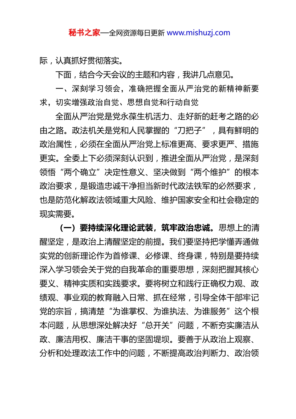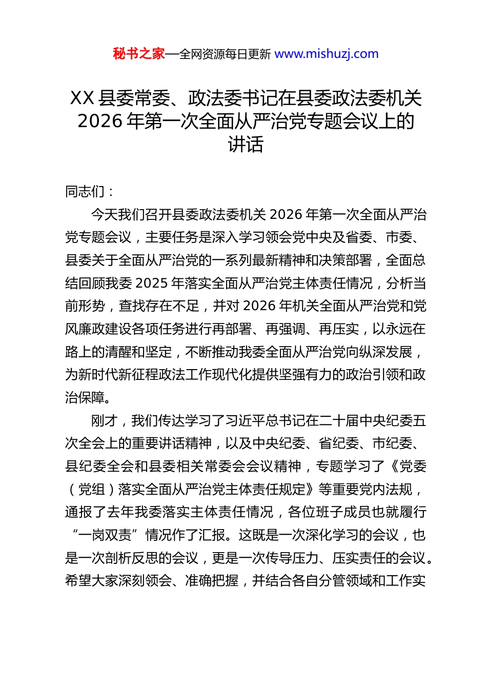 秘书之家—全网资源每日更新 www.mishuzj.comXX 县委常委、政法委书记在县委政法委机关2026 年第一次全面从严治党专题会议上的讲话同志们:今天我们召开县委政法委机关 2026 年第一次全面从严治党专题会议,主要任务是深入学习领会党中央及省委、市委、县委关于全面从严治党的一系列最新精神和决策部署,全面总结回顾我委 2025 年落实全面从严治党主体责任情况,分析当前形势,查找存在不足,并对 2026 年机关全面从严治党和党风廉政建设各项任务进行再部署、再强调、再压实,以永远在路上的清醒和坚定,不断推动我委全面从严治党向纵深发展,为新时代新征程政法工作现代化提供坚强有力的政治引领和政治保障。刚才,我们传达学习了习近平总书记在二十届中央纪委五次全会上的重要讲话精神,以及中央纪委、省纪委、市纪委、县纪委全会和县委相关常委会会议精神,专题学习了《党委(党组)落实全面从严治党主体责任规定》等重要党内法规,通报了去年我委落实主体责任情况,各位班子成员也就履行“一岗双责”情况作了汇报。这既是一次深化学习的会议,也是一次剖析反思的会议,更是一次传导压力、压实责任的会议。希望大家深刻领会、准确把握,并结合各自分管领域和工作实秘书之家—全网资源每日更新 www.mishuzj.com际,认真抓好贯彻落实。下面,结合今天会议的主题和内容,我讲几点意见。一、深刻学习领会,准确把握全面从严治党的新精神新要求,切实增强政治自觉、思想自觉和行动自觉全面从严治党是党永葆生机活力、走好新的赶考之路的必由之路。政法机关是党和人民掌握的“刀把子”,具有鲜明的政治属性,必须在全面从严治党上标准更高、要求更严、措施更实。全委上下必须深刻认识到,推进全面从严治党,是深刻领悟“两个确立”决定性意义、坚决做到“两个维护”的根本政治要求,是锻造忠诚干净担当新时代政法铁军的必然要求,也是防范化解政法领域重大风险、维护国家安全和社会稳定的现实需要。(一)要持续深化理论武装,筑牢政治忠诚。思想上的清醒坚定,是政治上清醒坚定的前提。我们要坚持把学懂弄通做实党的创新理论作为首修课、必修课、终身课,特别是要持续深入学习领会关于党的自我革命的重要思想,深刻把握其核心要义、精神实质和实践要求。要将树立和践行正确权力观、政绩观、事业观的教育融入日常、抓在经常,引导全体干部牢记党的宗旨,搞清楚“为谁掌权、为谁执法、为谁服务”这个根本问题,从思想深处解决好“总开关”问题,不断夯实廉洁从政、廉洁用权、廉洁干事的坚固堤坝。要善于从政治上观察、分析和处理政法工作中的问题,不断提高政治判断力、政治领秘书之家—全网资源每日更新 www.mishuzj.com悟力、政治执行力,确保政法工作始终沿着正确政治方向前进。(二)要精准把握形势任务,保持战略定力。中央纪委五次全会用“九个以”的实践要求,对持续发力、纵深推进反腐败斗争作出战略部署,省、市、县各级全会也提出了明确具体的落实要求。这释放出全面从严治党越来越严、一严到底的强烈信号。我们必须清醒认识到,反腐败斗争形势依然严峻复杂,腐败滋生的土壤和条件尚未彻底根除。政法机关权力集中、自由裁量权大,面临的腐蚀与反腐蚀考验更加直接、更加尖锐。特别是当前,我们正处于推进政法工作现代化的关键时期,改革发展稳定任务艰巨繁重,越是任务重、挑战多,越要绷紧全面从严治党这根弦。全委同志特别是领导干部,务必克服“松劲歇脚”、“疲劳厌战”的情绪,时刻保持“赶考”的清醒和坚定,把严的基调、严的措施、严的氛围长期坚持下去。(三)要自觉尊崇制度规章,规范权力运行。制度治党、依规治党,是全面从严治党的长远之策、根本之策。会上我们再次学习了《党委(党组)落实全面从严治党主体责任规定》等党内法规,这些都是我们履职尽责的基本依据和重要遵循。班子成员要带头学习、带头遵守、带头执行,自觉在制度框架下行使权力、开展工作。要进一步健全完善政法委机关内部的权力运行制约和监督机制,紧盯政策制定、决策程序、审批监管、执法司法协调监督等关键环节,明晰权力边界,规范工作流程,压缩自由裁量空间,确保每一项权力...