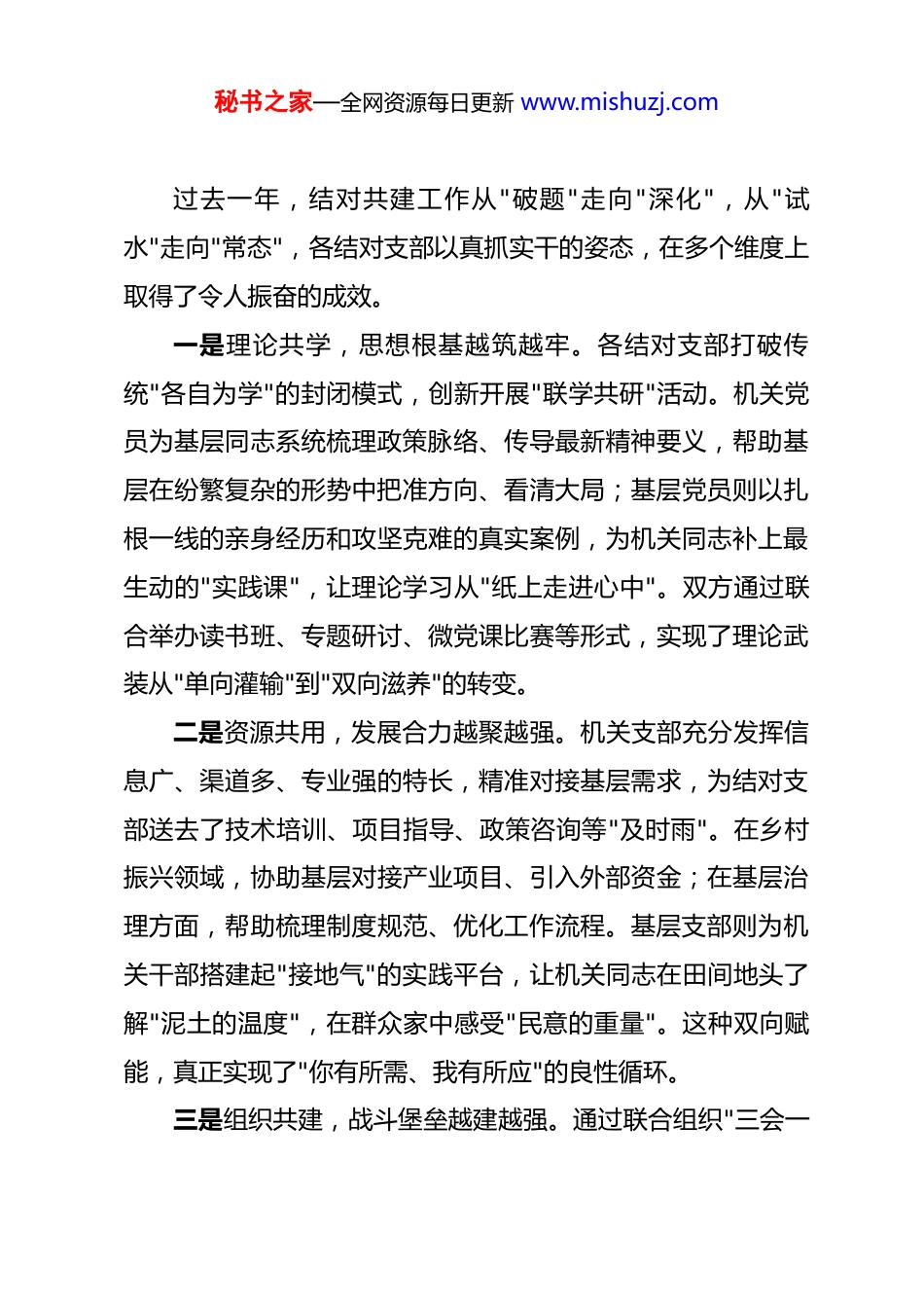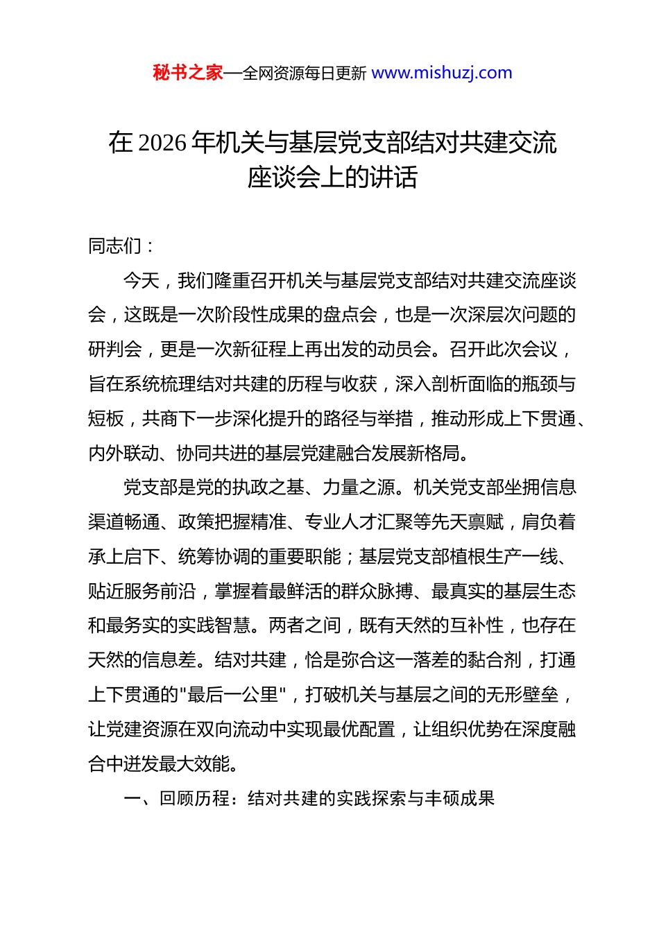 秘书之家—全网资源每日更新 www.mishuzj.com在 2026 年机关与基层党支部结对共建交流座谈会上的讲话 同志们:今天,我们隆重召开机关与基层党支部结对共建交流座谈会,这既是一次阶段性成果的盘点会,也是一次深层次问题的研判会,更是一次新征程上再出发的动员会。召开此次会议,旨在系统梳理结对共建的历程与收获,深入剖析面临的瓶颈与短板,共商下一步深化提升的路径与举措,推动形成上下贯通、内外联动、协同共进的基层党建融合发展新格局。党支部是党的执政之基、力量之源。机关党支部坐拥信息渠道畅通、政策把握精准、专业人才汇聚等先天禀赋,肩负着承上启下、统筹协调的重要职能;基层党支部植根生产一线、贴近服务前沿,掌握着最鲜活的群众脉搏、最真实的基层生态和最务实的实践智慧。两者之间,既有天然的互补性,也存在天然的信息差。结对共建,恰是弥合这一落差的黏合剂,打通上下贯通的"最后一公里",打破机关与基层之间的无形壁垒,让党建资源在双向流动中实现最优配置,让组织优势在深度融合中迸发最大效能。一、回顾历程:结对共建的实践探索与丰硕成果秘书之家—全网资源每日更新 www.mishuzj.com过去一年,结对共建工作从"破题"走向"深化",从"试水"走向"常态",各结对支部以真抓实干的姿态,在多个维度上取得了令人振奋的成效。一是理论共学,思想根基越筑越牢。各结对支部打破传统"各自为学"的封闭模式,创新开展"联学共研"活动。机关党员为基层同志系统梳理政策脉络、传导最新精神要义,帮助基层在纷繁复杂的形势中把准方向、看清大局;基层党员则以扎根一线的亲身经历和攻坚克难的真实案例,为机关同志补上最生动的"实践课",让理论学习从"纸上走进心中"。双方通过联合举办读书班、专题研讨、微党课比赛等形式,实现了理论武装从"单向灌输"到"双向滋养"的转变。二是资源共用,发展合力越聚越强。机关支部充分发挥信息广、渠道多、专业强的特长,精准对接基层需求,为结对支部送去了技术培训、项目指导、政策咨询等"及时雨"。在乡村振兴领域,协助基层对接产业项目、引入外部资金;在基层治理方面,帮助梳理制度规范、优化工作流程。基层支部则为机关干部搭建起"接地气"的实践平台,让机关同志在田间地头了解"泥土的温度",在群众家中感受"民意的重量"。这种双向赋能,真正实现了"你有所需、我有所应"的良性循环。三是组织共建,战斗堡垒越建越强。通过联合组织"三会一秘书之家—全网资源每日更新 www.mishuzj.com课"、互派党员交叉参加组织生活、共建"党员先锋岗"等举措,有效打破了组织间的"隐形围墙"。机关支部标准化、规范化的工作范式,带动了基层组织生活质量的整体跃升;基层支部灵活机动、务实管用的工作打法,也倒逼机关干部走出"舒适区",在解决实际问题中锤炼过硬本领。组织生活的"含金量"明显提升,党员的归属感、荣誉感显著增强。四是难题共解,服务质效越做越优。各结对支部聚焦群众急难愁盼,组建联合服务队,共同开展"我为群众办实事"专项行动。从老旧小区改造到农村人居环境整治,从优化办事流程到帮扶困难群众,一批群众反映强烈的具体问题得到了实质性解决。群众普遍反映:"机关干部不再坐在办公室里发文件了,而是和基层同志一起跑腿办事了。"这种变化,正是结对共建最直接、最有说服力的成效。五是发展共推,中心工作越抓越实。围绕高质量发展这一首要任务,结对支部联合组建攻坚专班,共同研判经济形势、共商产业布局、共破发展瓶颈。无论是推进重点项目建设、优化营商环境,还是培育新兴业态、促进就业增收,都展现了"握指成拳"的聚合效应。事实证明,结对共建不是额外负担,而是推动中心工作的"加速器"和"倍增器"。二、直面问题:当前结对共建的短板与深层思考秘书之家—全网资源每日更新 www.mishuzj.com成绩值得肯定,但问题同样不容回避。对照高质量共建的要求,我们仍需在以下几个方面深入反思、切实改进。一是部分结对"重形式、轻内涵"。少数结对组满足于"签协议、挂牌子、拍照片",活动浮于表面,缺乏实质性的内容支撑和持续性的机制保障。有的联合活动"一阵风",热热闹闹开场、冷冷清清收场,没有形成长流水、不断线...