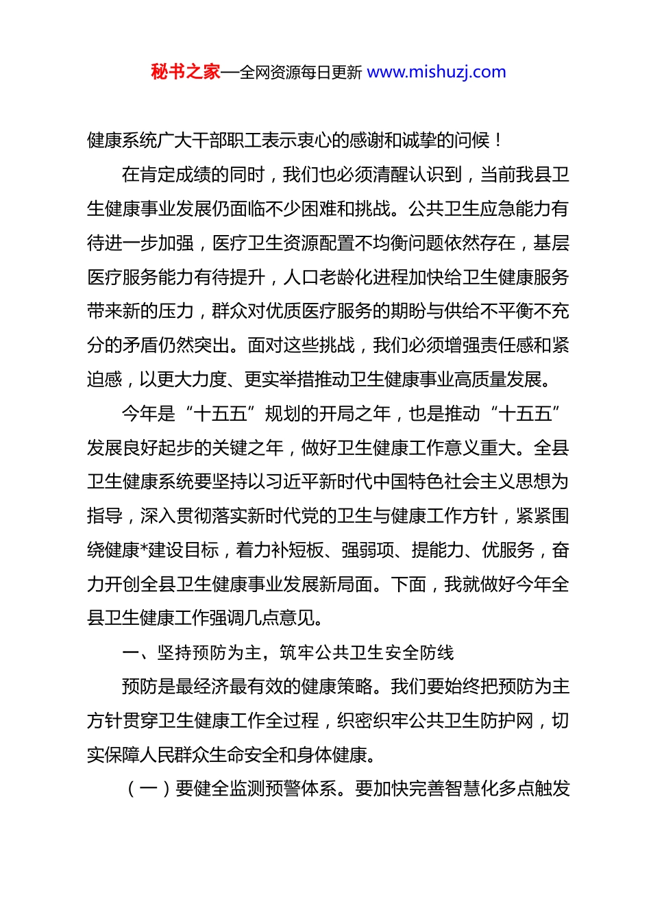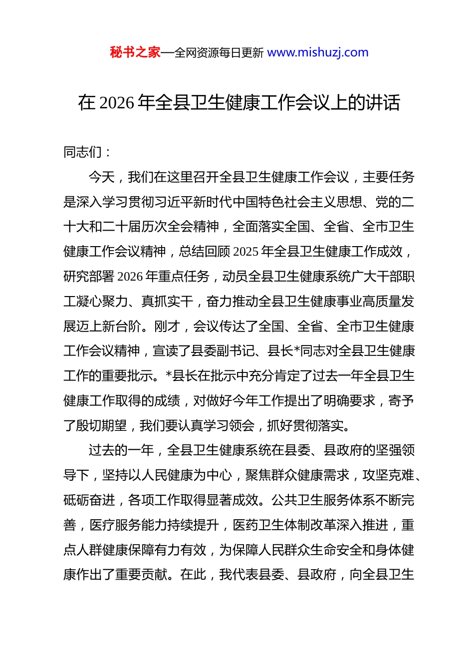 秘书之家—全网资源每日更新 www.mishuzj.com在 2026 年全县卫生健康工作会议上的讲话 同志们:今天,我们在这里召开全县卫生健康工作会议,主要任务是深入学习贯彻习近平新时代中国特色社会主义思想、党的二十大和二十届历次全会精神,全面落实全国、全省、全市卫生健康工作会议精神,总结回顾 2025 年全县卫生健康工作成效,研究部署 2026 年重点任务,动员全县卫生健康系统广大干部职工凝心聚力、真抓实干,奋力推动全县卫生健康事业高质量发展迈上新台阶。刚才,会议传达了全国、全省、全市卫生健康工作会议精神,宣读了县委副书记、县长*同志对全县卫生健康工作的重要批示。*县长在批示中充分肯定了过去一年全县卫生健康工作取得的成绩,对做好今年工作提出了明确要求,寄予了殷切期望,我们要认真学习领会,抓好贯彻落实。过去的一年,全县卫生健康系统在县委、县政府的坚强领导下,坚持以人民健康为中心,聚焦群众健康需求,攻坚克难、砥砺奋进,各项工作取得显著成效。公共卫生服务体系不断完善,医疗服务能力持续提升,医药卫生体制改革深入推进,重点人群健康保障有力有效,为保障人民群众生命安全和身体健康作出了重要贡献。在此,我代表县委、县政府,向全县卫生秘书之家—全网资源每日更新 www.mishuzj.com健康系统广大干部职工表示衷心的感谢和诚挚的问候!在肯定成绩的同时,我们也必须清醒认识到,当前我县卫生健康事业发展仍面临不少困难和挑战。公共卫生应急能力有待进一步加强,医疗卫生资源配置不均衡问题依然存在,基层医疗服务能力有待提升,人口老龄化进程加快给卫生健康服务带来新的压力,群众对优质医疗服务的期盼与供给不平衡不充分的矛盾仍然突出。面对这些挑战,我们必须增强责任感和紧迫感,以更大力度、更实举措推动卫生健康事业高质量发展。今年是“十五五”规划的开局之年,也是推动“十五五”发展良好起步的关键之年,做好卫生健康工作意义重大。全县卫生健康系统要坚持以习近平新时代中国特色社会主义思想为指导,深入贯彻落实新时代党的卫生与健康工作方针,紧紧围绕健康*建设目标,着力补短板、强弱项、提能力、优服务,奋力开创全县卫生健康事业发展新局面。下面,我就做好今年全县卫生健康工作强调几点意见。一、坚持预防为主,筑牢公共卫生安全防线预防是最经济最有效的健康策略。我们要始终把预防为主方针贯穿卫生健康工作全过程,织密织牢公共卫生防护网,切实保障人民群众生命安全和身体健康。(一)要健全监测预警体系。要加快完善智慧化多点触发秘书之家—全网资源每日更新 www.mishuzj.com监测预警机制,充分利用大数据、人工智能等现代信息技术,构建覆盖传染病、突发公共卫生事件、重大疾病的监测预警网络。要加强医疗机构发热门诊、肠道门诊等哨点建设,完善县乡村三级监测网络,实现疫情风险早发现、早报告、早处置。要强化应急演练和能力培训,提升突发公共卫生事件应急处置能力,确保一旦发生疫情能够快速响应、有效应对。(二)要抓实常态化防控和爱国卫生运动。要持续巩固疫情防控成果,保持高度警觉,完善常态化防控机制,加强重点场所、重点人群、重点环节防控措施落实。要深入开展爱国卫生运动,扎实推进卫生城镇创建,加强城乡环境卫生整治,推广文明健康生活方式,营造良好人居环境。要广泛开展健康知识宣传普及,提升群众健康素养水平,引导群众做好自己健康的第一责任人。(三)要高度关注蚊媒传染病防控。当前全球蚊媒传染病疫情形势严峻,登革热、基孔肯雅热等传染病输入风险持续存在。要加强蚊媒监测和风险评估,定期开展蚊媒密度监测和孳生地调查,及时掌握蚊媒消长规律和分布情况。要深入开展爱国卫生运动和城乡环境卫生整治,清除蚊虫孳生地,降低蚊媒密度。要加强医疗机构发热病例监测和诊疗培训,提高早期识别和救治能力,严防疫情输入传播。秘书之家—全网资源每日更新 www.mishuzj.com二、深化改革开放,激发事业发展动力活力改革是推动卫生健康事业发展的根本动力。我们要以深化医药卫生体制改革为牵引,以更大力度推进重点领域和关键环节改革,不断增强卫生健康事业发展内生动力。(一)要持...