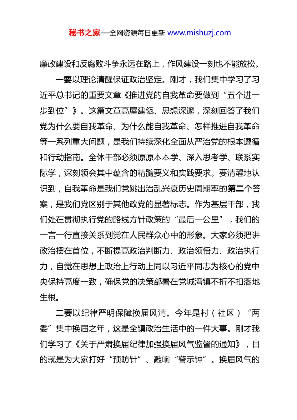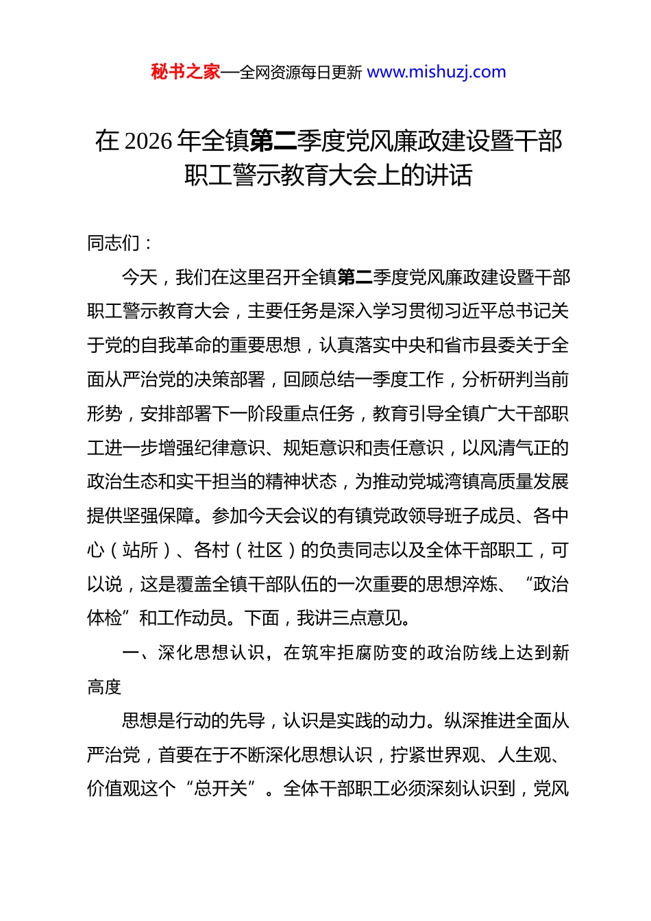 秘书之家—全网资源每日更新 www.mishuzj.com在 2026 年全镇第二季度党风廉政建设暨干部职工警示教育大会上的讲话 同志们:今天,我们在这里召开全镇第二季度党风廉政建设暨干部职工警示教育大会,主要任务是深入学习贯彻习近平总书记关于党的自我革命的重要思想,认真落实中央和省市县委关于全面从严治党的决策部署,回顾总结一季度工作,分析研判当前形势,安排部署下一阶段重点任务,教育引导全镇广大干部职工进一步增强纪律意识、规矩意识和责任意识,以风清气正的政治生态和实干担当的精神状态,为推动党城湾镇高质量发展提供坚强保障。参加今天会议的有镇党政领导班子成员、各中心(站所)、各村(社区)的负责同志以及全体干部职工,可以说,这是覆盖全镇干部队伍的一次重要的思想淬炼、“政治体检”和工作动员。下面,我讲三点意见。一、深化思想认识,在筑牢拒腐防变的政治防线上达到新高度思想是行动的先导,认识是实践的动力。纵深推进全面从严治党,首要在于不断深化思想认识,拧紧世界观、人生观、价值观这个“总开关”。全体干部职工必须深刻认识到,党风秘书之家—全网资源每日更新 www.mishuzj.com廉政建设和反腐败斗争永远在路上,作风建设一刻也不能放松。一要以理论清醒保证政治坚定。刚才,我们集中学习了习近平总书记的重要文章《推进党的自我革命要做到“五个进一步到位”》。这篇文章高屋建瓴、思想深邃,深刻回答了我们党为什么要自我革命、为什么能自我革命、怎样推进自我革命等一系列重大问题,是我们持续深化全面从严治党的根本遵循和行动指南。全体干部必须原原本本学、深入思考学、联系实际学,深刻领会其中蕴含的精髓要义和实践要求。要清醒地认识到,自我革命是我们党跳出治乱兴衰历史周期率的第二个答案,是我们党区别于其他政党的显著标志。作为基层干部,我们处在贯彻执行党的路线方针政策的“最后一公里”,我们的一言一行直接关系到党在人民群众心中的形象。大家必须把讲政治摆在首位,不断提高政治判断力、政治领悟力、政治执行力,自觉在思想上政治上行动上同以习近平同志为核心的党中央保持高度一致,确保党的决策部署在党城湾镇不折不扣落地生根。二要以纪律严明保障换届风清。今年是村(社区)“两委”集中换届之年,这是全镇政治生活中的一件大事。刚才我们学习了《关于严肃换届纪律加强换届风气监督的通知》,目的就是为大家打好“预防针”、敲响“警示钟”。换届风气的秘书之家—全网资源每日更新 www.mishuzj.com好坏,直接关系到换届工作的成败,关系到未来五年我们事业发展的基础。我们必须深刻认识换届与发展的辩证关系,换届是为了选优配强班子,激发队伍活力,最终目的是更好地推动发展,绝不能将其视为工作的“休止符”、干部的“避风港”。在这个关键时期,任何“等一等、看一看”的“躺平”思想,任何“事不关己、高高挂起”的“佛系”心态,都是对党和人民事业的极端不负责任。全镇上下要坚决把纪律和规矩挺在前面,严格遵守“十严禁”等换届纪律要求,坚决抵制拉票贿选、跑官要官、说情打招呼等不正之风。镇纪委要联合相关部门,强化全程监督,对换届中的违纪违法问题,坚持露头就打、快查严办,以铁的纪律确保换届工作平稳有序、风清气正,为我们未来的发展保驾护航。三要以案为镜鉴做到警钟长鸣。刚才,我们通报了近期查处的一些违纪违法典型案例。这些发生在身边的“活教材”,再一次警示我们,理想信念的滑坡是最危险的滑坡,纪律底线的失守是走向深渊的开始。会后,我们还将组织观看警示教育片。希望大家能够真正把自己摆进去、把职责摆进去、把工作摆进去,深刻剖析问题根源,认真汲取沉痛教训。要算好政治账、经济账、名誉账、家庭账、亲情账、自由账、健康账“七本账”,时刻保持对“腐蚀”“围猎”的警觉,不断增强自我秘书之家—全网资源每日更新 www.mishuzj.com净化、自我完善、自我革新、自我提高的能力。全镇各级党组织要常态化开展警示教育,用好典型案例,让党员干部知敬畏、存戒惧、守底线,真正做到“见不善如探汤”,在内心深处筑起一道坚不可摧的思想防线。二、聚焦主责主业,在服务高质量发展...