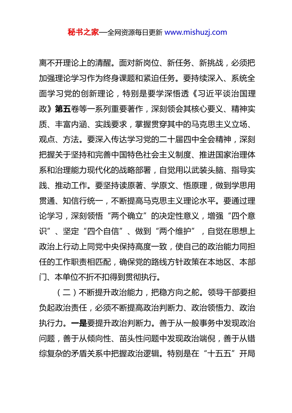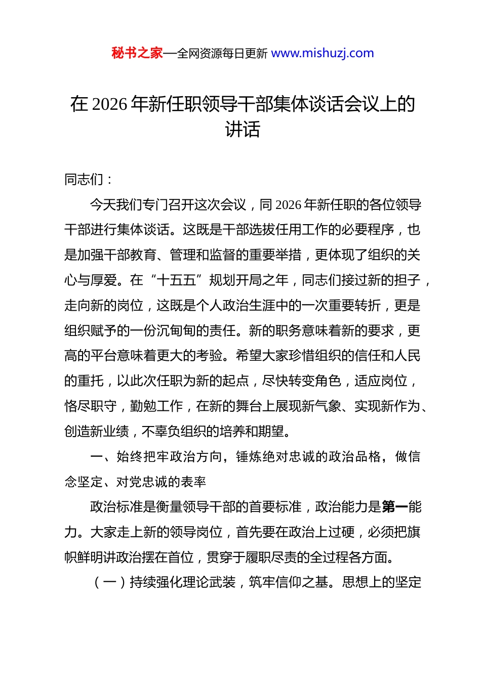 秘书之家—全网资源每日更新 www.mishuzj.com在 2026 年新任职领导干部集体谈话会议上的讲话 同志们:今天我们专门召开这次会议,同 2026 年新任职的各位领导干部进行集体谈话。这既是干部选拔任用工作的必要程序,也是加强干部教育、管理和监督的重要举措,更体现了组织的关心与厚爱。在“十五五”规划开局之年,同志们接过新的担子,走向新的岗位,这既是个人政治生涯中的一次重要转折,更是组织赋予的一份沉甸甸的责任。新的职务意味着新的要求,更高的平台意味着更大的考验。希望大家珍惜组织的信任和人民的重托,以此次任职为新的起点,尽快转变角色,适应岗位,恪尽职守,勤勉工作,在新的舞台上展现新气象、实现新作为、创造新业绩,不辜负组织的培养和期望。一、始终把牢政治方向,锤炼绝对忠诚的政治品格,做信念坚定、对党忠诚的表率政治标准是衡量领导干部的首要标准,政治能力是第一能力。大家走上新的领导岗位,首先要在政治上过硬,必须把旗帜鲜明讲政治摆在首位,贯穿于履职尽责的全过程各方面。(一)持续强化理论武装,筑牢信仰之基。思想上的坚定秘书之家—全网资源每日更新 www.mishuzj.com离不开理论上的清醒。面对新岗位、新任务、新挑战,必须把加强理论学习作为终身课题和紧迫任务。要持续深入、系统全面学习党的创新理论,特别是要学深悟透《习近平谈治国理政》第五卷等一系列重要著作,深刻领会其核心要义、精神实质、丰富内涵、实践要求,掌握贯穿其中的马克思主义立场、观点、方法。要深入传达学习党的二十届四中全会精神,深刻把握关于坚持和完善中国特色社会主义制度、推进国家治理体系和治理能力现代化的战略部署,自觉用以武装头脑、指导实践、推动工作。要坚持读原著、学原文、悟原理,做到学思用贯通、知信行统一,不断提高马克思主义理论水平。要通过理论学习,深刻领悟“两个确立”的决定性意义,增强“四个意识”、坚定“四个自信”、做到“两个维护”,自觉在思想上政治上行动上同党中央保持高度一致,使自己的政治能力同担任的工作职责相匹配,确保党的路线方针政策在本地区、本部门、本单位不折不扣得到贯彻执行。(二)不断提升政治能力,把稳方向之舵。领导干部要担负起政治责任,必须不断提高政治判断力、政治领悟力、政治执行力。一是要提升政治判断力。善于从一般事务中发现政治问题,善于从倾向性、苗头性问题中发现政治端倪,善于从错综复杂的矛盾关系中把握政治逻辑。特别是在“十五五”开局秘书之家—全网资源每日更新 www.mishuzj.com起步的关键时期,各项改革发展的任务艰巨繁重,面临的矛盾风险挑战更为复杂,必须坚持政治立场不移、政治方向不偏,增强科学把握形势变化、精准识别现象本质、清醒明辨行为是非、有效抵御风险挑战的能力。二是要提升政治领悟力。对党中央精神、对上级决策部署,要深入学习、融会贯通,坚持用党中央精神分析形势、推动工作。要时刻关注党中央在关心什么、强调什么,深刻领会什么是党和国家最重要的利益、什么是最需要坚定维护的立场,始终胸怀“国之大者”,自觉站在党和国家事业发展全局的高度思考问题、谋划工作、推动落实。三是要提升政治执行力。要不折不扣抓好党中央精神贯彻落实,坚决维护党中央权威和集中统一领导。制定政策、部署任务、推进工作,都要自觉同党的基本理论、基本路线、基本方略对标对表,同党中央决策部署对标对表,做到党中央提倡的坚决响应、党中央决定的坚决执行、党中央禁止的坚决不做,确保政令畅通、令行禁止,决不能打折扣、做选择、搞变通。(三)严守政治纪律规矩,恪守忠诚之本。对党忠诚,是共产党人首要的政治品质。这种忠诚,必须是纯粹的、无条件的。要始终把党放在心中最高位置,牢记自己的第一身份是共产党员,第一职责是为党工作。要严格遵守党的政治纪律和政治规矩,做政治上的明白人、老实人。要严格执行新形势下党秘书之家—全网资源每日更新 www.mishuzj.com内政治生活若干准则,增强党内政治生活的政治性、时代性、原则性、战斗性。要严格执行民主集中制,决不允许搞个人专断、各自为政,决不允许搞上有政策、下有对策。要自觉加强党性锻炼...