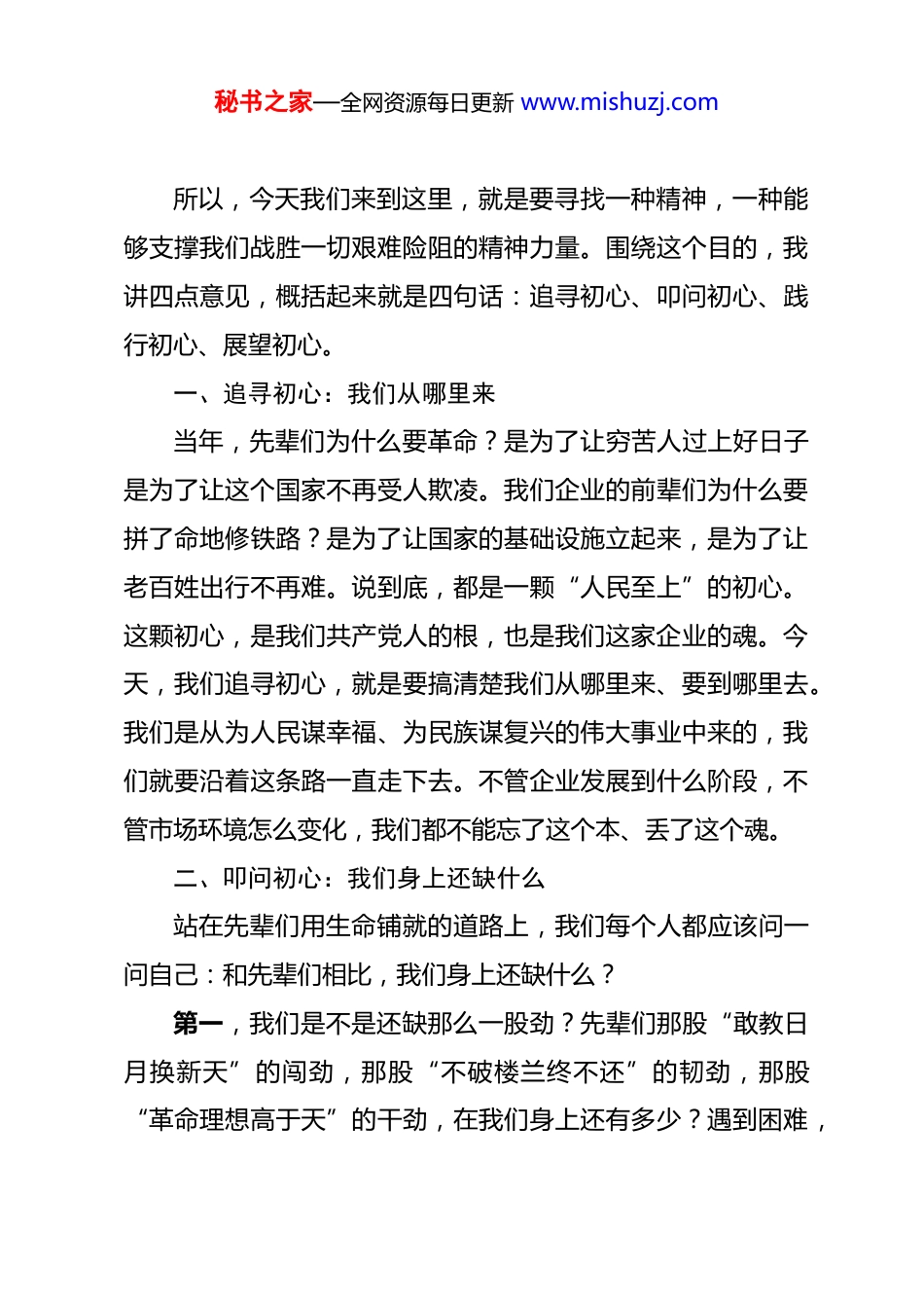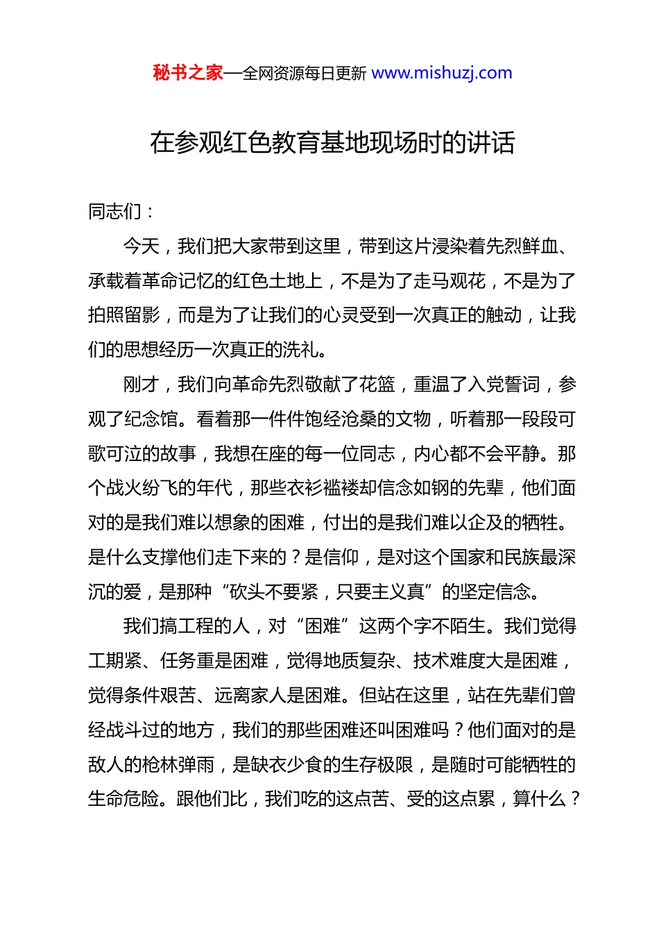 秘书之家—全网资源每日更新 www.mishuzj.com在参观红色教育基地现场时的讲话 同志们:今天,我们把大家带到这里,带到这片浸染着先烈鲜血、承载着革命记忆的红色土地上,不是为了走马观花,不是为了拍照留影,而是为了让我们的心灵受到一次真正的触动,让我们的思想经历一次真正的洗礼。刚才,我们向革命先烈敬献了花篮,重温了入党誓词,参观了纪念馆。看着那一件件饱经沧桑的文物,听着那一段段可歌可泣的故事,我想在座的每一位同志,内心都不会平静。那个战火纷飞的年代,那些衣衫褴褛却信念如钢的先辈,他们面对的是我们难以想象的困难,付出的是我们难以企及的牺牲。是什么支撑他们走下来的?是信仰,是对这个国家和民族最深沉的爱,是那种“砍头不要紧,只要主义真”的坚定信念。我们搞工程的人,对“困难”这两个字不陌生。我们觉得工期紧、任务重是困难,觉得地质复杂、技术难度大是困难,觉得条件艰苦、远离家人是困难。但站在这里,站在先辈们曾经战斗过的地方,我们的那些困难还叫困难吗?他们面对的是敌人的枪林弹雨,是缺衣少食的生存极限,是随时可能牺牲的生命危险。跟他们比,我们吃的这点苦、受的这点累,算什么?秘书之家—全网资源每日更新 www.mishuzj.com所以,今天我们来到这里,就是要寻找一种精神,一种能够支撑我们战胜一切艰难险阻的精神力量。围绕这个目的,我讲四点意见,概括起来就是四句话:追寻初心、叩问初心、践行初心、展望初心。一、追寻初心:我们从哪里来当年,先辈们为什么要革命?是为了让穷苦人过上好日子是为了让这个国家不再受人欺凌。我们企业的前辈们为什么要拼了命地修铁路?是为了让国家的基础设施立起来,是为了让老百姓出行不再难。说到底,都是一颗“人民至上”的初心。这颗初心,是我们共产党人的根,也是我们这家企业的魂。今天,我们追寻初心,就是要搞清楚我们从哪里来、要到哪里去。我们是从为人民谋幸福、为民族谋复兴的伟大事业中来的,我们就要沿着这条路一直走下去。不管企业发展到什么阶段,不管市场环境怎么变化,我们都不能忘了这个本、丢了这个魂。二、叩问初心:我们身上还缺什么站在先辈们用生命铺就的道路上,我们每个人都应该问一问自己:和先辈们相比,我们身上还缺什么?第一,我们是不是还缺那么一股劲?先辈们那股“敢教日月换新天”的闯劲,那股“不破楼兰终不还”的韧劲,那股“革命理想高于天”的干劲,在我们身上还有多少?遇到困难,秘书之家—全网资源每日更新 www.mishuzj.com我们是先想办法解决,还是先找理由推脱?面对挑战,我们是主动迎上去,还是绕着走?任务压头,我们是咬紧牙关顶上去,还是讨价还价讲条件?这些问题,值得我们每一个人深思。第二,我们是不是还缺那么一种精神?先辈们那种“一不怕苦、二不怕死”的革命精神,那种“自己动手、丰衣足食”的奋斗精神,那种“顾全大局、无私奉献”的牺牲精神,在我们身上传承了多少?项目条件艰苦一点,我们能不能吃得了苦?个人利益和集体利益冲突的时候,我们能不能把集体放在前面?需要加班加点抢工期的时候,我们能不能毫无怨言地顶上去?这些问题,同样值得我们认真反省。第三,我们是不是还缺那么一种情怀?先辈们那种“把一切献给党”的忠诚,那种“全心全意为人民服务”的宗旨意识,那种“功成不必在我、功成必定有我”的胸襟,在我们身上扎根有多深?我们干工作,是把它当成一份职业,还是当成一份事业?我们抓管理,是只求不出事,还是追求做到极致?我们带队伍,是只把他们当下属,还是真心实意为他们着想?这些问题,我们要问到自己灵魂深处。三、践行初心:我们应该怎么干追寻初心是为了不忘本来,叩问初心是为了看清差距,而最终的目的,是把初心转化为推动企业发展的实际行动。站在秘书之家—全网资源每日更新 www.mishuzj.com新的历史起点上,我们应该怎么干?我讲四句话。第一句话:要把信仰的旗帜举得更高。先辈们之所以能在极端困难的情况下坚持斗争,靠的就是钢铁般的信仰。今天,我们同样需要信仰。信仰不是空洞的,它体现在对党忠诚上,体现在对企业负责上,体现在对岗位尽责上。我们要把从红色基地汲取的精神力...