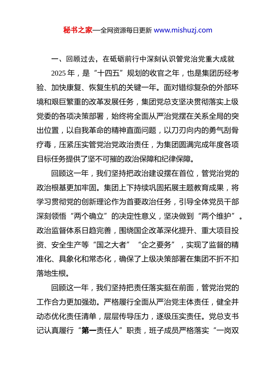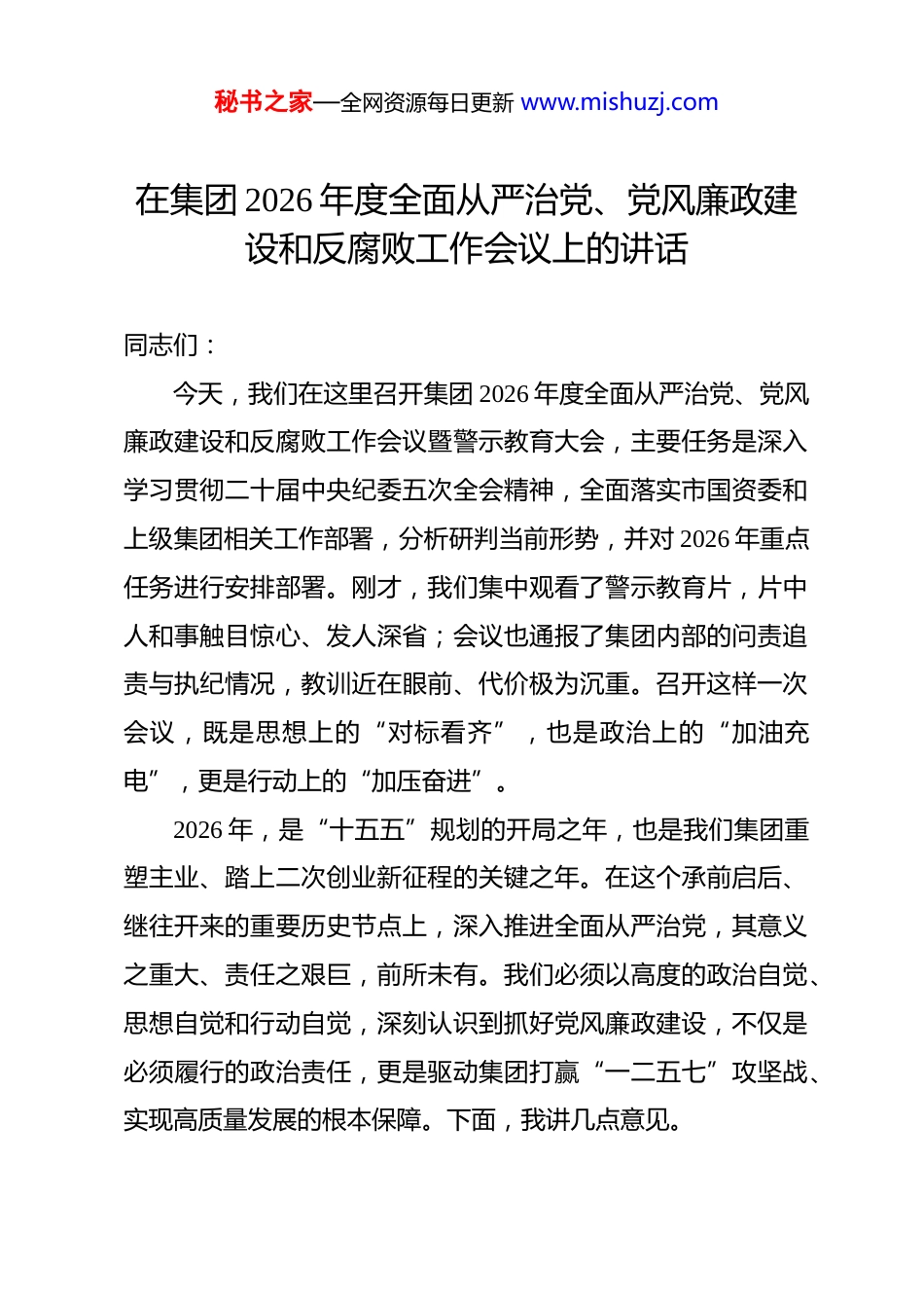 秘书之家—全网资源每日更新 www.mishuzj.com在集团 2026 年度全面从严治党、党风廉政建设和反腐败工作会议上的讲话 同志们:今天,我们在这里召开集团 2026 年度全面从严治党、党风廉政建设和反腐败工作会议暨警示教育大会,主要任务是深入学习贯彻二十届中央纪委五次全会精神,全面落实市国资委和上级集团相关工作部署,分析研判当前形势,并对 2026 年重点任务进行安排部署。刚才,我们集中观看了警示教育片,片中人和事触目惊心、发人深省;会议也通报了集团内部的问责追责与执纪情况,教训近在眼前、代价极为沉重。召开这样一次会议,既是思想上的“对标看齐”,也是政治上的“加油充电”,更是行动上的“加压奋进”。2026 年,是“十五五”规划的开局之年,也是我们集团重塑主业、踏上二次创业新征程的关键之年。在这个承前启后、继往开来的重要历史节点上,深入推进全面从严治党,其意义之重大、责任之艰巨,前所未有。我们必须以高度的政治自觉、思想自觉和行动自觉,深刻认识到抓好党风廉政建设,不仅是必须履行的政治责任,更是驱动集团打赢“一二五七”攻坚战、实现高质量发展的根本保障。下面,我讲几点意见。秘书之家—全网资源每日更新 www.mishuzj.com一、回顾过去,在砥砺前行中深刻认识管党治党重大成就2025 年,是“十四五”规划的收官之年,也是集团历经考验、加快康复、恢复生机的关键一年。面对错综复杂的外部环境和艰巨繁重的改革发展任务,集团党总支坚决贯彻落实上级党委的各项决策部署,始终将全面从严治党摆在关系全局的突出位置,以自我革命的精神直面问题,以刀刃向内的勇气刮骨疗毒,压紧压实管党治党政治责任,为集团圆满完成年度各项目标任务提供了坚不可摧的政治保障和纪律保障。回顾这一年,我们坚持把政治建设摆在首位,管党治党的政治根基更加牢固。集团上下持续巩固拓展主题教育成果,将学习贯彻党的创新理论作为首要政治任务,引导全体党员干部深刻领悟“两个确立”的决定性意义,坚决做到“两个维护”。政治监督体系日趋完善,围绕国企改革深化提升、重大项目投资、安全生产等“国之大者”“企之要务”,实现了监督的精准化、具象化和常态化,确保了上级决策部署在集团不折不扣落地生根。回顾这一年,我们坚持把责任落实挺在前面,管党治党的工作合力更加强劲。严格履行全面从严治党主体责任,健全并动态优化责任清单,层层传导压力,逐级压实责任。党总支书记认真履行“第一责任人”职责,班子成员严格落实“一岗双秘书之家—全网资源每日更新 www.mishuzj.com责”,纪检部门聚焦主责主业强化监督执纪问责,形成了党委统一领导、党政齐抓共管、纪委组织协调、部门各负其责的“大监督”格局,管党治党从“宽松软”走向“严紧硬”的态势持续巩固。回顾这一年,我们坚持把正风肃纪贯穿始终,管党治党的干事氛围更加清朗。锲而不舍落实中央八项规定及其实施细则精神,对“四风”问题露头就打、寸步不让。针对形式主义、官僚主义的新变种、新表现,开展专项整治,切实为基层减负松绑。纪律教育和廉洁文化建设一体推进,通过常态化警示教育,引导广大干部职工知敬畏、存戒惧、守底线,崇廉尚洁的价值理念日益深入人心。在肯定成绩的同时,我们也必须清醒地看到,对照新时代新征程的新要求,对照上级党委的殷切期望,对照广大职工群众的热切期盼,我们的工作还存在一些不容忽视的问题和短板。比如,少数基层党组织的政治功能和组织功能仍有待加强,党建工作与生产经营“一本账”的融合深度还不够;个别干部担当作为的精气神不足,存在“多做多错、少做少错、不做不错”的躺平心态;“四风”问题禁而未绝,隐形变异现象时有发生;重点领域和关键环节的廉洁风险依然存在,监督执纪的“探头”作用还需要进一步发挥。这些问题,都警示我们,全秘书之家—全网资源每日更新 www.mishuzj.com面从严治党永远在路上,管党治党一刻也不能放松。二、正视当下,在复杂形势中保持永远在路上的清醒坚定党的二十大以来,党中央对坚定不移全面从严治党、深入推进新时代党的建设新的伟大工程作出战略部署,释放了反腐败斗争一刻不停、永远吹冲锋号的强...