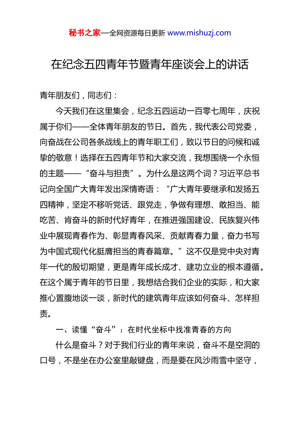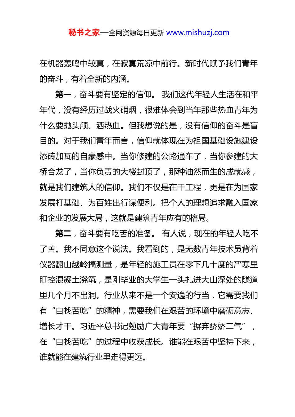 秘书之家—全网资源每日更新 www.mishuzj.com在纪念五四青年节暨青年座谈会上的讲话 青年朋友们,同志们:今天我们在这里集会,纪念五四运动一百零七周年,庆祝属于你们——全体青年朋友的节日。首先,我代表公司党委,向奋战在公司各条战线上的青年职工们,致以节日的问候和诚挚的敬意!选择在五四青年节和大家交流,我想围绕一个永恒的主题——“奋斗与担责”。为什么是这两个词?习近平总书记向全国广大青年发出深情寄语:“广大青年要继承和发扬五四精神,坚定不移听党话、跟党走,争做有理想、敢担当、能吃苦、肯奋斗的新时代好青年,在推进强国建设、民族复兴伟业中展现青春作为、彰显青春风采、贡献青春力量,奋力书写为中国式现代化挺膺担当的青春篇章。”这不仅是党中央对青年一代的殷切期望,更是青年成长成才、建功立业的根本遵循。在这个属于青年的节日里,我想结合我们企业的实际,和大家推心置腹地谈一谈,新时代的建筑青年应该如何奋斗、怎样担责。一、读懂“奋斗”:在时代坐标中找准青春的方向什么是奋斗?对于我们行业的青年来说,奋斗不是空洞的口号,不是坐在办公室里敲键盘,而是要在风沙雨雪中坚守,秘书之家—全网资源每日更新 www.mishuzj.com在机器轰鸣中较真,在寂寞荒凉中前行。新时代赋予我们青年的奋斗,有着全新的内涵。第一,奋斗要有坚定的信仰。 我们这代年轻人生活在和平年代,没有经历过战火硝烟,很难体会到当年那些热血青年为什么要抛头颅、洒热血。但我想说的是,没有信仰的奋斗是盲目的。对于我们青年而言,信仰就体现在为祖国基础设施建设添砖加瓦的自豪感中。当你修建的公路通车了,当你参建的大桥合龙了,当你负责的大楼封顶了,那种油然而生的成就感,就是我们建筑人的信仰。我们不仅是在干工程,更是在为国家发展打基础、为百姓出行谋便利。把个人的理想追求融入国家和企业的发展大局,这就是建筑青年应有的格局。第二,奋斗要有吃苦的准备。 有人说,现在的年轻人吃不了苦。我不同意这个说法。我看到的,是无数青年技术员背着仪器翻山越岭搞测量,是年轻的施工员在零下几十度的严寒里盯控混凝土浇筑,是刚毕业的大学生一头扎进大山深处的隧道里几个月不出洞。行业从来不是一个安逸的行当,它需要我们有“自找苦吃”的精神,需要我们在艰苦的环境中磨砺意志、增长才干。习近平总书记勉励广大青年要“摒弃骄娇二气”,在“自找苦吃”的过程中收获成长。谁能在艰苦中坚持下来,谁就能在建筑行业里走得更远。秘书之家—全网资源每日更新 www.mishuzj.com第三,奋斗要有持久战的韧劲。 搞工程,不是百米冲刺,而是马拉松。一个项目短则一两年,长则三五年甚至更久。年轻人刚来的时候都热血沸腾,但热情退却之后怎么办?这就需要韧劲。行业的成才周期很长,一个优秀的项目经理、一个顶尖的技术专家,没有十年八年的项目一线历练是出不来的。年轻人不要急功近利,不要想着一步登天,要把根扎在项目上,把心沉在工地上,在日复一日的坚持中积累经验、沉淀能力。时间不会亏待每一个认真奋斗的人。二、诠释“担责”:在企业转型中扛起青春的重任当前,我们企业正处在转型升级的关键时期。市场经营的竞争越来越激烈,项目管理的精细化要求越来越高,智能建造、绿色施工等新技术层出不穷。越是在这种爬坡过坎的时候,越需要广大青年挺身而出、勇挑重担。第一,在项目攻坚中担当主力。 项目是我们企业的根本,施工现场是我们建功立业的主战场。工期紧张需要抢工的时候,青年突击队的旗帜要第一时间插上去;技术难题攻克不了的时候,青年技术骨干要主动请缨啃硬骨头;安全质量出现隐患的时候,青年要敢于站出来较真碰硬。不要觉得自己年轻、资历浅,就往后躲、往后缩。年轻恰恰是你们最大的资本——有精力、有冲劲、有不服输的劲头。企业把项目交给你们,就是要秘书之家—全网资源每日更新 www.mishuzj.com让你们在实践中摔打、在担当中成长。习近平总书记要求广大青年“勇挑重担、勇克难关、勇于实践,保持初生牛犊不怕虎、越是艰险越向前的刚健勇毅,在担当中历练,在尽责中成长”。项目一线,就是最好的历练场。第二,在技术创新中担当...