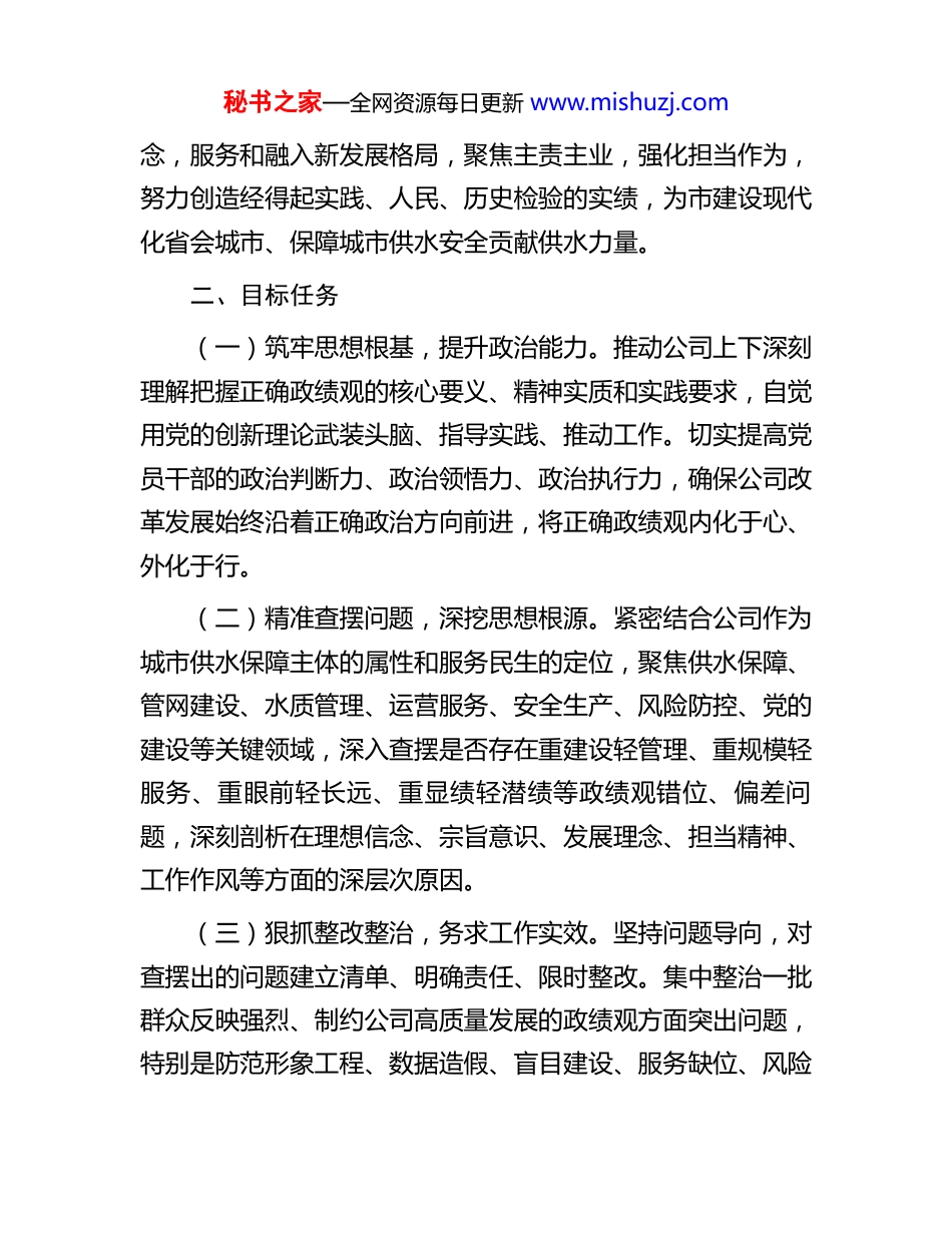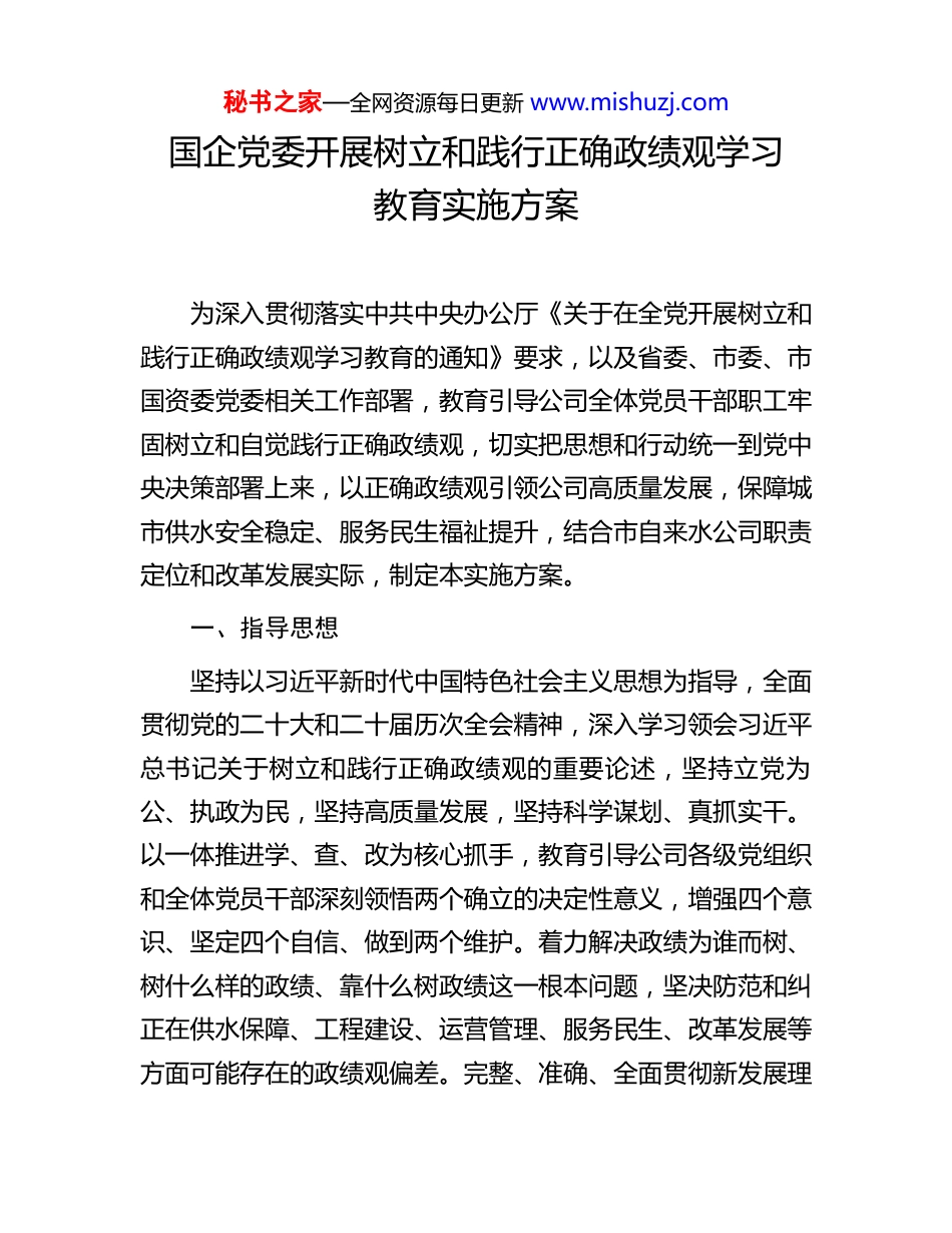 秘书之家—全网资源每日更新 www.mishuzj.com国企党委开展树立和践行正确政绩观学习教育实施方案为深入贯彻落实中共中央办公厅《关于在全党开展树立和践行正确政绩观学习教育的通知》要求,以及省委、市委、市国资委党委相关工作部署,教育引导公司全体党员干部职工牢固树立和自觉践行正确政绩观,切实把思想和行动统一到党中央决策部署上来,以正确政绩观引领公司高质量发展,保障城市供水安全稳定、服务民生福祉提升,结合市自来水公司职责定位和改革发展实际,制定本实施方案。一、指导思想坚持以习近平新时代中国特色社会主义思想为指导,全面贯彻党的二十大和二十届历次全会精神,深入学习领会习近平总书记关于树立和践行正确政绩观的重要论述,坚持立党为公、执政为民,坚持高质量发展,坚持科学谋划、真抓实干。以一体推进学、查、改为核心抓手,教育引导公司各级党组织和全体党员干部深刻领悟两个确立的决定性意义,增强四个意识、坚定四个自信、做到两个维护。着力解决政绩为谁而树、树什么样的政绩、靠什么树政绩这一根本问题,坚决防范和纠正在供水保障、工程建设、运营管理、服务民生、改革发展等方面可能存在的政绩观偏差。完整、准确、全面贯彻新发展理秘书之家—全网资源每日更新 www.mishuzj.com念,服务和融入新发展格局,聚焦主责主业,强化担当作为,努力创造经得起实践、人民、历史检验的实绩,为市建设现代化省会城市、保障城市供水安全贡献供水力量。二、目标任务(一)筑牢思想根基,提升政治能力。推动公司上下深刻理解把握正确政绩观的核心要义、精神实质和实践要求,自觉用党的创新理论武装头脑、指导实践、推动工作。切实提高党员干部的政治判断力、政治领悟力、政治执行力,确保公司改革发展始终沿着正确政治方向前进,将正确政绩观内化于心、外化于行。(二)精准查摆问题,深挖思想根源。紧密结合公司作为城市供水保障主体的属性和服务民生的定位,聚焦供水保障、管网建设、水质管理、运营服务、安全生产、风险防控、党的建设等关键领域,深入查摆是否存在重建设轻管理、重规模轻服务、重眼前轻长远、重显绩轻潜绩等政绩观错位、偏差问题,深刻剖析在理想信念、宗旨意识、发展理念、担当精神、工作作风等方面的深层次原因。(三)狠抓整改整治,务求工作实效。坚持问题导向,对查摆出的问题建立清单、明确责任、限时整改。集中整治一批群众反映强烈、制约公司高质量发展的政绩观方面突出问题,特别是防范形象工程、数据造假、盲目建设、服务缺位、风险秘书之家—全网资源每日更新 www.mishuzj.com累积等现象。以整改实效推动解决一批供水难题、办好一批民生实事、完善一批制度机制。(四)健全长效机制,巩固深化成果。将实践中行之有效的经验做法及时以制度形式固定下来,健全完善符合正确政绩观要求、适应现代企业制度特点的决策机制、考核评价体系、监督管理体系和激励约束机制,从源头上防范政绩观偏差,推动树立和践行正确政绩观常态化、长效化。(五)激励担当作为,推动高质量发展。把学习教育的成果转化为攻坚克难、干事创业的强大动力,引导全体干部职工立足岗位作贡献,在保障城市供水安全、提升供水服务品质、深化企业改革创新、防范化解重大风险、履行社会责任中展现新担当新作为,营造求真务实、奋发有为、清正廉洁的浓厚氛围,以新气象新作为推动公司高质量发展取得新成效。三、基本原则(一)坚持聚焦主题、服务大局。紧紧围绕树立和践行正确政绩观这一主题,紧密联系公司服务全市供水保障、实现国有资产保值增值、履行国企经济责任、政治责任、社会责任的使命任务,不搞形式主义,不做表面文章,确保学习教育与中心工作深度融合、相互促进。(二)坚持一体推进、贯通融合。不分批次、不划阶段,将理论学习、调查研究、推动发展、检视整改、建章立制等重秘书之家—全网资源每日更新 www.mishuzj.com点措施有机融合、一体推进,做到边学习、边对照、边检视、边整改,推动学习教育走深走实。(三)坚持以上率下、全员覆盖。以公司党委领导班子和领导干部,特别是一把手为重点,发挥头雁效应,带头学习研讨、带头查摆问题、带头整改...