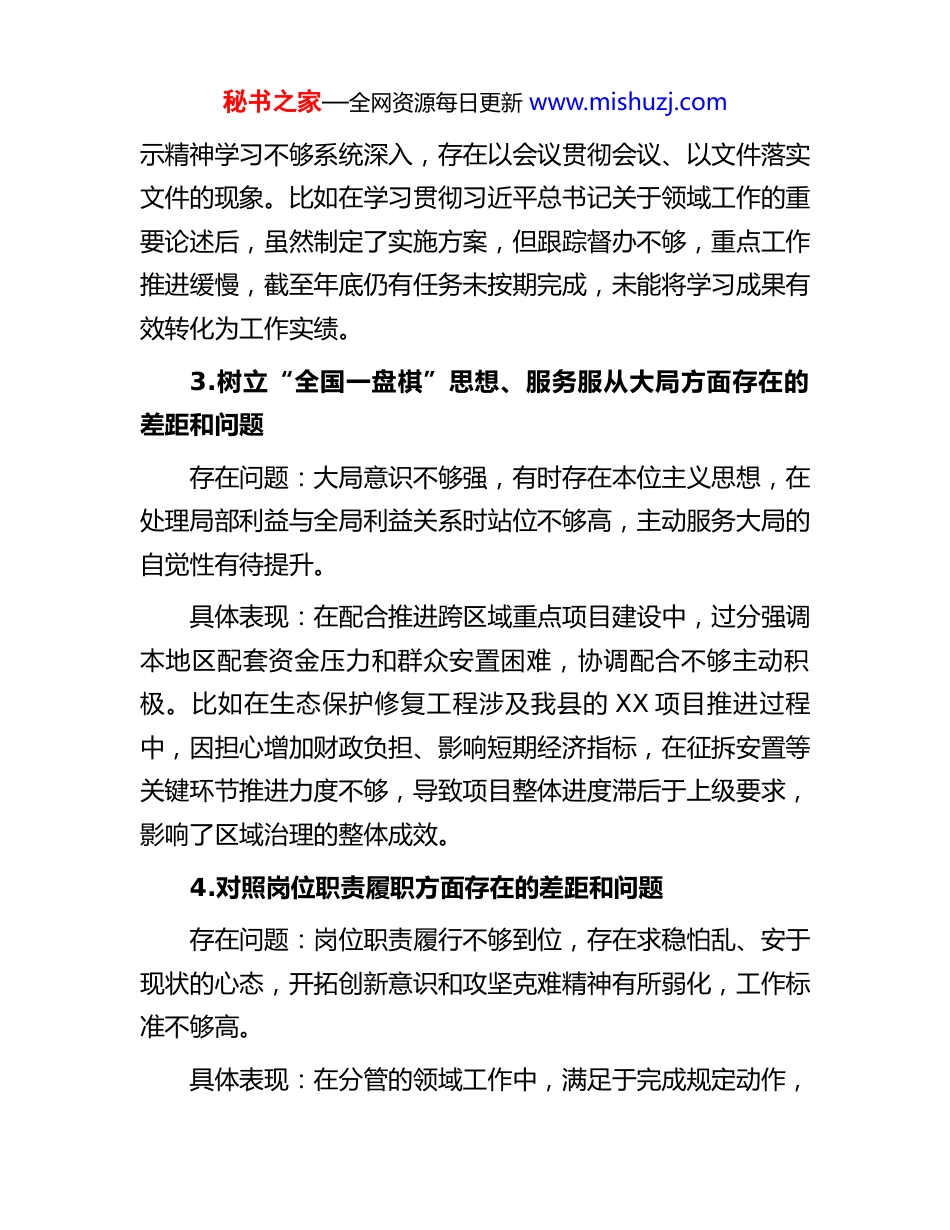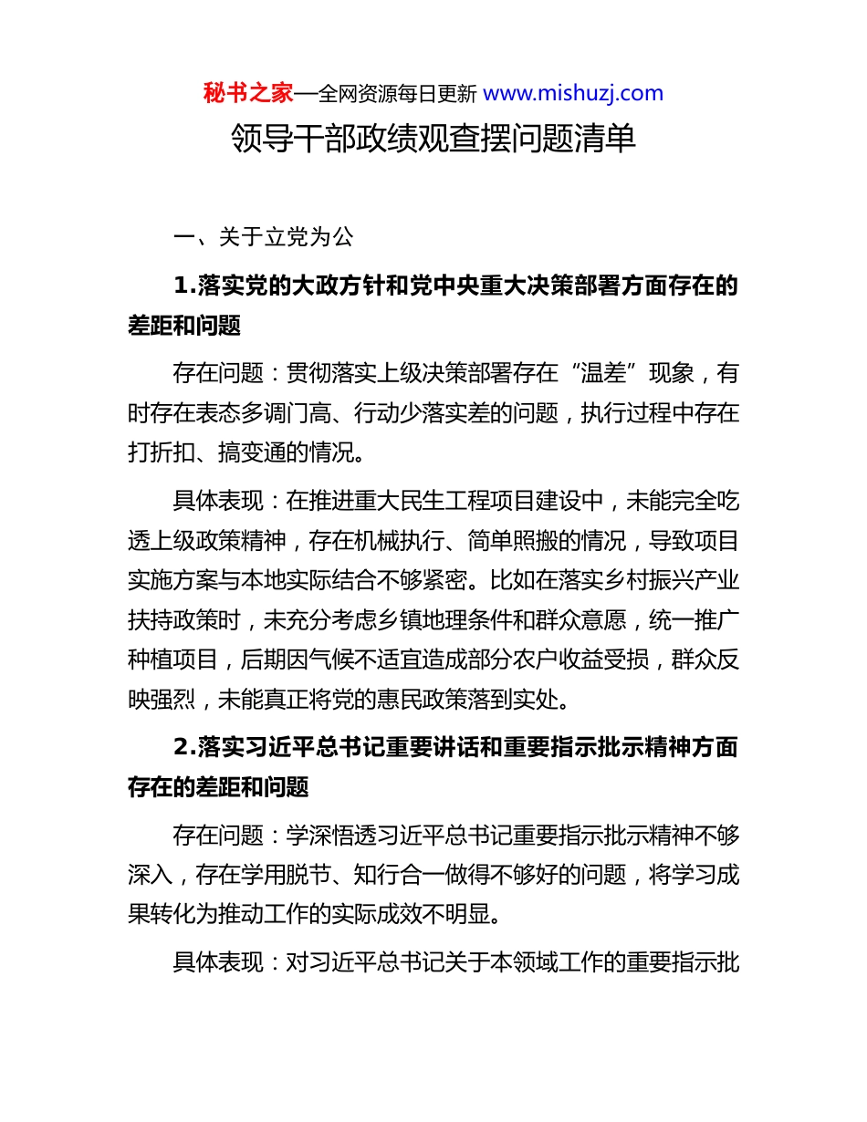 秘书之家—全网资源每日更新 www.mishuzj.com领导干部政绩观查摆问题清单一、关于立党为公1.落实党的大政方针和党中央重大决策部署方面存在的差距和问题存在问题:贯彻落实上级决策部署存在“温差”现象,有时存在表态多调门高、行动少落实差的问题,执行过程中存在打折扣、搞变通的情况。具体表现:在推进重大民生工程项目建设中,未能完全吃透上级政策精神,存在机械执行、简单照搬的情况,导致项目实施方案与本地实际结合不够紧密。比如在落实乡村振兴产业扶持政策时,未充分考虑乡镇地理条件和群众意愿,统一推广种植项目,后期因气候不适宜造成部分农户收益受损,群众反映强烈,未能真正将党的惠民政策落到实处。2.落实习近平总书记重要讲话和重要指示批示精神方面存在的差距和问题存在问题:学深悟透习近平总书记重要指示批示精神不够深入,存在学用脱节、知行合一做得不够好的问题,将学习成果转化为推动工作的实际成效不明显。具体表现:对习近平总书记关于本领域工作的重要指示批秘书之家—全网资源每日更新 www.mishuzj.com示精神学习不够系统深入,存在以会议贯彻会议、以文件落实文件的现象。比如在学习贯彻习近平总书记关于领域工作的重要论述后,虽然制定了实施方案,但跟踪督办不够,重点工作推进缓慢,截至年底仍有任务未按期完成,未能将学习成果有效转化为工作实绩。3.树立“全国一盘棋”思想、服务服从大局方面存在的差距和问题存在问题:大局意识不够强,有时存在本位主义思想,在处理局部利益与全局利益关系时站位不够高,主动服务大局的自觉性有待提升。具体表现:在配合推进跨区域重点项目建设中,过分强调本地区配套资金压力和群众安置困难,协调配合不够主动积极。比如在生态保护修复工程涉及我县的 XX 项目推进过程中,因担心增加财政负担、影响短期经济指标,在征拆安置等关键环节推进力度不够,导致项目整体进度滞后于上级要求,影响了区域治理的整体成效。4.对照岗位职责履职方面存在的差距和问题存在问题:岗位职责履行不够到位,存在求稳怕乱、安于现状的心态,开拓创新意识和攻坚克难精神有所弱化,工作标准不够高。具体表现:在分管的领域工作中,满足于完成规定动作,秘书之家—全网资源每日更新 www.mishuzj.com主动谋划、超前布局不够,对标先进地区差距明显。比如在推动产业发展过程中,习惯于用老办法解决新问题,对产业转型升级研究不深、办法不多,导致产业园区发展后劲不足,引进的企业中因配套设施不完善而未能投产达效,未能充分发挥岗位职责推动高质量发展的应有作用。二、关于为民造福5.坚持人民至上、践行全心全意为人民服务宗旨方面存在的差距和问题存在问题:宗旨意识有所淡化,“以人民为中心”的发展思想树得不够牢固,有时存在重发展轻民生的倾向,解决群众诉求不够及时有力。具体表现:在推进城镇化建设过程中,对群众合理诉求重视不够、回应不及时,存在重项目进度、轻群众感受的情况。比如在片区改造项目实施中,虽然项目如期完成,但对改造过程中部分群众反映的问题未能及时妥善解决,导致群众多次信访,后期花费大量精力协调处理,教训深刻,反映出宗旨意识还需要进一步强化。6.深入基层、联系服务群众方面存在的差距和问题存在问题:深入基层调研不够经常,联系服务群众的紧密度不够,有时存在走马观花、蜻蜓点水的现象,与群众“面对面”“心贴心”交流不够深入。秘书之家—全网资源每日更新 www.mishuzj.com具体表现:平时在办公室时间多、下基层时间少,调研指导往往以听汇报、看材料为主,真正深入田间地头、农户家中较少。比如在年度调研工作中到基层调研,其中事先安排路线、提前准备材料的调研占比较大,主动深入偏远村寨、随机走访农户了解真实情况较少,对群众急难愁盼问题掌握不够精准全面。7.推动解决民生、信访、群众急难愁盼问题方面存在的差距和不足存在问题:解决群众急难愁盼问题的力度不够大、效率不够高,对一些历史遗留问题存在畏难情绪,民生实事办理与群众期盼还有差距。具体表现:对群众反映的信访问题有时存在重程序、轻实效的情况,跟踪问效不够到位。比如群众反映的饮水困难问题,因涉及...