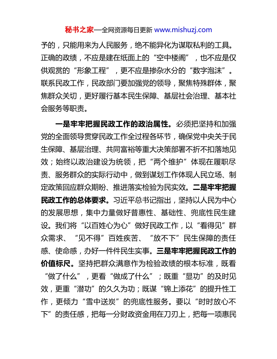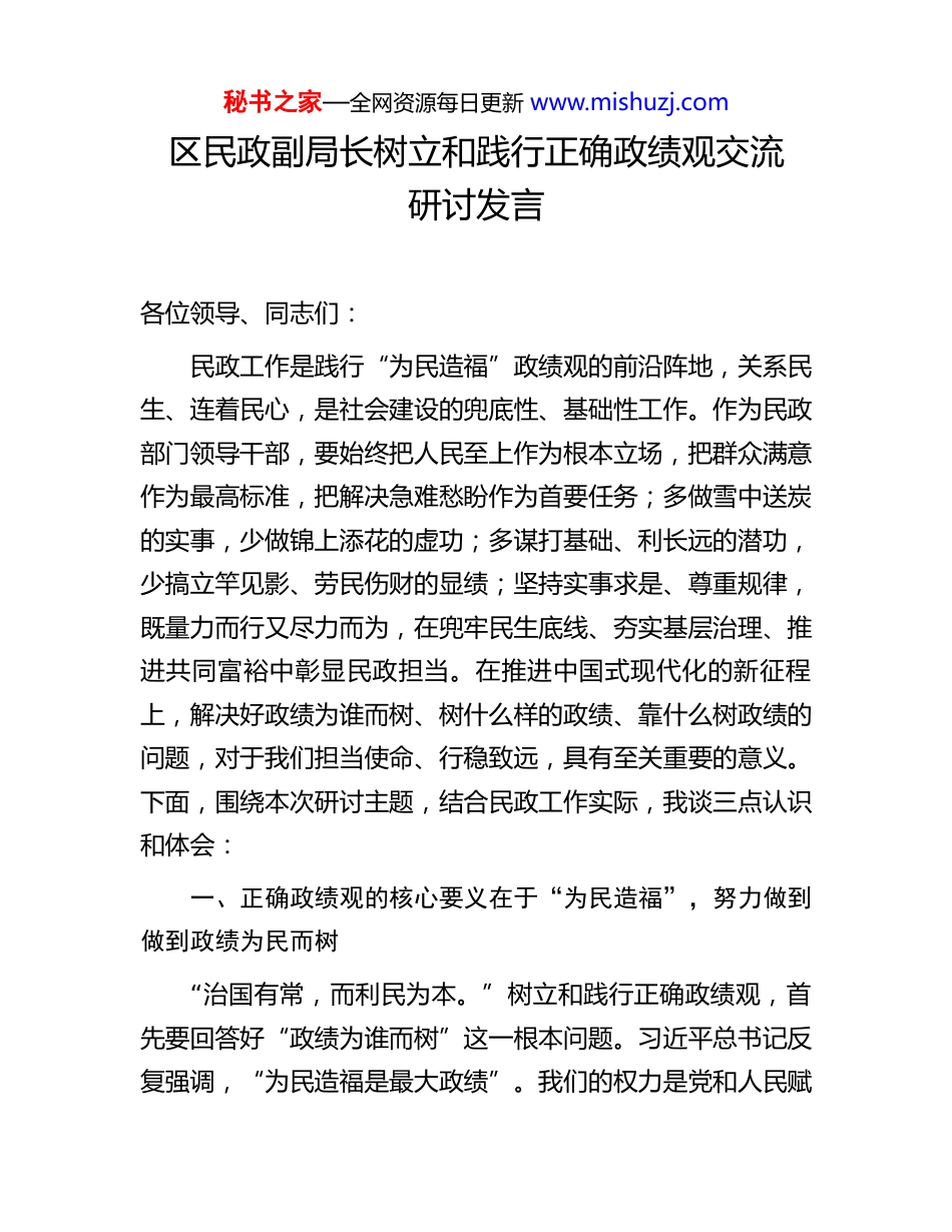 秘书之家—全网资源每日更新 www.mishuzj.com区民政副局长树立和践行正确政绩观交流研讨发言各位领导、同志们:民政工作是践行“为民造福”政绩观的前沿阵地,关系民生、连着民心,是社会建设的兜底性、基础性工作。作为民政部门领导干部,要始终把人民至上作为根本立场,把群众满意作为最高标准,把解决急难愁盼作为首要任务;多做雪中送炭的实事,少做锦上添花的虚功;多谋打基础、利长远的潜功,少搞立竿见影、劳民伤财的显绩;坚持实事求是、尊重规律,既量力而行又尽力而为,在兜牢民生底线、夯实基层治理、推进共同富裕中彰显民政担当。在推进中国式现代化的新征程上,解决好政绩为谁而树、树什么样的政绩、靠什么树政绩的问题,对于我们担当使命、行稳致远,具有至关重要的意义。下面,围绕本次研讨主题,结合民政工作实际,我谈三点认识和体会:一、正确政绩观的核心要义在于“为民造福”,努力做到做到政绩为民而树“治国有常,而利民为本。”树立和践行正确政绩观,首先要回答好“政绩为谁而树”这一根本问题。习近平总书记反复强调,“为民造福是最大政绩”。我们的权力是党和人民赋秘书之家—全网资源每日更新 www.mishuzj.com予的,只能用来为人民服务,绝不能异化为谋取私利的工具。正确的政绩,不应是建在纸面上的“空中楼阁”,也不应是仅供观赏的“形象工程”,更不应是掺杂水分的“数字泡沫”。联系民政工作,民政部门要加强党的领导,聚焦特殊群体,聚焦群众关切,更好履行基本民生保障、基层社会治理、基本社会服务等职责。一是牢牢把握民政工作的政治属性。必须把坚持和加强党的全面领导贯穿民政工作全过程各环节,确保党中央关于民生保障、基层治理、共同富裕等重大决策部署不折不扣落地见效;始终以政治建设为统领,把“两个维护”体现在履职尽责、服务群众的实际行动中,做到谋划工作体现人民立场、制定政策回应群众期盼、推进落实检验为民实效。二是牢牢把握民政工作的总体要求。习近平总书记指出,坚持以人民为中心的发展思想,集中力量做好普惠性、基础性、兜底性民生建设。我们将“以百姓心为心”做好民政工作,以“看得见”群众需求、“见不得”百姓疾苦、“放不下”民生保障的责任感、使命感,办好一件件民生实事。三是牢牢把握民政工作的价值标尺。坚持把群众满意作为检验政绩的根本标准,既看“做了什么”,更看“做成了什么”;既重“显功”的及时见效,更重“潜功”的久久为功;既谋“锦上添花”的提升性工作,更倾力“雪中送炭”的兜底性服务。要以“时时放心不下”的责任感,把每一分财政资金用在刀刃上,把每一项惠民秘书之家—全网资源每日更新 www.mishuzj.com政策落到心坎里,让困难群众有依靠、基层治理有温度、共同富裕有质感。二、正确政绩观的实践路径在于“实干担当”,努力做到全心全意改善民生“空谈误国,实干兴邦。”正确政绩观不是抽象的概念,最终要落脚到履职尽责、真抓实干的具体行动中。“业绩都是干出来的,真干才能真出业绩、出真业绩。”回答好“靠什么树政绩”的问题,关键在于“实”字当头。聚焦保基本、防风险、促发展主要任务,积极应对人口老龄化,有效提升社会救助、社会福利、社会事务、社会治理工作水平,更好统筹发展和安全,强化普惠性、基础性、兜底性民生建设。一是聚焦困有所助,持续织密扎牢社会救助兜底安全网,健全分层分类、城乡统筹的中国特色社会救助体系;加快构建“物质+服务”多维帮扶模式,推动低保边缘家庭、支出型困难家庭等群体动态纳入保障范围;强化急难临时救助“救急解难”功能,确保困难群众求助有门、受助及时、温暖直达。二是要聚焦老有所养,加快构建居家社区机构相协调、医养康养相结合的养老服务体系,推动基本养老服务对象由“广覆盖”向“精准化”拓展、服务供给由“有”向“优”升级、保障能力由“兜底”向“提质”跃升;三是要聚焦弱有所扶,深化儿童福利和未成年人保护体系建设,健全分层分类的社会福利制秘书之家—全网资源每日更新 www.mishuzj.com度,推进残疾人“两项补贴”精准发放与动态调整,让关爱之光照亮每一处角落、温暖每一个心房。四是要聚焦民有所盼,主动...