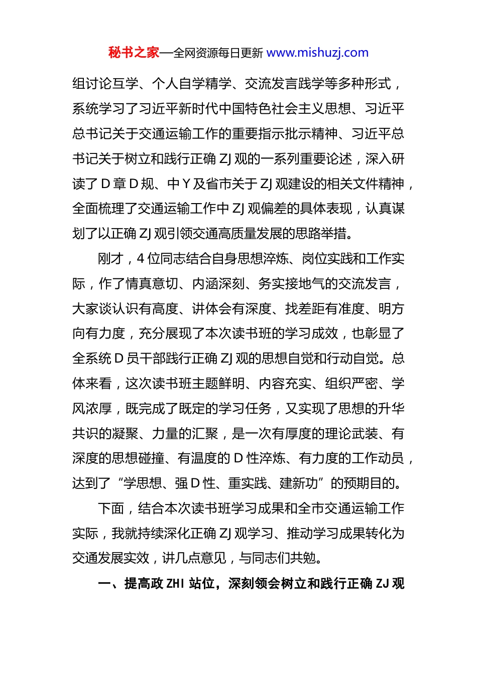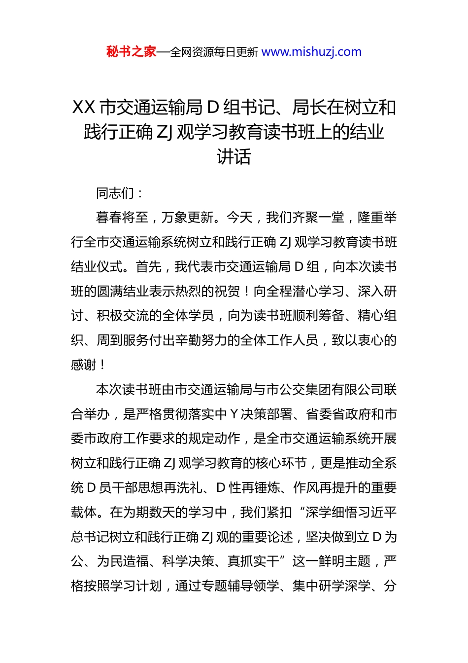 秘书之家—全网资源每日更新 www.mishuzj.comXX 市交通运输局 D 组书记、局长在树立和践行正确 ZJ 观学习教育读书班上的结业讲话同志们:暮春将至,万象更新。今天,我们齐聚一堂,隆重举行全市交通运输系统树立和践行正确 ZJ 观学习教育读书班结业仪式。首先,我代表市交通运输局 D 组,向本次读书班的圆满结业表示热烈的祝贺!向全程潜心学习、深入研讨、积极交流的全体学员,向为读书班顺利筹备、精心组织、周到服务付出辛勤努力的全体工作人员,致以衷心的感谢!本次读书班由市交通运输局与市公交集团有限公司联合举办,是严格贯彻落实中 Y 决策部署、省委省政府和市委市政府工作要求的规定动作,是全市交通运输系统开展树立和践行正确 ZJ 观学习教育的核心环节,更是推动全系统 D 员干部思想再洗礼、D 性再锤炼、作风再提升的重要载体。在为期数天的学习中,我们紧扣“深学细悟习近平总书记树立和践行正确 ZJ 观的重要论述,坚决做到立 D 为公、为民造福、科学决策、真抓实干”这一鲜明主题,严格按照学习计划,通过专题辅导领学、集中研学深学、分秘书之家—全网资源每日更新 www.mishuzj.com组讨论互学、个人自学精学、交流发言践学等多种形式,系统学习了习近平新时代中国特色社会主义思想、习近平总书记关于交通运输工作的重要指示批示精神、习近平总书记关于树立和践行正确 ZJ 观的一系列重要论述,深入研读了 D 章 D 规、中 Y 及省市关于 ZJ 观建设的相关文件精神,全面梳理了交通运输工作中 ZJ 观偏差的具体表现,认真谋划了以正确 ZJ 观引领交通高质量发展的思路举措。刚才,4 位同志结合自身思想淬炼、岗位实践和工作实际,作了情真意切、内涵深刻、务实接地气的交流发言,大家谈认识有高度、讲体会有深度、找差距有准度、明方向有力度,充分展现了本次读书班的学习成效,也彰显了全系统 D 员干部践行正确 ZJ 观的思想自觉和行动自觉。总体来看,这次读书班主题鲜明、内容充实、组织严密、学风浓厚,既完成了既定的学习任务,又实现了思想的升华共识的凝聚、力量的汇聚,是一次有厚度的理论武装、有深度的思想碰撞、有温度的 D 性淬炼、有力度的工作动员,达到了“学思想、强 D 性、重实践、建新功”的预期目的。下面,结合本次读书班学习成果和全市交通运输工作实际,我就持续深化正确 ZJ 观学习、推动学习成果转化为交通发展实效,讲几点意见,与同志们共勉。一、提高政 ZHI 站位,深刻领会树立和践行正确 ZJ 观秘书之家—全网资源每日更新 www.mishuzj.com的极端重要性与现实紧迫性ZJ 观是 D 员干部干事创业的“总开关”,是衡量 D 性修养、宗旨意识、价值追求的“试金石”,更是指引我们履职尽责、担当作为的“指南针”。习近平总书记反复强调:“各级领导干部要树立和践行正确 ZJ 观,坚持实事求是,力戒形式主义、官僚主义,坚持功成不必在我、功成必定有我,做出经得起实践、人民、历史检验的实绩。”对于交通运输系统而言,交通是国民经济的“先行官”、民生保障的“生命线”、城市发展的“硬支撑”,我们的每一项决策、每一个项目、每一次服务,都直接关系群众切身利益、关系城市发展大局、关系行业长远未来。树立和践行正确 ZJ 观,不是抽象的政 ZHI 要求,而是具体的实践课题,具有极端重要性和现实紧迫性。(一)树立和践行正确 ZJ 观,是践行“两个维护”的根本政 ZHI 要求旗帜鲜明讲政 ZHI 是我们 D 作为马克思主义政 D 的根本要求,而正确 ZJ 观本质上是政 ZHI 观。中 Y 反复强调树立和践行正确 ZJ 观,根本目的是引导 D 员干部始终站稳政ZHI 立场、把准政 ZHI 方向、严守政 ZHI 纪律,始终在思想上政 ZHI 上行动上同以习近平同志为核心的 D 中 Y 保持高度一致。交通运输系统作为 D 和政府服务群众、推动发秘书之家—全网资源每日更新 www.mishuzj.com展的重要职能部门,首先是政 ZHI 机关,必须把正确 ZJ 观作为首要政 ZHI 标尺,深刻认识到“ZJ 为谁立、立什么样的 ZJ、怎样立 ZJ”,本质上是政 ZHI 立场、政 ZHI 方向、政 ZHI ...