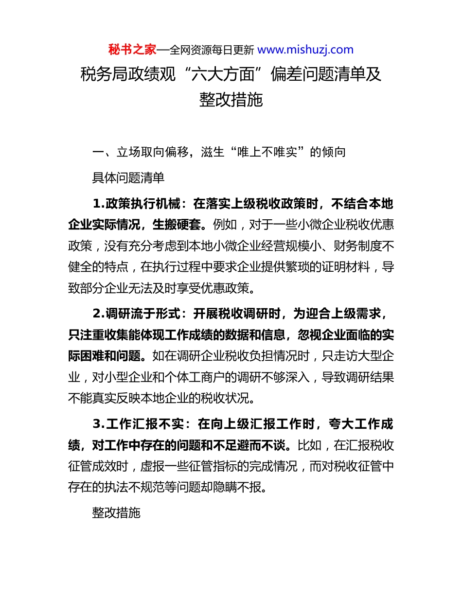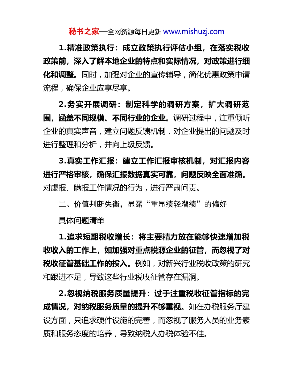 秘书之家—全网资源每日更新 www.mishuzj.com税务局政绩观“六大方面”偏差问题清单及整改措施一、立场取向偏移,滋生“唯上不唯实”的倾向具体问题清单1.政策执行机械:在落实上级税收政策时,不结合本地企业实际情况,生搬硬套。例如,对于一些小微企业税收优惠政策,没有充分考虑到本地小微企业经营规模小、财务制度不健全的特点,在执行过程中要求企业提供繁琐的证明材料,导致部分企业无法及时享受优惠政策。2.调研流于形式:开展税收调研时,为迎合上级需求,只注重收集能体现工作成绩的数据和信息,忽视企业面临的实际困难和问题。如在调研企业税收负担情况时,只走访大型企业,对小型企业和个体工商户的调研不够深入,导致调研结果不能真实反映本地企业的税收状况。3.工作汇报不实:在向上级汇报工作时,夸大工作成绩,对工作中存在的问题和不足避而不谈。比如,在汇报税收征管成效时,虚报一些征管指标的完成情况,而对税收征管中存在的执法不规范等问题却隐瞒不报。整改措施秘书之家—全网资源每日更新 www.mishuzj.com1.精准政策执行:成立政策执行评估小组,在落实税收政策前,深入了解本地企业的特点和实际情况,对政策进行细化和调整。同时,加强对企业的宣传辅导,简化优惠政策申请流程,确保企业应享尽享。2.务实开展调研:制定科学的调研方案,扩大调研范围,涵盖不同规模、不同行业的企业。调研过程中,注重倾听企业的真实声音,建立问题反馈机制,对企业提出的问题及时进行整理和分析,并向上级反馈。3.真实工作汇报:建立工作汇报审核机制,对汇报内容进行严格审核,确保汇报数据真实可靠,问题反映全面准确。对虚报、瞒报工作情况的行为,进行严肃问责。二、价值判断失衡,显露“重显绩轻潜绩”的偏好具体问题清单1.追求短期税收增长:将主要精力放在能够快速增加税收收入的工作上,如加强对重点税源企业的征管,而忽视了对税收征管基础工作的投入。例如,对新兴行业税收政策的研究和跟进不足,导致这些行业税收征管存在漏洞。2.忽视纳税服务质量提升:过于注重税收征管指标的完成情况,对纳税服务质量的提升不够重视。如在办税服务厅建设方面,只追求硬件设施的完善,而忽视了服务人员的业务素质和服务态度的培养,导致纳税人办税体验不佳。秘书之家—全网资源每日更新 www.mishuzj.com3.轻视税收风险管理:为了追求表面的税收征管成效,对税收风险管理工作不够重视。在风险识别、评估和应对方面投入的人力和物力不足,导致一些潜在的税收风险未能及时发现和处理。整改措施1.树立长远发展理念:制定税收工作长远规划,将短期税收增长与长期税收可持续发展相结合。加强对新兴行业税收政策的研究和制定,完善税收征管体系,为税收收入的稳定增长奠定基础。2.强化纳税服务意识:建立纳税服务质量考核机制,将纳税服务质量纳入绩效考核体系。加强对服务人员的培训和教育,提高服务人员的业务素质和服务意识。定期开展纳税人满意度调查,根据调查结果及时改进服务工作。3.加强税收风险管理:成立税收风险管理团队,加大对税收风险识别、评估和应对的投入。建立税收风险预警机制,及时发现和处理潜在的税收风险。加强与其他部门的协作配合,形成税收风险管理合力。三、推进方式走偏,暴露“重形式轻实效”的问题具体问题清单1.工作落实走过场:在推进税收工作时,只注重形式,不注重实际效果。例如,在开展税收宣传月活动时,只是简单秘书之家—全网资源每日更新 www.mishuzj.com地发放宣传资料、举办几场讲座,没有真正将税收政策宣传到纳税人心中,纳税人对税收政策的知晓率和理解度没有得到有效提高。2.会议文件过多过滥:以会议落实会议、以文件落实文件的现象较为严重,导致基层税务干部将大量时间和精力耗费在会议和文件上,真正用于实际工作的时间减少。比如,一些会议内容空洞,缺乏针对性和可操作性,会议开完后没有实际效果。3.工作创新形式化:在工作创新方面,只追求创新的形式,不注重创新的实际效果。例如,推出一些新的办税服务举措,但在实际运行过程中,由于缺乏充分的调研和论证,导致这些举措无法满足纳税人的实际需求,反而增加了纳税人的...