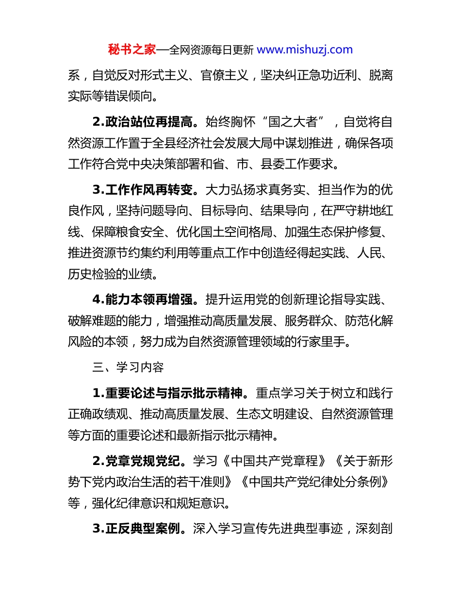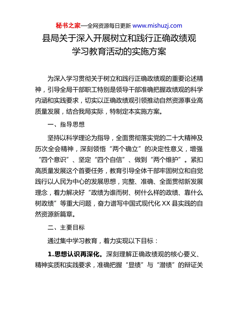 秘书之家—全网资源每日更新 www.mishuzj.com县局关于深入开展树立和践行正确政绩观学习教育活动的实施方案为深入学习贯彻关于树立和践行正确政绩观的重要论述精神,引导全局干部职工特别是领导干部准确把握政绩观的科学内涵和实践要求,切实以正确政绩观引领推动自然资源事业高质量发展,结合我局实际,特制定本实施方案。一、指导思想坚持以科学理论为指导,全面贯彻落实党的二十大精神及历次全会精神,深刻领悟“两个确立”的决定性意义,增强“四个意识”、坚定“四个自信”、做到“两个维护”。紧扣高质量发展这个首要任务,教育引导全体干部牢固树立和自觉践行以人民为中心的发展思想,完整、准确、全面贯彻新发展理念,着力解决好“政绩为谁而树、树什么样的政绩、靠什么树政绩”等重大问题,奋力谱写中国式现代化 XX 县实践的自然资源新篇章。二、主要目标通过集中学习教育,着力实现以下目标:1.思想认识再深化。深刻理解正确政绩观的核心要义、精神实质和实践要求,准确把握“显绩”与“潜绩”的辩证关秘书之家—全网资源每日更新 www.mishuzj.com系,自觉反对形式主义、官僚主义,坚决纠正急功近利、脱离实际等错误倾向。2.政治站位再提高。始终胸怀“国之大者”,自觉将自然资源工作置于全县经济社会发展大局中谋划推进,确保各项工作符合党中央决策部署和省、市、县委工作要求。3.工作作风再转变。大力弘扬求真务实、担当作为的优良作风,坚持问题导向、目标导向、结果导向,在严守耕地红线、保障粮食安全、优化国土空间格局、加强生态保护修复、推进资源节约集约利用等重点工作中创造经得起实践、人民、历史检验的业绩。4.能力本领再增强。提升运用党的创新理论指导实践、破解难题的能力,增强推动高质量发展、服务群众、防范化解风险的本领,努力成为自然资源管理领域的行家里手。三、学习内容1.重要论述与指示批示精神。重点学习关于树立和践行正确政绩观、推动高质量发展、生态文明建设、自然资源管理等方面的重要论述和最新指示批示精神。2.党章党规党纪。学习《中国共产党章程》《关于新形势下党内政治生活的若干准则》《中国共产党纪律处分条例》等,强化纪律意识和规矩意识。3.正反典型案例。深入学习宣传先进典型事迹,深刻剖秘书之家—全网资源每日更新 www.mishuzj.com析违背正确政绩观的典型案例,特别是自然资源领域发生的突出问题,开展警示教育。4.政策法规与业务知识。结合自然资源核心职能,深化对《土地管理法》《城乡规划法》《矿产资源法》等法律法规及最新政策文件的学习理解,提升专业素养。四、方法步骤学习教育活动自 2026 年 X 月 X 日开始,至 X 月 X日结束,分为三个阶段进行:(一)动员部署与专题学习阶段(X 月 X 日-X 月 X 日)1.动员部署。召开全局动员大会,印发实施方案,明确目标任务和工作要求,统一思想认识。2.集中学习。采取党组理论学习中心组学习、党支部“三会一课”、主题党日、专题读书班等形式,组织全体干部原原本本学、深入研讨学。3.个人自学。制定个人学习计划,利用“学习强国”等平台,认真研读指定学习材料,撰写学习心得。(二)研讨交流与对照检视阶段(X 月 X 日-X 月 X 日)1.专题研讨。围绕“如何立足自然资源岗位树立和践行正确政绩观”等主题,分层分类开展研讨交流,班子成员带头谈认识、谈体会、谈举措。秘书之家—全网资源每日更新 www.mishuzj.com2.对照检视。全体干部特别是领导干部,要对照正确政绩观要求,深入查摆在思想观念、工作作风、政策执行、项目推进、服务群众等方面存在的偏差和不足,形成问题清单。3.征求意见。通过座谈访谈、设置意见箱、发放问卷等方式,广泛听取服务对象、基层单位、干部职工的意见建议。(三)整改落实与总结提升阶段(X 月 X 日-X 月 X 日)1.制定整改措施。针对查摆出的问题和征求到的意见,逐项制定整改措施,明确整改时限和责任人,实行台账管理。2.推动建章立制。结合整改,梳理完善相关制度规定,特别是在规划审批、用地监管、矿政管理、执法监察等方面,健全体现正确政绩观的考核评价、决策机制和工作规范。3.全面总结评...