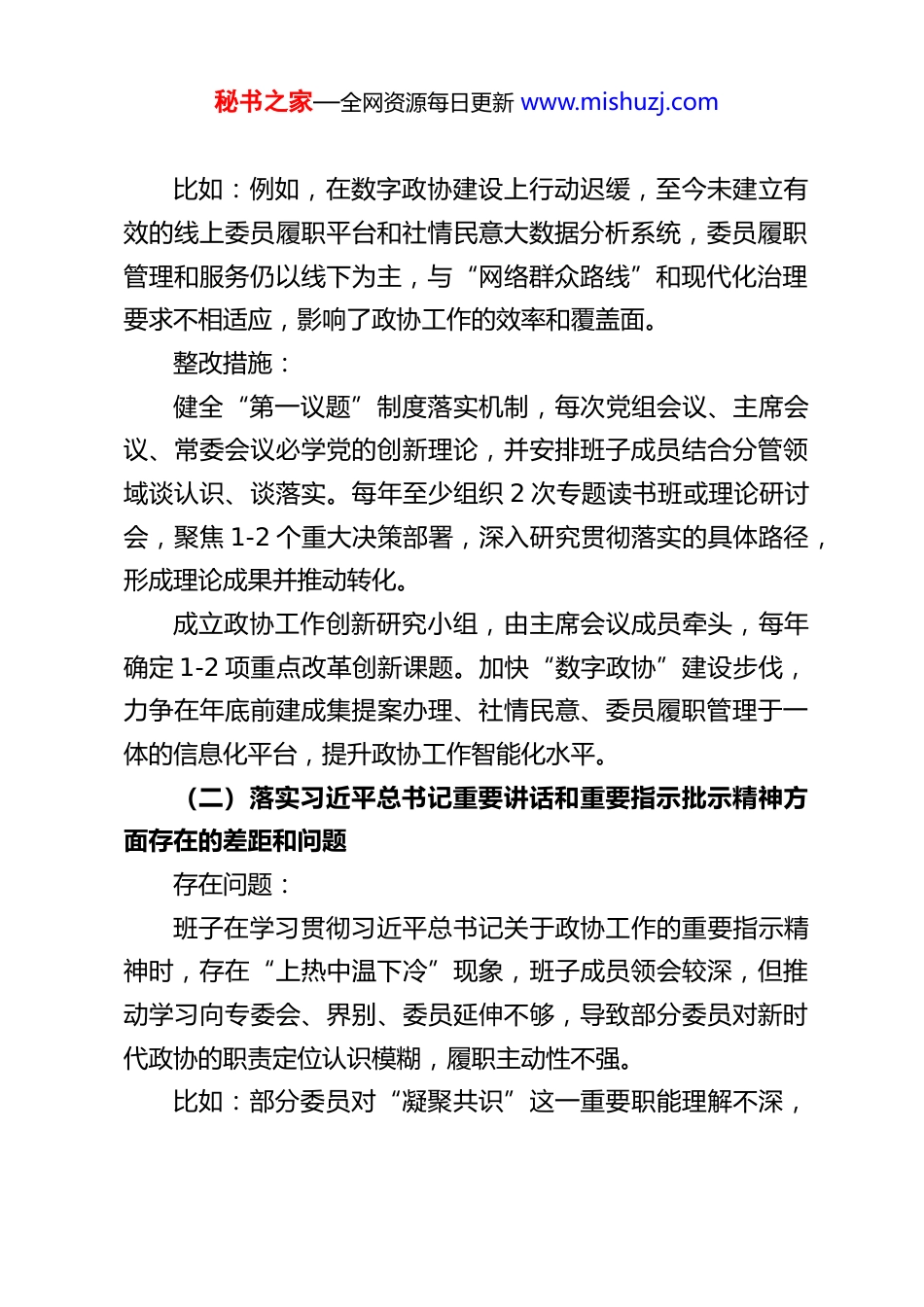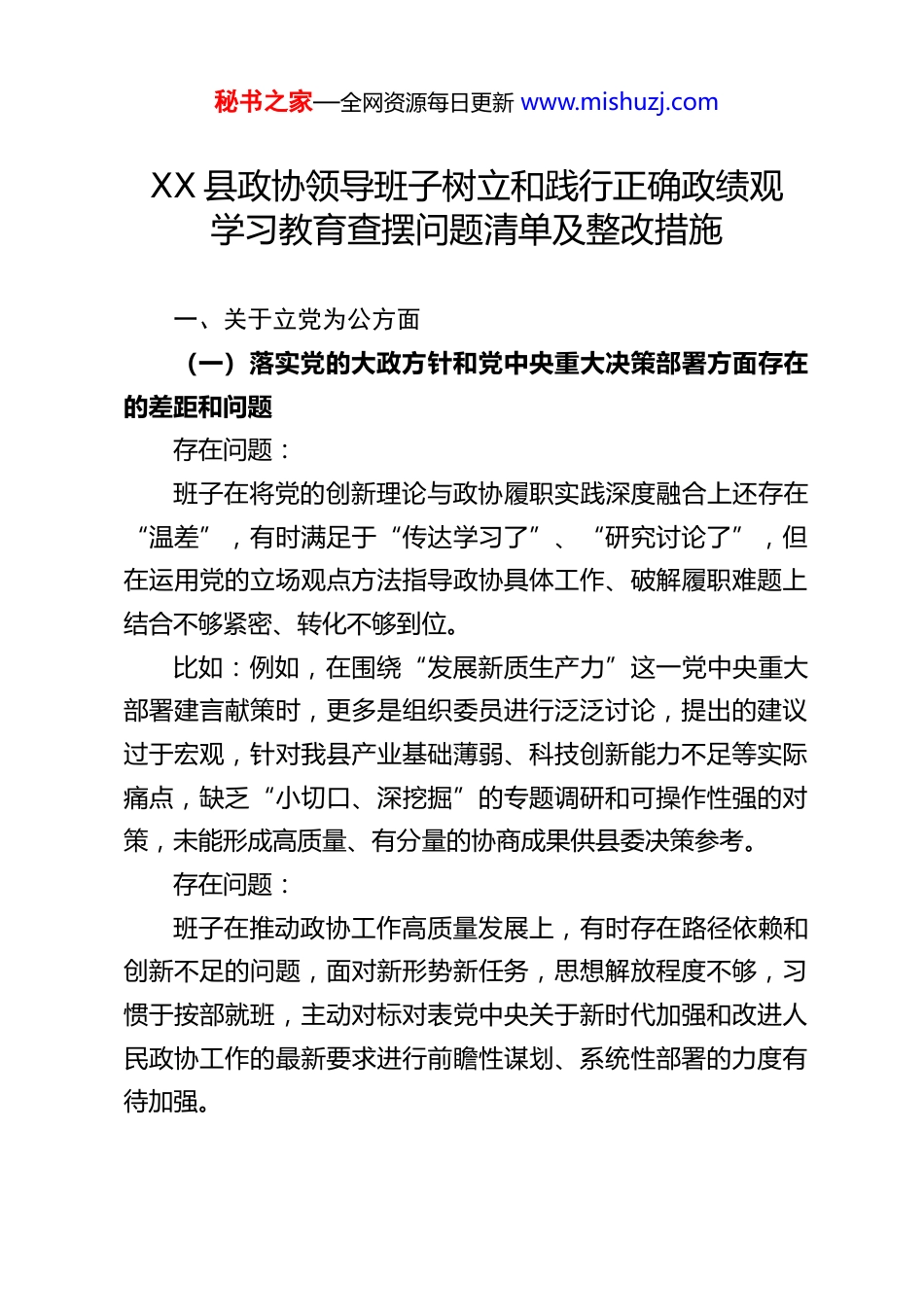 秘书之家—全网资源每日更新 www.mishuzj.comXX 县政协领导班子树立和践行正确政绩观学习教育查摆问题清单及整改措施一、关于立党为公方面(一)落实党的大政方针和党中央重大决策部署方面存在的差距和问题存在问题:班子在将党的创新理论与政协履职实践深度融合上还存在“温差”,有时满足于“传达学习了”、“研究讨论了”,但在运用党的立场观点方法指导政协具体工作、破解履职难题上结合不够紧密、转化不够到位。比如:例如,在围绕“发展新质生产力”这一党中央重大部署建言献策时,更多是组织委员进行泛泛讨论,提出的建议过于宏观,针对我县产业基础薄弱、科技创新能力不足等实际痛点,缺乏“小切口、深挖掘”的专题调研和可操作性强的对策,未能形成高质量、有分量的协商成果供县委决策参考。存在问题:班子在推动政协工作高质量发展上,有时存在路径依赖和创新不足的问题,面对新形势新任务,思想解放程度不够,习惯于按部就班,主动对标对表党中央关于新时代加强和改进人民政协工作的最新要求进行前瞻性谋划、系统性部署的力度有待加强。秘书之家—全网资源每日更新 www.mishuzj.com比如:例如,在数字政协建设上行动迟缓,至今未建立有效的线上委员履职平台和社情民意大数据分析系统,委员履职管理和服务仍以线下为主,与“网络群众路线”和现代化治理要求不相适应,影响了政协工作的效率和覆盖面。整改措施:健全“第一议题”制度落实机制,每次党组会议、主席会议、常委会议必学党的创新理论,并安排班子成员结合分管领域谈认识、谈落实。每年至少组织 2 次专题读书班或理论研讨会,聚焦 1-2 个重大决策部署,深入研究贯彻落实的具体路径,形成理论成果并推动转化。成立政协工作创新研究小组,由主席会议成员牵头,每年确定 1-2 项重点改革创新课题。加快“数字政协”建设步伐,力争在年底前建成集提案办理、社情民意、委员履职管理于一体的信息化平台,提升政协工作智能化水平。(二)落实习近平总书记重要讲话和重要指示批示精神方面存在的差距和问题存在问题:班子在学习贯彻习近平总书记关于政协工作的重要指示精神时,存在“上热中温下冷”现象,班子成员领会较深,但推动学习向专委会、界别、委员延伸不够,导致部分委员对新时代政协的职责定位认识模糊,履职主动性不强。比如:部分委员对“凝聚共识”这一重要职能理解不深,秘书之家—全网资源每日更新 www.mishuzj.com在联系界别群众时,仅限于通报情况,主动宣传政策、解疑释惑、引导预期做得不够。例如,在去年涉及某项产业政策调整时,未能及时组织相关界别委员向企业和群众做好政策解读,导致出现了一些不必要的疑虑。存在问题:对标习近平总书记“懂政协、会协商、善议政”的要求,班子在提升协商议政质效上还有短板,有时协商活动准备不够充分,调研不深,导致建言献策的针对性、操作性不强,存在“自说自话”、“自拉自唱”的现象。比如:去年围绕“优化营商环境”开展的专题议政性常委会会议,会前调研主要集中在政府部门和部分大型企业,对中小微企业、个体工商户的实际困难倾听不够,提出的部分建议与市场主体的真实感受有偏差,未能完全切中要害。整改措施:制定分层次、全覆盖的学习培训计划,每年至少组织 1 次全体委员履职能力培训,将习近平总书记关于加强和改进人民政协工作的重要思想作为核心课程。建立主席会议成员、常委联系界别、委员小组制度,定期下沉指导学习、传达精神。完善协商于决策之前和决策实施之中的落实机制。规范协商议题提出、活动组织、成果报送、办理反馈等全流程。推行“调研-协商-监督-再协商”闭环模式,对重点协商成果落实情况开展民主监督,确保议政议到关键处、建言建在需要时。秘书之家—全网资源每日更新 www.mishuzj.com(三)树立“全国一盘棋”思想、服务服从大局方面存在的差距和问题存在问题:班子在谋划政协工作时,有时站位不够高,未能完全自觉地将政协工作置于全县乃至全省、全国发展大局中去思考、去推进,存在一定的“部门思维”,围绕中心、服务大局的聚焦度有待提升。比如:在组织委员围绕长三角一体化发展等国家战略建言时,更多考...