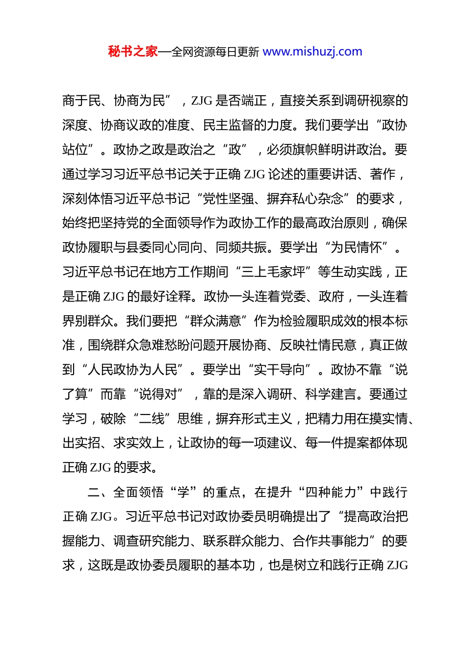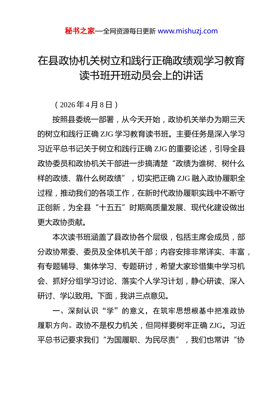 秘书之家—全网资源每日更新 www.mishuzj.com在县政协机关树立和践行正确政绩观学习教育读书班开班动员会上的讲话 (2026 年 4 月 8 日)按照县委统一部署,从今天开始,政协机关举办为期三天的树立和践行正确 ZJG 学习教育读书班。主要任务是深入学习习近平总书记关于树立和践行正确 ZJG 的重要论述,引导全县政协委员和政协机关干部进一步搞清楚“政绩为谁树、树什么样的政绩、靠什么树政绩”,切实把正确 ZJG 融入政协履职全过程,推动我们的各项工作,在新时代政协履职实践中不断守正创新,为全县“十五五”时期高质量发展、现代化建设做出更大政协贡献。本次读书班涵盖了县政协各个层级,包括主席会成员,部分政协常委、委员及全体机关干部;内容安排非常详实、丰富,有专题辅导、集体学习、专题研讨,希望大家珍惜集中学习机会、抓好分组学习讨论、落实个人学习计划,静心研读、深入研讨、学以致用。下面,我讲三点意见。一、深刻认识“学”的意义,在筑牢思想根基中把准政协履职方向。政协不是权力机关,但同样要树牢正确 ZJG。习近平总书记要求我们“为国履职、为民尽责”,我们也常讲“协秘书之家—全网资源每日更新 www.mishuzj.com商于民、协商为民”,ZJG 是否端正,直接关系到调研视察的深度、协商议政的准度、民主监督的力度。我们要学出“政协站位”。政协之政是政治之“政”,必须旗帜鲜明讲政治。要通过学习习近平总书记关于正确 ZJG 论述的重要讲话、著作,深刻体悟习近平总书记“党性坚强、摒弃私心杂念”的要求,始终把坚持党的全面领导作为政协工作的最高政治原则,确保政协履职与县委同心同向、同频共振。要学出“为民情怀”。习近平总书记在地方工作期间“三上毛家坪”等生动实践,正是正确 ZJG 的最好诠释。政协一头连着党委、政府,一头连着界别群众。我们要把“群众满意”作为检验履职成效的根本标准,围绕群众急难愁盼问题开展协商、反映社情民意,真正做到“人民政协为人民”。要学出“实干导向”。政协不靠“说了算”而靠“说得对”,靠的是深入调研、科学建言。要通过学习,破除“二线”思维,摒弃形式主义,把精力用在摸实情、出实招、求实效上,让政协的每一项建议、每一件提案都体现正确 ZJG 的要求。二、全面领悟“学”的重点,在提升“四种能力”中践行正确 ZJG。习近平总书记对政协委员明确提出了“提高政治把握能力、调查研究能力、联系群众能力、合作共事能力”的要求,这既是政协委员履职的基本功,也是树立和践行正确 ZJG秘书之家—全网资源每日更新 www.mishuzj.com的具体着力点。本次读书班要紧紧围绕“立党为公、为民造福、科学决策、真抓实干”的总要求,围绕这“四种能力”,在四个方面下功夫、见实效。一是提高政治把握能力,坚定“立党为公”的政治站位。政治把握能力是政协委员的首要能力。在读书学习中,要重点研读习近平总书记关于正确 ZJG 的重要论述,深刻理解“只有党性坚强、摒弃私心杂念,才能保证 ZJG 不出偏差”。政协履职中,无论是调研视察还是协商议政,都要首先从政治上看、从大局上想,确保建言献策不偏方向、民主监督不越红线。要自觉把政协工作放到全县发展大局中谋划,围绕县委中心工作献计出力,做到“县委有号召、政协有行动,县委有部署、政协有落实”,把正确 ZJG 体现在为党分忧、为国履职、为民尽责的实际行动中。二是提高调查研究能力,增强“科学决策”的能力和水平。调查研究是政协工作的“压舱石”,也是正确 ZJG 的实践基础。习近平总书记强调,“调查研究是谋事之基、成事之道”。我们要把提高调查研究能力作为践行正确 ZJG 的重要抓手,坚持“不调研不协商、不调研不建言”。读书班期间,要结合学习习近平总书记的调研方法,反思我们各委牵头搞的调研是否存在“走马观花”“蜻蜓点水”的问题。在我们的履职实践中,秘书之家—全网资源每日更新 www.mishuzj.com要围绕全县“五件大事”、项目建设、产业发展、环境保护等重点任务,深入基层、深入一线,摸实情、听真话、找症结,站在一线决策的角度看问题、想办法,提出符合实际、符合民意、符合规律的建议,确...