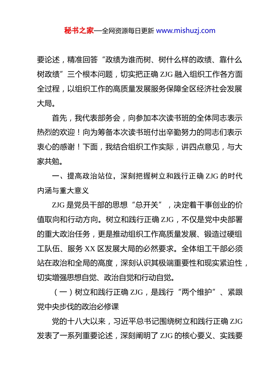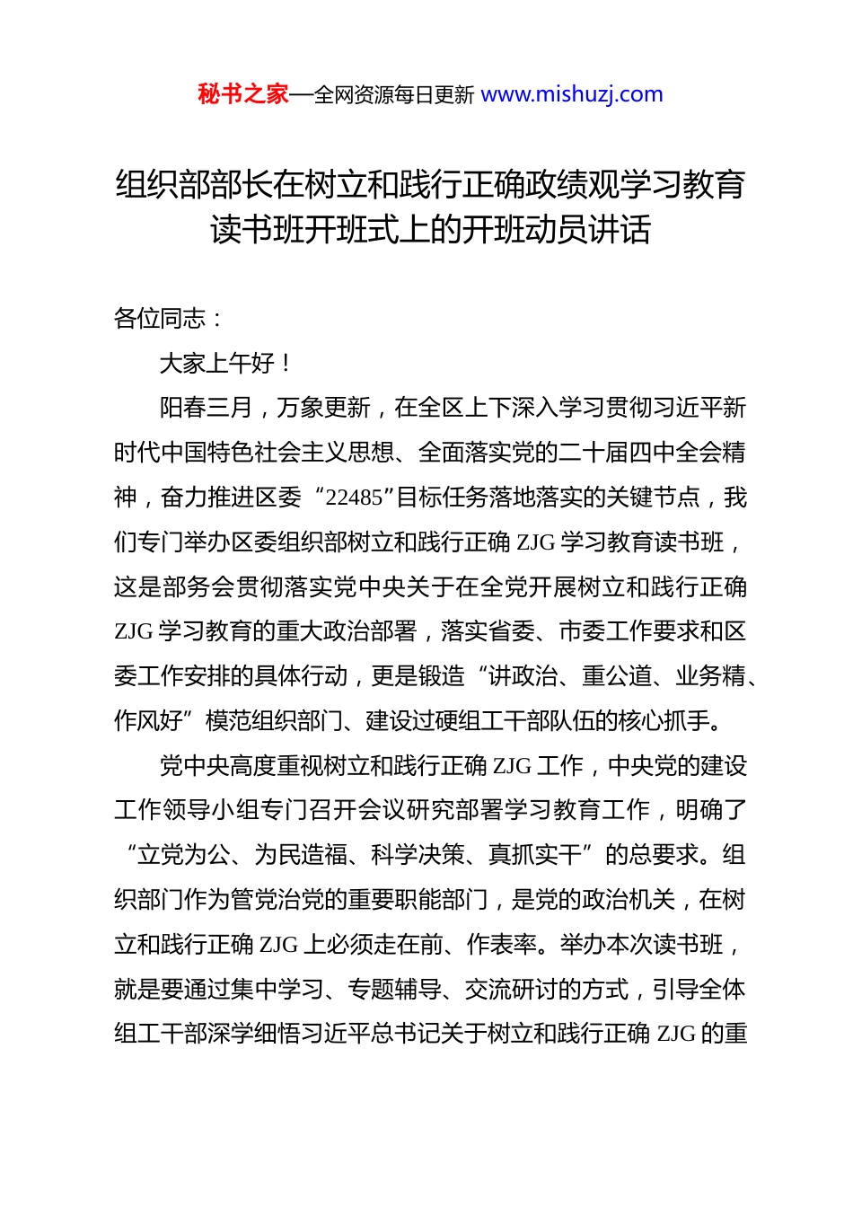 秘书之家—全网资源每日更新 www.mishuzj.com组织部部长在树立和践行正确政绩观学习教育读书班开班式上的开班动员讲话 各位同志:大家上午好!阳春三月,万象更新,在全区上下深入学习贯彻习近平新时代中国特色社会主义思想、全面落实党的二十届四中全会精神,奋力推进区委“22485”目标任务落地落实的关键节点,我们专门举办区委组织部树立和践行正确 ZJG 学习教育读书班,这是部务会贯彻落实党中央关于在全党开展树立和践行正确ZJG 学习教育的重大政治部署,落实省委、市委工作要求和区委工作安排的具体行动,更是锻造“讲政治、重公道、业务精、作风好”模范组织部门、建设过硬组工干部队伍的核心抓手。党中央高度重视树立和践行正确 ZJG 工作,中央党的建设工作领导小组专门召开会议研究部署学习教育工作,明确了“立党为公、为民造福、科学决策、真抓实干”的总要求。组织部门作为管党治党的重要职能部门,是党的政治机关,在树立和践行正确 ZJG 上必须走在前、作表率。举办本次读书班,就是要通过集中学习、专题辅导、交流研讨的方式,引导全体组工干部深学细悟习近平总书记关于树立和践行正确 ZJG 的重秘书之家—全网资源每日更新 www.mishuzj.com要论述,精准回答“政绩为谁而树、树什么样的政绩、靠什么树政绩”三个根本问题,切实把正确 ZJG 融入组织工作各方面全过程,以组织工作的高质量发展服务保障全区经济社会发展大局。首先,我代表部务会,向参加本次读书班的全体同志表示热烈的欢迎!向为筹备本次读书班付出辛勤努力的同志们表示衷心的感谢!下面,我结合组织工作实际,讲四点意见,与大家共勉。一、提高政治站位,深刻把握树立和践行正确 ZJG 的时代内涵与重大意义ZJG 是党员干部的思想“总开关”,决定着干事创业的价值取向和行动方向。树立和践行正确 ZJG,不仅是党中央部署的重大政治任务,更是推动组织工作高质量发展、锻造过硬组工队伍、服务 XX 区发展大局的必然要求。全体组工干部必须站在政治和全局的高度,深刻认识其极端重要性和现实紧迫性,切实增强思想自觉、政治自觉和行动自觉。(一)树立和践行正确 ZJG,是践行“两个维护”、紧跟党中央步伐的政治必修课党的十八大以来,习近平总书记围绕树立和践行正确 ZJG发表了一系列重要论述,深刻阐明了 ZJG 的核心要义、实践要秘书之家—全网资源每日更新 www.mishuzj.com求和时代内涵,为我们指明了前进方向、提供了根本遵循。党中央决定在全党开展树立和践行正确 ZJG 学习教育,是推进党的建设新的伟大工程的重要举措,对于筑牢全党思想根基、凝聚干事创业合力、推进全面从严治党具有重大而深远的意义。组织部门作为政治机关,旗帜鲜明讲政治是第一要求,践行“两个维护”是最高政治原则。我们的一切工作,都是党和人民事业的重要组成部分,ZJG 是否正确,直接关系到党的路线方针政策在 XX 区的落地成效,关系到“两个维护”是否真正落到实处。全体组工干部必须把树立和践行正确 ZJG 作为践行“两个维护”的具体行动,深刻领会党中央部署学习教育的战略考量,主动把自己摆进去、把职责摆进去、把工作摆进去,以坚定的政治立场、鲜明的政治态度、务实的政治行动,紧跟党中央步伐,确保组织工作始终沿着正确政治方向前进。(二)树立和践行正确 ZJG,是推动组织工作高质量发展、服务 XX 区发展大局的必然要求高质量发展是全面建设社会主义现代化国家的首要任务,组织工作作为党的建设的重要组成部分,必须把推动高质量发展作为主旋律、大方向人民日报。区委立足 XX 区发展实际,提出了“22485”目标任务,这是全区当前和今后一个时期的中心工作,也是组织工作服务大局的核心抓手。抓好组织工作,秘书之家—全网资源每日更新 www.mishuzj.com就是要为区委“22485”目标任务落地落实提供坚强的组织保证、干部保证和人才保证。ZJG 是组织工作高质量发展的“导航仪”,如果 ZJG 出现偏差,组织工作就会偏离中心、脱离实际,就会出现重形式轻内容、重表面轻实效、重当前轻长远的问题。比如,在干部工作中如果只看短期业绩不看长远贡献,在基层党建中如果只重阵地建...