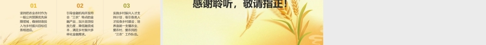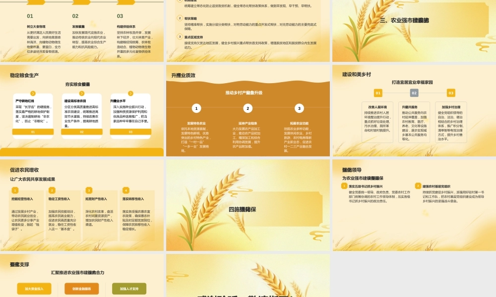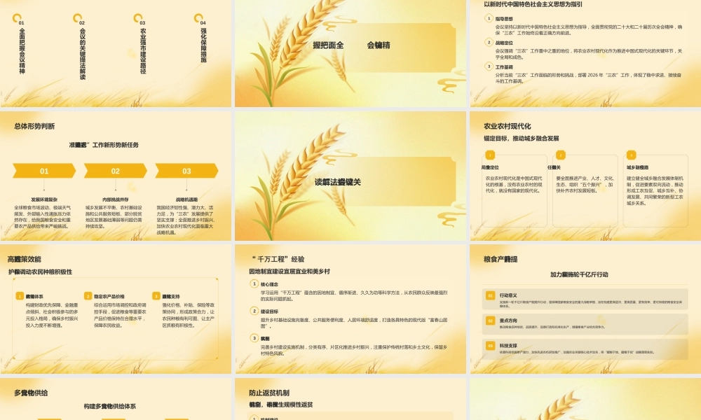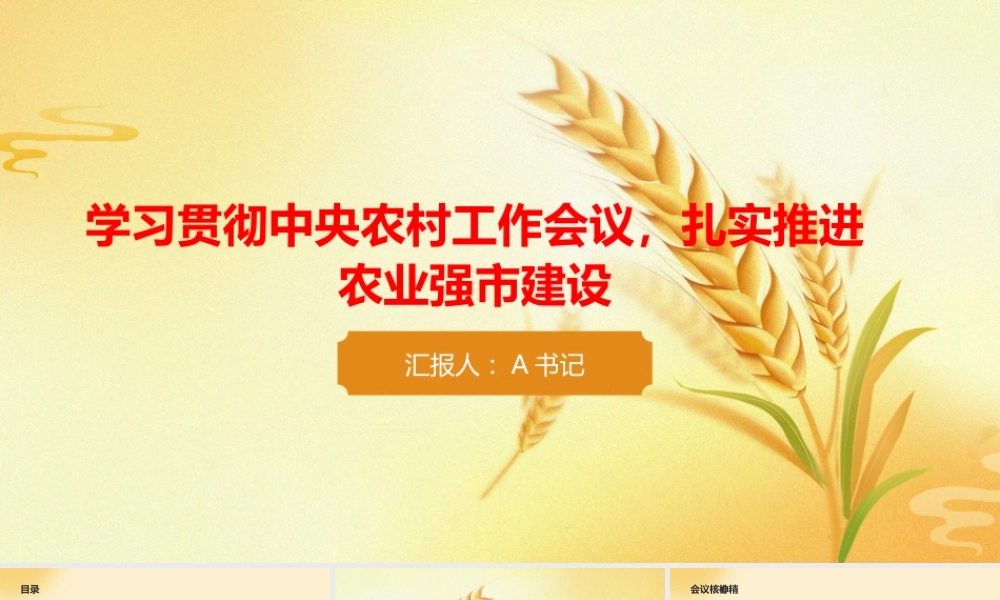 学习贯彻中央农村工作会议,扎实推进农业强市建设汇报人: A 书记01全面把握会议精神02会议的关键提法解读03农业强市建设路径04强化保障措施目录一、全握把面会议精神以新时代中国特色社会主义思想为指引1指导思想会议坚持以新时代中国特色社会主义思想为指导,全面贯彻党的二十大和二十届历次全会精神,确保“三农”工作始终沿着正确方向前进。2战略定位会议强调“三农”工作重中之重的地位,将农业农村现代化作为推进中国式现代化的关键环节,关乎全局和成色。3工作基调分析当前“三农”工作面临的形势和挑战,部署 2026 年“三农”工作,体现了稳中求进、接续奋斗的工作基调。会议核心精神准确把握“三农”工作新形势新任务01发展环境复杂全球粮食市场波动、极端天气频发、外部输入性通胀压力依然存在,给我国粮食安全和重要农产品供给带来严峻挑战。02内部挑战并存城乡发展不平衡、农村基础设施和公共服务短板、部分脱贫地区发展基础薄弱等问题仍需持续攻坚。03战略机遇期我国经济韧性强、潜力大、活力足,为“三农”发展提供了坚实支撑;全面推进乡村振兴、加快农业农村现代化面临重大战略机遇。总体形势判断二、会议关读解法提键锚定目标,推动城乡融合发展农业农村现代化是中国式现代化的根基,没有农业农村的现代化,就没有国家的现代化。全局性定位1要全面推进产业、人才、文化、生态、组织“五个振兴”,加快补齐农村发展短板。键关任务2建立健全城乡融合发展体制机制,促进要素双向流动,推动形成工农互促、城乡互补、协调发展、共同繁荣的新型工农城乡关系。城乡融合路径3农业农村现代化1优化政策体系构建财政优先保障、金融重点倾斜、社会积极参与的多元投入格局,确保乡村振兴投入力度不断增强。2稳定农产品价格综合运用市场调控和政府调控手段,促进粮食等重要农产品价格保持在合理水平,保障农民收益。3强化政策支持强化价格、补贴、保险等政策协同,形成政策合力,让农民种粮有利可图、让主产区抓粮有积极性。保护和调动农民种粮积极性提高政策效能因地制宜建设宜居宜业和美乡村核心理念学习运用“千万工程”蕴含的因地制宜、循序渐进、久久为功等科学方法,从农民群众反映最强烈的实际问题抓起。1建设目标提升乡村基础设施完备度、公共服务便利度、人居环境舒适度,打造各具特色的现代版“富春山居图”。2实施机制完善乡村建设实施机制,分类有序、片区化推进乡村振兴,注重保护传统村落和乡土文化,保留乡村特色风貌。3“ 千万工程”经验加力实施新一轮千亿斤行动行动意义实施新一轮千亿斤粮食产能提升行动,是保障国家粮食安全的重大战略举措,旨在构建更高层次、更高质量、更有效率、更可持续的粮食安全保障体系。01重点方向推动粮食品种培优、品质提升、品牌打造和标准化生产,增强粮食产业综合竞争力。02科技支撑依靠科技挖掘单产潜力,加快先进农机研发推广,加强农业关键核心技术攻关,将“藏粮于地、藏粮于技”战略落到实处。03粮食产能提升构建多元化食物供给体系树立大食物观从更好满足人民美好生活需要出发,向耕地草原森林海洋、向植物动物微生物要热量、要蛋白,全方位多途径开发食物资源。01发展设施农业加快发展现代设施农业,推动传统农业向现代农业转型,提高农业综合生产能力和抗风险能力。02构建供给体系坚持农林牧渔并举,发展林下经济,壮大林草产业,构建粮经饲统筹、农林牧渔结合、植物动物微生物并重的多元化食物供给体系。03多元化食物供给健全机制,确保不发生规模性返贫1机制建设统筹建立常态化防止返贫致贫机制,健全常态化帮扶政策体系,做到早发现、早干预、早帮扶。2帮扶策略坚持精准帮扶,实施分层分类帮扶,对有劳动能力的重点开发式帮扶,对无劳动能力的主要兜底式保障。3重点区域支持接续支持欠发达地区发展,健全乡村振兴重点帮扶县支持政策,增强脱贫地区和脱贫群众内生发展动力。防止返贫机制三、农业强市建设的实施径路夯实粮食安全根基01严守耕地红线采取“长牙齿”的硬措施,落实最严格的耕地保护制度,坚决遏制耕地“非农化”、防止“非粮化”。02建设高标准农田分区分类高质量推进高标准农田建设,统筹推进高效...