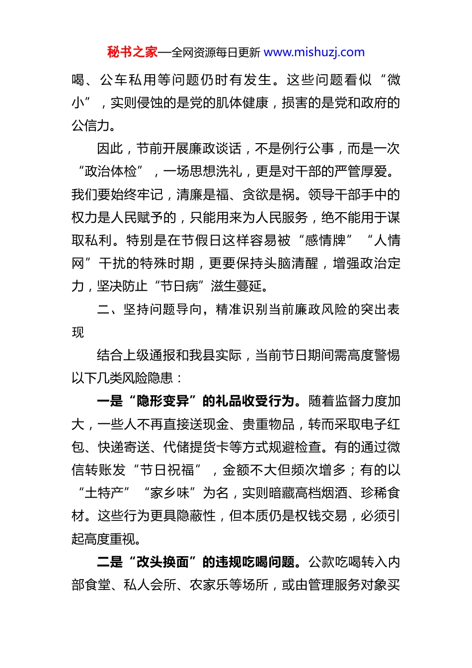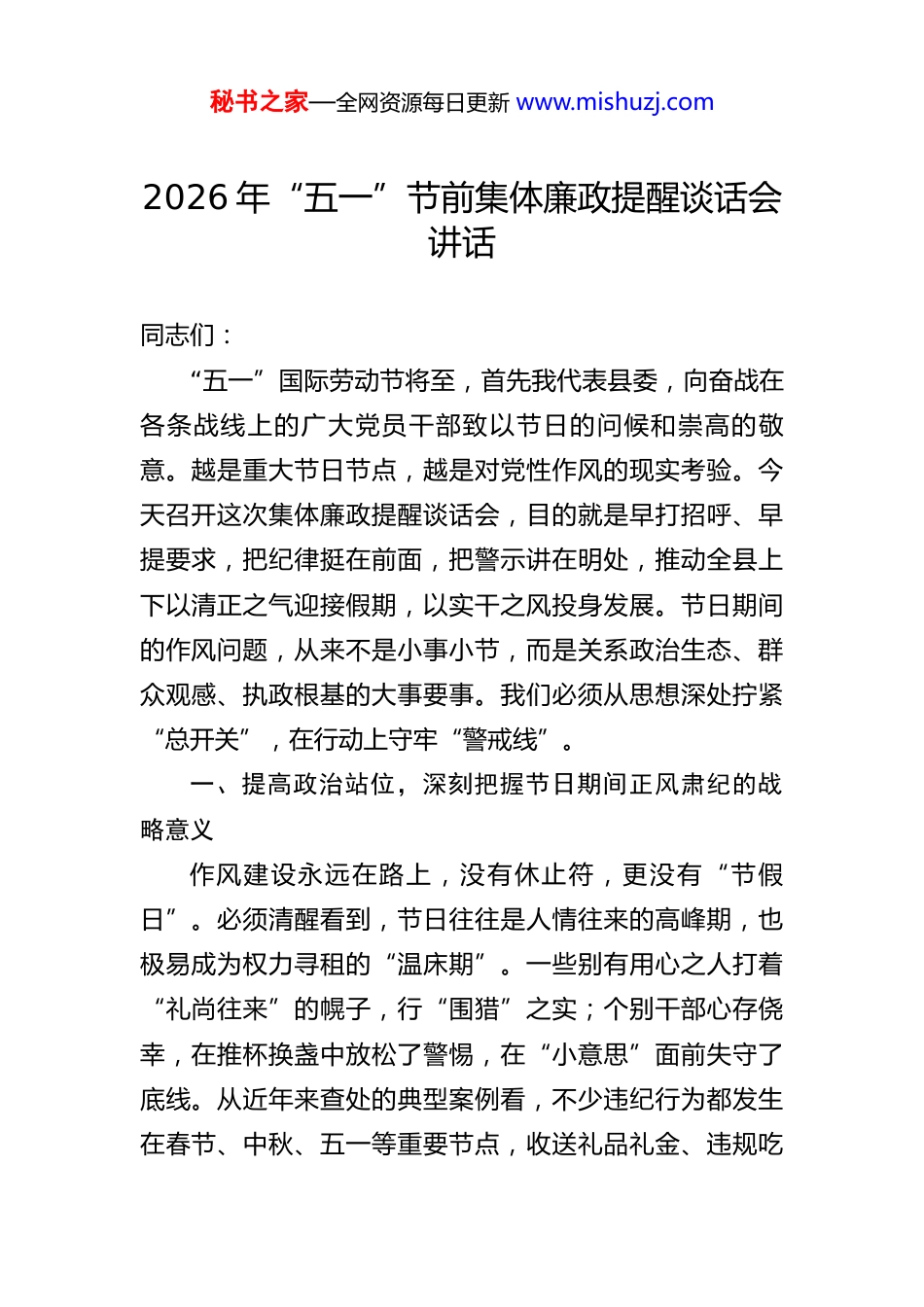秘书之家—全网资源每日更新 www.mishuzj.com2026 年“五一”节前集体廉政提醒谈话会讲话同志们:“五一”国际劳动节将至,首先我代表县委,向奋战在各条战线上的广大党员干部致以节日的问候和崇高的敬意。越是重大节日节点,越是对党性作风的现实考验。今天召开这次集体廉政提醒谈话会,目的就是早打招呼、早提要求,把纪律挺在前面,把警示讲在明处,推动全县上下以清正之气迎接假期,以实干之风投身发展。节日期间的作风问题,从来不是小事小节,而是关系政治生态、群众观感、执政根基的大事要事。我们必须从思想深处拧紧“总开关”,在行动上守牢“警戒线”。一、提高政治站位,深刻把握节日期间正风肃纪的战略意义作风建设永远在路上,没有休止符,更没有“节假日”。必须清醒看到,节日往往是人情往来的高峰期,也极易成为权力寻租的“温床期”。一些别有用心之人打着“礼尚往来”的幌子,行“围猎”之实;个别干部心存侥幸,在推杯换盏中放松了警惕,在“小意思”面前失守了底线。从近年来查处的典型案例看,不少违纪行为都发生在春节、中秋、五一等重要节点,收送礼品礼金、违规吃秘书之家—全网资源每日更新 www.mishuzj.com喝、公车私用等问题仍时有发生。这些问题看似“微小”,实则侵蚀的是党的肌体健康,损害的是党和政府的公信力。因此,节前开展廉政谈话,不是例行公事,而是一次“政治体检”,一场思想洗礼,更是对干部的严管厚爱。我们要始终牢记,清廉是福、贪欲是祸。领导干部手中的权力是人民赋予的,只能用来为人民服务,绝不能用于谋取私利。特别是在节假日这样容易被“感情牌”“人情网”干扰的特殊时期,更要保持头脑清醒,增强政治定力,坚决防止“节日病”滋生蔓延。二、坚持问题导向,精准识别当前廉政风险的突出表现结合上级通报和我县实际,当前节日期间需高度警惕以下几类风险隐患:一是“隐形变异”的礼品收受行为。随着监督力度加大,一些人不再直接送现金、贵重物品,转而采取电子红包、快递寄送、代储提货卡等方式规避检查。有的通过微信转账发“节日祝福”,金额不大但频次增多;有的以“土特产”“家乡味”为名,实则暗藏高档烟酒、珍稀食材。这些行为更具隐蔽性,但本质仍是权钱交易,必须引起高度重视。二是“改头换面”的违规吃喝问题。公款吃喝转入内部食堂、私人会所、农家乐等场所,或由管理服务对象买秘书之家—全网资源每日更新 www.mishuzj.com单,甚至出现“不吃公款吃老板”的现象。有的单位以“工作餐”名义频繁聚餐,变相搞福利消费;有的领导干部接受企业主邀请,出入高档餐饮场所,影响极其恶劣。这类问题不仅违反中央八项规定精神,也严重破坏营商环境。三是“擦边球式”的公车使用乱象。虽然公车改革已深入推进,但仍有个别单位存在“公车私养”“私车公修”等问题。节日期间,有的干部擅自启用封存车辆走亲访友,有的借用下属单位或企业车辆供个人使用,还有的将公务加油卡用于私家车加油。这些行为看似“方便”,实则是典型的特权思想作祟。四是“温水煮青蛙”式的利益输送链条。一些不法商人善于打“持久战”,平时通过节日问候、赠送小礼等方式拉近关系,逐步建立信任,最终达到长期“围猎”目的。这种“滴灌式”腐蚀更具迷惑性,往往等到东窗事发才幡然醒悟,悔之晚矣。上述问题的存在,反映出个别党员干部纪律意识淡薄、制度执行不到位、监督机制仍有盲区。对此,我们必须保持高度警觉,做到抓早抓小、防微杜渐。三、强化责任担当,切实扛起全面从严治党的政治责任各级党组织要切实履行主体责任,把节日期间正风肃纪作为一项重要政治任务来抓。党委(党组)书记要认真秘书之家—全网资源每日更新 www.mishuzj.com履行“第一责任人”职责,既以身作则、以上率下,又敢抓敢管、严抓严管。班子成员要落实“一岗双责”,加强对分管领域党员干部的教育管理和监督提醒,确保压力传导到底、责任落实到位。纪检监察机关要加大监督检查力度,织密监督网络。要聚焦重点领域、重点岗位、重点人群,灵活运用明察暗访、大数据比对、信访举报核查等方式,提升发现问题的能力。对顶风违纪行为,要坚持“零容忍”态度,发现一起、...