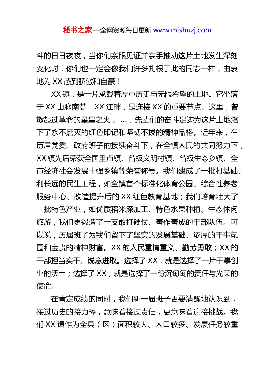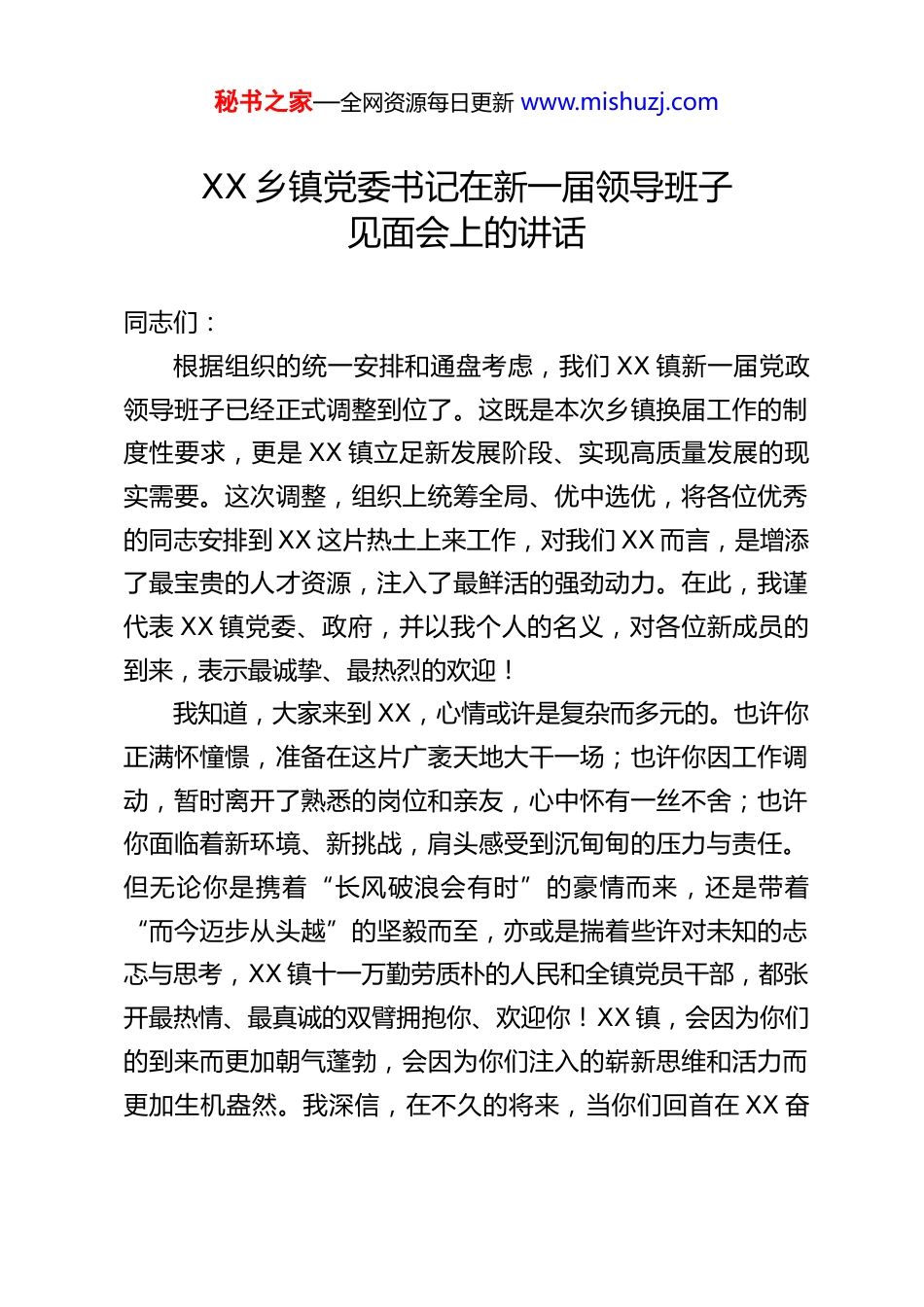 秘书之家—全网资源每日更新 www.mishuzj.comXX 乡镇党委书记在新一届领导班子见面会上的讲话同志们:根据组织的统一安排和通盘考虑,我们 XX 镇新一届党政领导班子已经正式调整到位了。这既是本次乡镇换届工作的制度性要求,更是 XX 镇立足新发展阶段、实现高质量发展的现实需要。这次调整,组织上统筹全局、优中选优,将各位优秀的同志安排到 XX 这片热土上来工作,对我们 XX 而言,是增添了最宝贵的人才资源,注入了最鲜活的强劲动力。在此,我谨代表 XX 镇党委、政府,并以我个人的名义,对各位新成员的到来,表示最诚挚、最热烈的欢迎!我知道,大家来到 XX,心情或许是复杂而多元的。也许你正满怀憧憬,准备在这片广袤天地大干一场;也许你因工作调动,暂时离开了熟悉的岗位和亲友,心中怀有一丝不舍;也许你面临着新环境、新挑战,肩头感受到沉甸甸的压力与责任。但无论你是携着“长风破浪会有时”的豪情而来,还是带着“而今迈步从头越”的坚毅而至,亦或是揣着些许对未知的忐忑与思考,XX 镇十一万勤劳质朴的人民和全镇党员干部,都张开最热情、最真诚的双臂拥抱你、欢迎你!XX 镇,会因为你们的到来而更加朝气蓬勃,会因为你们注入的崭新思维和活力而更加生机盎然。我深信,在不久的将来,当你们回首在 XX 奋秘书之家—全网资源每日更新 www.mishuzj.com斗的日日夜夜,当你们亲眼见证并亲手推动这片土地发生深刻变化时,你们也一定会像我们许多扎根于此的同志一样,由衷地为 XX 感到骄傲和自豪!XX 镇,是一片承载着厚重历史与无限希望的土地。它坐落于 XX 山脉南麓,XX 江畔,是连接 XX 的重要节点。这里,曾燃起过革命的星星之火,....,先辈们的奋斗足迹为这片土地烙下了永不磨灭的红色印记和坚韧不拔的精神品格。近年来,在历届党委、政府班子的接续奋斗下,在全镇人民的共同努力下,XX 镇先后荣获全国重点镇、省级文明村镇、省级生态乡镇、全市经济社会发展十强乡镇等荣誉称号。我们建成了一批打基础、利长远的民生工程,如全镇首个标准化体育公园、综合性养老服务中心、改造提升后的 XX 红色教育基地;我们培育壮大了一批特色产业,如优质稻米深加工、特色水果种植、生态休闲旅游;我们更锻造了一支敢打硬仗、善作善成的干部队伍。可以说,历届班子为我们留下了坚实的发展基础、浓厚的干事氛围和宝贵的精神财富。XX 的人民重情重义、勤劳勇敢;XX 的干部担当实干、锐意进取。选择了 XX,就是选择了一片干事创业的沃土;选择了 XX,就是选择了一份沉甸甸的责任与光荣的使命。在肯定成绩的同时,我们新一届班子更要清醒地认识到,接过历史的接力棒,意味着接过责任,更意味着迎接挑战。我们 XX 镇作为全县(区)面积较大、人口较多、发展任务较重秘书之家—全网资源每日更新 www.mishuzj.com的乡镇,曾经也面临着基础设施薄弱、产业结构单一、社会治理难度大等问题。经过多年努力,局面已经大为改观,但发展不平衡不充分的问题依然是我们面临的主要矛盾。站在新的历史起点上,如何巩固拓展历届班子的奋斗成果,如何在更高层次上推动 XX 实现更高质量、更有效率、更加公平、更可持续、更为安全的发展,历史性地摆在了我们新一届领导班子面前。借此机会,结合当前正在深入开展的树立和践行正确政绩观学习教育,我对新一届领导班子提几点希望和要求,与同志们共勉。第一,要旗帜鲜明讲政治,在对党忠诚中校准“政绩观”的根本方向。习近平总书记反复强调,树立和践行正确政绩观,起决定性作用的是党性。只有党性坚强、摒弃私心杂念,才能保证政绩观不出偏差。讲政治,是具体的、实践的,不是空洞的口号。对我们乡镇基层的领导干部而言,讲政治最直接的体现,就是要把对党忠诚、为党分忧、为党尽职、为民造福作为根本政治担当。一要筑牢信仰之基。要坚持把学懂弄通做实习近平新时代中国特色社会主义思想作为首要政治任务,深刻领会其核心要义、精神实质、丰富内涵和实践要求,特别是要深学细悟习近平总书记关于树立和践行正确政绩观的重要论述。要通过学习,深刻认识到为民造福是最大政绩,解决好“政绩为谁创”的问秘书之家—全...