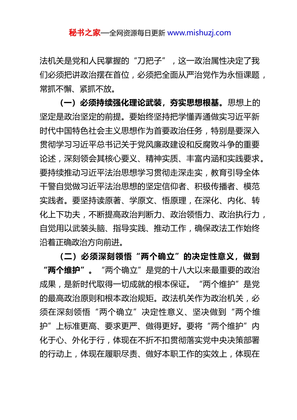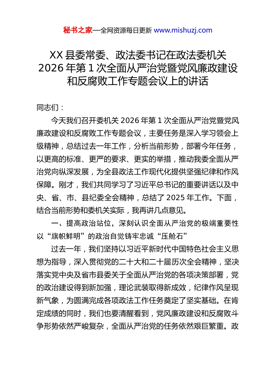 秘书之家—全网资源每日更新 www.mishuzj.comXX 县委常委、政法委书记在政法委机关2026 年第 1 次全面从严治党暨党风廉政建设和反腐败工作专题会议上的讲话同志们:今天我们召开委机关 2026 年第 1 次全面从严治党暨党风廉政建设和反腐败工作专题会议,主要任务是深入学习领会上级精神,总结过去一年工作,分析当前形势,部署今年任务,以更高的标准、更严的要求、更实的举措,推动我委全面从严治党向纵深发展,为全县政法工作现代化提供坚强纪律和作风保障。刚才,我们共同学习了习近平总书记的重要讲话以及中央、省、市、县纪委全会精神,总结了 2025 年工作。下面,结合当前形势和委机关实际,我再讲几点意见。一、提高政治站位,深刻认识全面从严治党的极端重要性以“旗帜鲜明”的政治自觉铸牢忠诚“压舱石”过去一年,我们坚持以习近平新时代中国特色社会主义思想为指导,深入贯彻党的二十大和二十届历次全会精神,坚决落实党中央及省市县委关于全面从严治党的各项决策部署,党的政治建设得到新加强,理论武装取得新成效,纪律作风呈现新气象,为圆满完成各项政法工作任务奠定了坚实基础。在肯定成绩的同时,我们也要清醒看到,党风廉政建设和反腐败斗争形势依然严峻复杂,全面从严治党的任务依然艰巨繁重。政秘书之家—全网资源每日更新 www.mishuzj.com法机关是党和人民掌握的“刀把子”,这一政治属性决定了我们必须把讲政治摆在首位,必须把全面从严治党作为永恒课题,常抓不懈、紧抓不放。(一)必须持续强化理论武装,夯实思想根基。思想上的坚定是政治坚定的前提。要始终坚持把学懂弄通做实习近平新时代中国特色社会主义思想作为首要政治任务,特别是要深入贯彻学习习近平总书记关于党风廉政建设和反腐败斗争的重要论述,深刻领会其核心要义、精神实质、丰富内涵和实践要求。要持续推动习近平法治思想学习贯彻走深走实,教育引导全体干警自觉做习近平法治思想的坚定信仰者、积极传播者、模范实践者。要坚持读原著、学原文、悟原理,在深化、内化、转化上下功夫,不断提高政治判断力、政治领悟力、政治执行力,自觉用以武装头脑、指导实践、推动工作,确保政法工作始终沿着正确政治方向前进。(二)必须深刻领悟“两个确立”的决定性意义,做到“两个维护”。“两个确立”是党的十八大以来最重要的政治成果,是新时代取得一切成就的根本保证。“两个维护”是党的最高政治原则和根本政治规矩。政法机关作为政治机关,必须在深刻领悟“两个确立”决定性意义、坚决做到“两个维护”上标准更高、要求更严、做得更好。要将“两个维护”内化于心、外化于行,体现在不折不扣贯彻落实党中央决策部署的行动上,体现在履职尽责、做好本职工作的实效上,体现在秘书之家—全网资源每日更新 www.mishuzj.com党员干部的日常言行上。要严明政治纪律和政治规矩,坚决同一切违背和损害“两个维护”的言行作斗争,确保政令畅通、令行禁止,确保“刀把子”牢牢掌握在党和人民手中。(三)必须坚持党对政法工作的绝对领导,确保正确政治方向。党的领导是中国特色社会主义法治之魂。要毫不动摇地坚持党对政法工作的绝对领导,自觉将政法工作置于党和国家工作大局中谋划推进,确保党的路线方针政策在政法系统得到不折不扣贯彻执行。要严格执行《中国共产党政法工作条例》,完善党领导政法工作的制度机制,把党的领导落实到政法工作各方面、全过程。政法队伍的忠诚,必须是纯粹的、无条件的,必须是浸入灵魂、融入血脉的。我们要通过持续不断的政治教育、党性锤炼,打造一支让党放心、让人民满意,纪律严明、行为规范、作风优良的政法铁军。二、健全制度体系,扎紧织密规范运行的制度笼子,以“行稳致远”的制度基石提升队伍“战斗力”制度问题更带有根本性、全局性、稳定性和长期性。推进全面从严治党,必须坚持思想建党和制度治党同向发力,用制度管权、管事、管人,不断提升政法队伍建设工作的制度化、规范化水平。(一)坚持把健全制度放在高位,构建严密规范体系。要结合政法工作实际,围绕权力运行的关键点、内部管理的薄弱点、问题易发的风险点,进一步健全完善各项制度规...