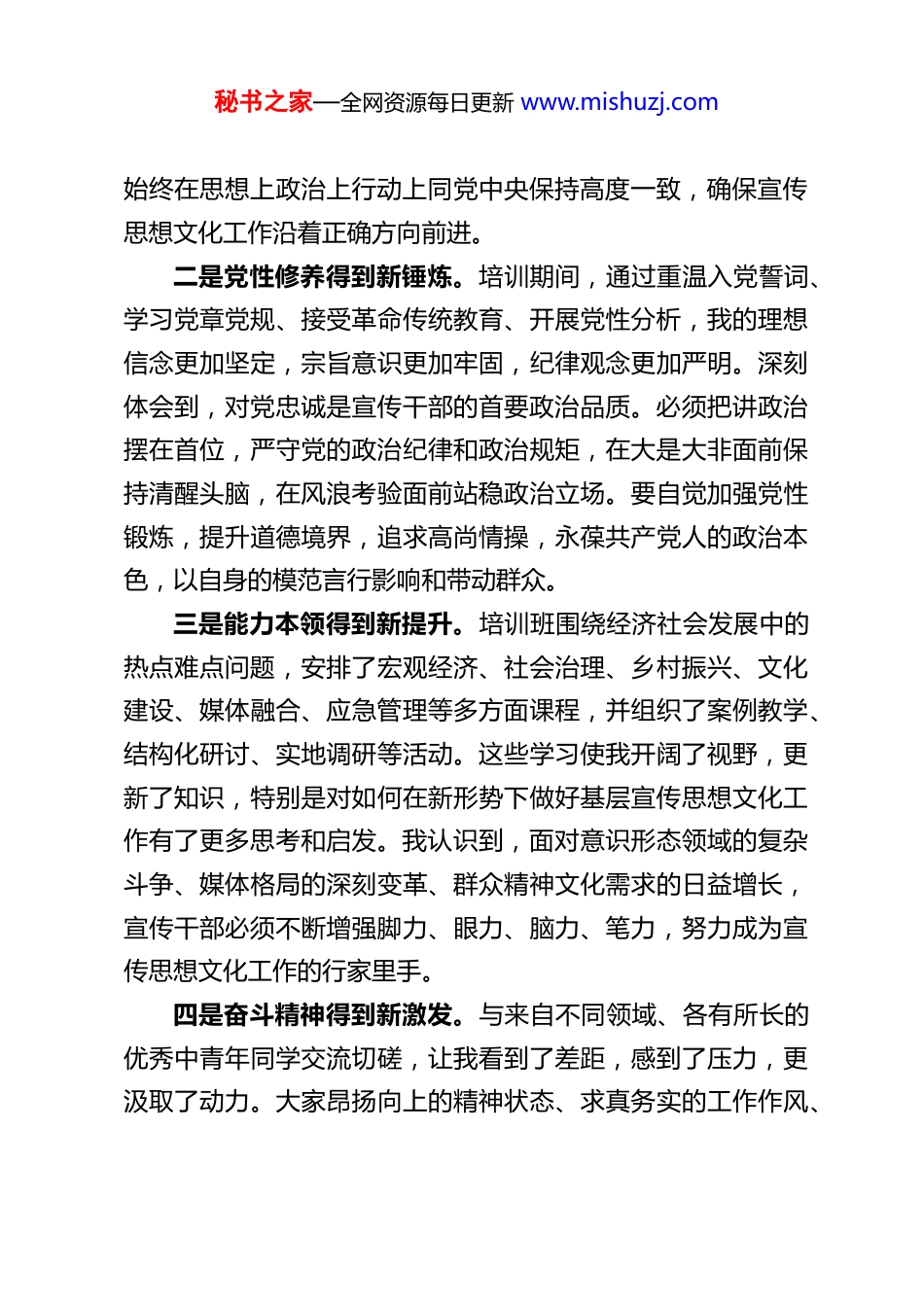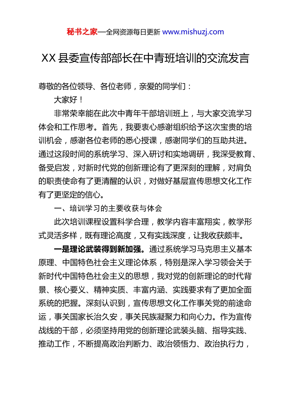 秘书之家—全网资源每日更新 www.mishuzj.comXX 县委宣传部部长在中青班培训的交流发言尊敬的各位领导、各位老师,亲爱的同学们:大家好!非常荣幸能在此次中青年干部培训班上,与大家交流学习体会和工作思考。首先,我要衷心感谢组织给予这次宝贵的培训机会,感谢各位老师的悉心授课,感谢同学们的互助共进。通过这段时间的系统学习、深入研讨和实地调研,我深受教育、备受启发,对新时代党的创新理论有了更深刻的理解,对肩负的职责使命有了更清醒的认识,对做好基层宣传思想文化工作有了更坚定的信心。一、培训学习的主要收获与体会此次培训课程设置科学合理,教学内容丰富翔实,教学形式灵活多样,既有理论高度,又有实践深度,让我收获颇丰。一是理论武装得到新加强。通过系统学习马克思主义基本原理、中国特色社会主义理论体系,特别是深入学习领会关于新时代中国特色社会主义的思想,我对党的创新理论的时代背景、核心要义、精神实质、丰富内涵、实践要求有了更加全面系统的把握。深刻认识到,宣传思想文化工作事关党的前途命运,事关国家长治久安,事关民族凝聚力和向心力。作为宣传战线的干部,必须坚持用党的创新理论武装头脑、指导实践、推动工作,不断提高政治判断力、政治领悟力、政治执行力,秘书之家—全网资源每日更新 www.mishuzj.com始终在思想上政治上行动上同党中央保持高度一致,确保宣传思想文化工作沿着正确方向前进。二是党性修养得到新锤炼。培训期间,通过重温入党誓词、学习党章党规、接受革命传统教育、开展党性分析,我的理想信念更加坚定,宗旨意识更加牢固,纪律观念更加严明。深刻体会到,对党忠诚是宣传干部的首要政治品质。必须把讲政治摆在首位,严守党的政治纪律和政治规矩,在大是大非面前保持清醒头脑,在风浪考验面前站稳政治立场。要自觉加强党性锻炼,提升道德境界,追求高尚情操,永葆共产党人的政治本色,以自身的模范言行影响和带动群众。三是能力本领得到新提升。培训班围绕经济社会发展中的热点难点问题,安排了宏观经济、社会治理、乡村振兴、文化建设、媒体融合、应急管理等多方面课程,并组织了案例教学、结构化研讨、实地调研等活动。这些学习使我开阔了视野,更新了知识,特别是对如何在新形势下做好基层宣传思想文化工作有了更多思考和启发。我认识到,面对意识形态领域的复杂斗争、媒体格局的深刻变革、群众精神文化需求的日益增长,宣传干部必须不断增强脚力、眼力、脑力、笔力,努力成为宣传思想文化工作的行家里手。四是奋斗精神得到新激发。与来自不同领域、各有所长的优秀中青年同学交流切磋,让我看到了差距,感到了压力,更汲取了动力。大家昂扬向上的精神状态、求真务实的工作作风、秘书之家—全网资源每日更新 www.mishuzj.com开拓创新的进取意识,深深感染了我。我更加深刻地认识到,新时代是奋斗者的时代。作为党的干部,必须牢记空谈误国、实干兴邦的道理,树立正确的政绩观,发扬钉钉子精神,以“时时放心不下”的责任感和积极担当作为的精气神,履好职、尽好责,努力创造经得起实践、人民、历史检验的实绩。二、结合宣传思想文化工作的几点思考宣传部是党委主管意识形态工作的重要职能部门,承担着举旗帜、聚民心、育新人、兴文化、展形象的使命任务。结合培训所学和 XX 县实际,我对做好当前基层宣传思想文化工作有以下几点思考:第一,必须牢牢掌握意识形态工作领导权。意识形态工作是党的一项极端重要的工作。县级处于意识形态工作的前沿阵地,直接面对基层群众,情况复杂,挑战严峻。必须坚持马克思主义在意识形态领域的指导地位,严格落实意识形态工作责任制,加强对各类意识形态阵地的管理。要密切关注社会思潮动态,敏锐捕捉风险点,特别是要管好用好互联网这个主阵地、主战场、最前沿。要建立健全分析研判、风险排查、应急处置机制,敢于亮剑、善于斗争,坚决抵制各种错误观点和思潮,筑牢意识形态安全防线,巩固壮大奋进新时代的主流思想舆论。第二,必须着力提升新闻舆论传播力引导力影响力公信力新闻舆论处在意识形态斗争最前沿。要坚持团结稳定鼓劲、正面宣传为主的基本方针,围绕县委县政...