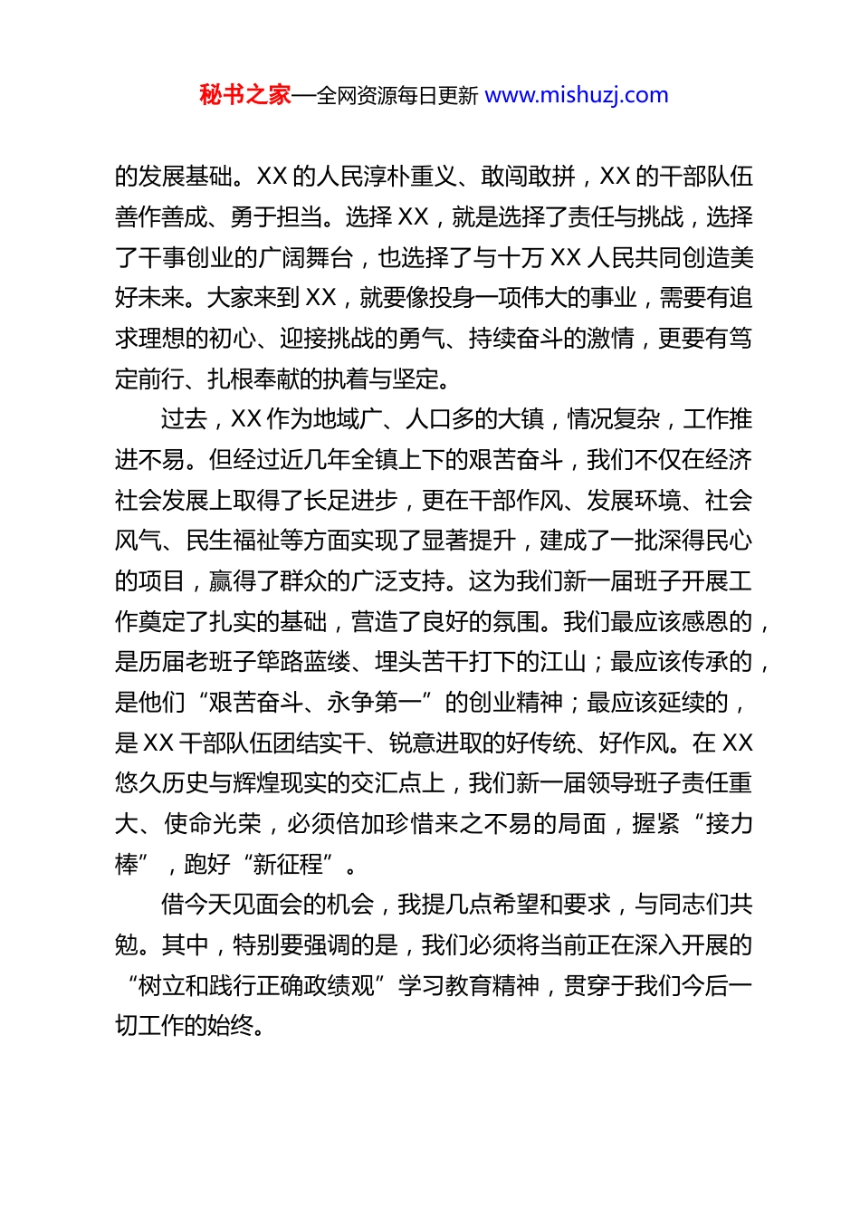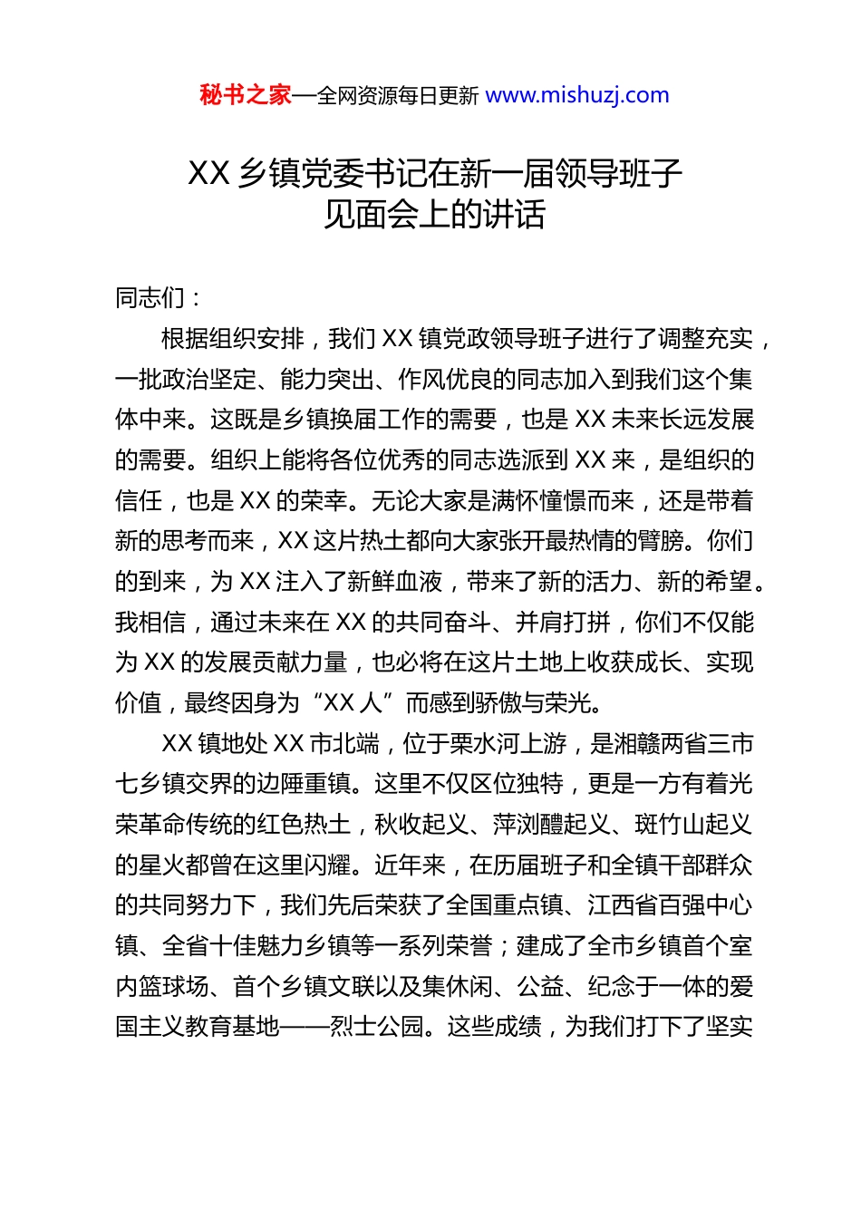 秘书之家—全网资源每日更新 www.mishuzj.comXX 乡镇党委书记在新一届领导班子见面会上的讲话同志们:根据组织安排,我们 XX 镇党政领导班子进行了调整充实,一批政治坚定、能力突出、作风优良的同志加入到我们这个集体中来。这既是乡镇换届工作的需要,也是 XX 未来长远发展的需要。组织上能将各位优秀的同志选派到 XX 来,是组织的信任,也是 XX 的荣幸。无论大家是满怀憧憬而来,还是带着新的思考而来,XX 这片热土都向大家张开最热情的臂膀。你们的到来,为 XX 注入了新鲜血液,带来了新的活力、新的希望。我相信,通过未来在 XX 的共同奋斗、并肩打拼,你们不仅能为 XX 的发展贡献力量,也必将在这片土地上收获成长、实现价值,最终因身为“XX 人”而感到骄傲与荣光。XX 镇地处 XX 市北端,位于栗水河上游,是湘赣两省三市七乡镇交界的边陲重镇。这里不仅区位独特,更是一方有着光荣革命传统的红色热土,秋收起义、萍浏醴起义、斑竹山起义的星火都曾在这里闪耀。近年来,在历届班子和全镇干部群众的共同努力下,我们先后荣获了全国重点镇、江西省百强中心镇、全省十佳魅力乡镇等一系列荣誉;建成了全市乡镇首个室内篮球场、首个乡镇文联以及集休闲、公益、纪念于一体的爱国主义教育基地——烈士公园。这些成绩,为我们打下了坚实秘书之家—全网资源每日更新 www.mishuzj.com的发展基础。XX 的人民淳朴重义、敢闯敢拼,XX 的干部队伍善作善成、勇于担当。选择 XX,就是选择了责任与挑战,选择了干事创业的广阔舞台,也选择了与十万 XX 人民共同创造美好未来。大家来到 XX,就要像投身一项伟大的事业,需要有追求理想的初心、迎接挑战的勇气、持续奋斗的激情,更要有笃定前行、扎根奉献的执着与坚定。过去,XX 作为地域广、人口多的大镇,情况复杂,工作推进不易。但经过近几年全镇上下的艰苦奋斗,我们不仅在经济社会发展上取得了长足进步,更在干部作风、发展环境、社会风气、民生福祉等方面实现了显著提升,建成了一批深得民心的项目,赢得了群众的广泛支持。这为我们新一届班子开展工作奠定了扎实的基础,营造了良好的氛围。我们最应该感恩的,是历届老班子筚路蓝缕、埋头苦干打下的江山;最应该传承的,是他们“艰苦奋斗、永争第一”的创业精神;最应该延续的,是 XX 干部队伍团结实干、锐意进取的好传统、好作风。在 XX悠久历史与辉煌现实的交汇点上,我们新一届领导班子责任重大、使命光荣,必须倍加珍惜来之不易的局面,握紧“接力棒”,跑好“新征程”。借今天见面会的机会,我提几点希望和要求,与同志们共勉。其中,特别要强调的是,我们必须将当前正在深入开展的“树立和践行正确政绩观”学习教育精神,贯穿于我们今后一切工作的始终。秘书之家—全网资源每日更新 www.mishuzj.com第一,要讲政治、顾大局,在团结协作中凝聚奋进之力。团结是领导班子生命力的源泉。习近平总书记在《之江新语》中深刻指出:“懂团结是真聪明,会团结是真本领。”一个地方的发展,离不开一个同心同德、和衷共济的领导核心。这些年来,XX 能克服重重困难,取得显著成绩,首要的一条经验就是“讲团结”。真正的团结,并非一团和气、没有原则,而是“大事讲原则、小事讲风格”,是以党的事业为重、以全镇人民的根本利益为最高准则的团结。它要求我们相互包容、相互补台、相互支持。对我们班子成员而言,团结是一种品德,一种能力,更是一种必须坚守的政治责任。我们要像爱护眼睛一样爱护班子团结。书记镇长之间、班子成员之间,要确保一个声音、一个步调,做到“理解不误解、补台不拆台、分工不分家”。凡经集体研究作出的决策,就必须坚决执行、全力落实,绝不允许有任何杂音,绝不允许搞阳奉阴违、各自为政。在原则问题上必须旗帜鲜明,在非原则问题上要讲感情、讲友谊。要自觉把个人融入集体,小我服从大我,个人服从组织,不图虚名,不争私利,心底无私,这样我们的班子才能真正攥成一个“拳头”,坚强有力,无往不胜。任何破坏团结的言行,在 XX 都没有市场,也绝不会被容忍。第二,要讲学习、强本领,在深学细悟中把准前行之舵。学习是领导干...