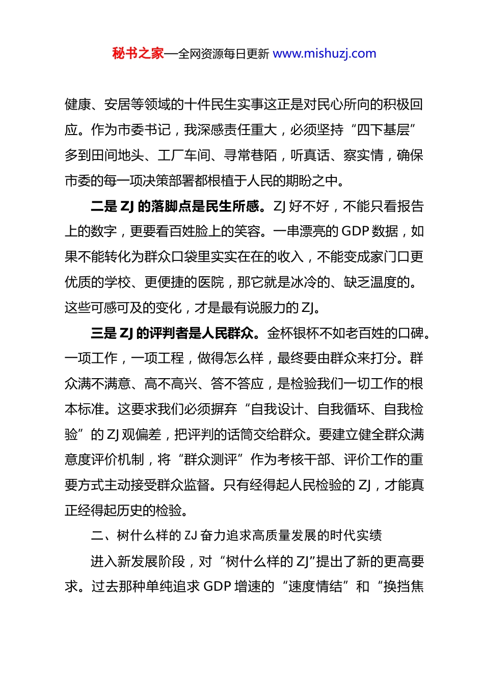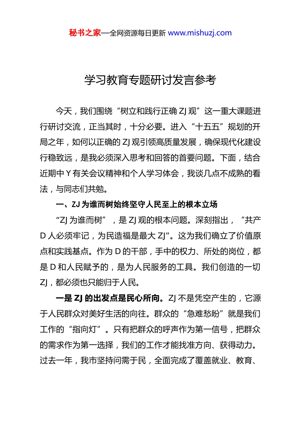 秘书之家—全网资源每日更新 www.mishuzj.com学习教育专题研讨发言参考今天,我们围绕“树立和践行正确 ZJ 观”这一重大课题进行研讨交流,正当其时,十分必要。进入“十五五”规划的开局之年,如何以正确的 ZJ 观引领高质量发展,确保现代化建设行稳致远,是我必须深入思考和回答的首要问题。下面,结合近期中 Y 有关会议精神和个人学习体会,我谈几点不成熟的看法,与同志们共勉。一、ZJ 为谁而树始终坚守人民至上的根本立场“ZJ 为谁而树”,是 ZJ 观的根本问题。深刻指出,“共产D 人必须牢记,为民造福是最大 ZJ”。这为我们确立了价值原点和实践基点。作为 D 的干部,手中的权力、所处的岗位,都是 D 和人民赋予的,是为人民服务的工具。我们创造的一切ZJ,都必须也只能归于人民。一是 ZJ 的出发点是民心所向。ZJ 不是凭空产生的,它源于人民群众对美好生活的向往。群众的“急难愁盼”就是我们工作的“指向灯”。只有把群众的呼声作为第一信号,把群众的需求作为第一选择,我们的工作才能找准方向、获得动力。过去一年,我市坚持问需于民,全面完成了覆盖就业、教育、秘书之家—全网资源每日更新 www.mishuzj.com健康、安居等领域的十件民生实事这正是对民心所向的积极回应。作为市委书记,我深感责任重大,必须坚持“四下基层”多到田间地头、工厂车间、寻常巷陌,听真话、察实情,确保市委的每一项决策部署都根植于人民的期盼之中。二是 ZJ 的落脚点是民生所感。ZJ 好不好,不能只看报告上的数字,更要看百姓脸上的笑容。一串漂亮的 GDP 数据,如果不能转化为群众口袋里实实在在的收入,不能变成家门口更优质的学校、更便捷的医院,那它就是冰冷的、缺乏温度的。这些可感可及的变化,才是最有说服力的 ZJ。三是 ZJ 的评判者是人民群众。金杯银杯不如老百姓的口碑。一项工作,一项工程,做得怎么样,最终要由群众来打分。群众满不满意、高不高兴、答不答应,是检验我们一切工作的根本标准。这要求我们必须摒弃“自我设计、自我循环、自我检验”的 ZJ 观偏差,把评判的话筒交给群众。要建立健全群众满意度评价机制,将“群众测评”作为考核干部、评价工作的重要方式主动接受群众监督。只有经得起人民检验的 ZJ,才能真正经得起历史的检验。二、树什么样的 ZJ 奋力追求高质量发展的时代实绩进入新发展阶段,对“树什么样的 ZJ”提出了新的更高要求。过去那种单纯追求 GDP 增速的“速度情结”和“换挡焦秘书之家—全网资源每日更新 www.mishuzj.com虑”已经不合时宜。我们必须完整、准确、全面贯彻新发展理念,创造无愧于时代、有益于人民、立得住足的高质量发展实绩。一是摒弃“唯 GDP 论英雄”,追求创新驱动、结构优化的 ZJ。发展是硬道理,但高质量发展才是新时代的硬道理。我市经济总量已突破***亿元大关这固然可喜,但我更看重的是增长的质量和发展的后劲。我们不能再走粗放式发展的老路,必须以科技创新为引领,加快构建现代化产业体系。要坚决破除路径依赖,大力发展白酒、装备制造、电子信息等优势产业,同时积极培育低空经济等新质生产力推动经济实现质的有效提升和量的合理增长。这样的 ZJ,才是有含金量的、可持续的。二是平衡“显绩”与“潜绩”,追求利在长远、惠及后人的 ZJ。ZJ 有显性与隐性之分。修大马路、建大广场是“显绩”,容易被看见;而保护生态环境、化解历史遗留问题、构建长效机制则是“潜绩”,短期内不易显现,但对一个地方的长远发展至关重要。作为决策者,必须有“功成不必在我、功成必定有我”的胸襟和境界,既要做让老百姓看得见、摸得着、得实惠的实事,也要做为后人作铺垫、打基础、利长远的好事。我市森林覆盖率保持高位,空气质量优良这就是我们必须守护好的“潜绩”,是留给子孙后代最宝贵的财富。秘书之家—全网资源每日更新 www.mishuzj.com三是统筹发展和安全,追求行得稳、走得远的 ZJ。安全是发展的前提,发展是安全的保障。一个地方如果发展上去了,但安全风险频发,社会矛盾突出,这样的 ZJ 就会大打折扣,甚至得而复失。我常常感到如履薄冰,时刻告诫自己,要把防范化解重大风...