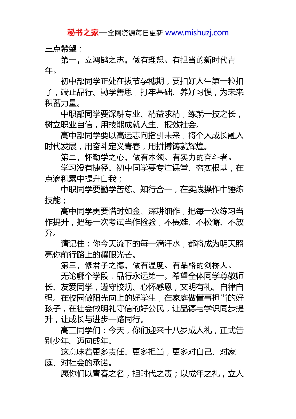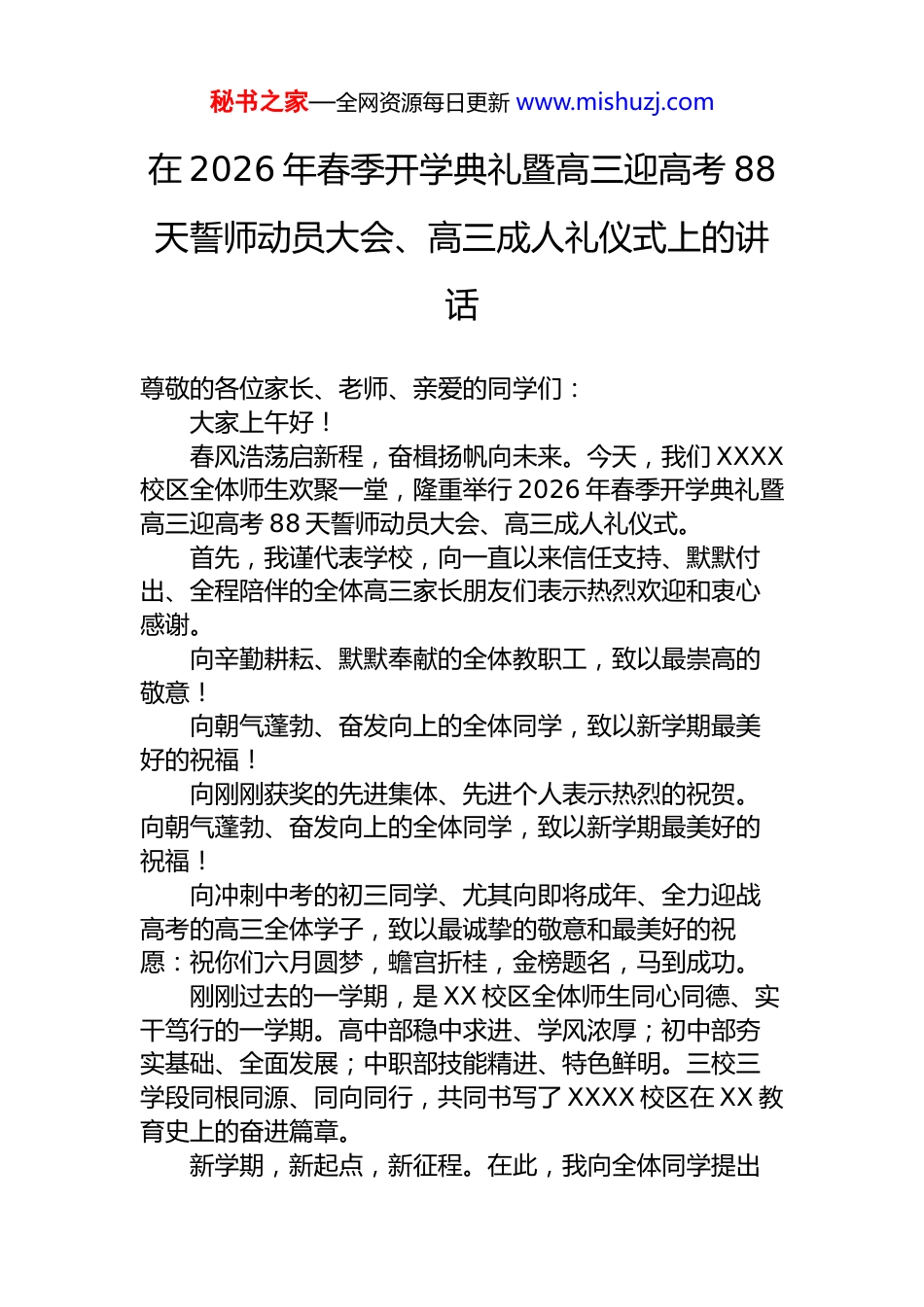 秘书之家—全网资源每日更新 www.mishuzj.com在 2026 年春季开学典礼暨高三迎高考 88天誓师动员大会、高三成人礼仪式上的讲话尊敬的各位家长、老师、亲爱的同学们:大家上午好!春风浩荡启新程,奋楫扬帆向未来。今天,我们 XXXX校区全体师生欢聚一堂,隆重举行 2026 年春季开学典礼暨高三迎高考 88 天誓师动员大会、高三成人礼仪式。首先,我谨代表学校,向一直以来信任支持、默默付出、全程陪伴的全体高三家长朋友们表示热烈欢迎和衷心感谢。向辛勤耕耘、默默奉献的全体教职工,致以最崇高的敬意!向朝气蓬勃、奋发向上的全体同学,致以新学期最美好的祝福!向刚刚获奖的先进集体、先进个人表示热烈的祝贺。向朝气蓬勃、奋发向上的全体同学,致以新学期最美好的祝福!向冲刺中考的初三同学、尤其向即将成年、全力迎战高考的高三全体学子,致以最诚挚的敬意和最美好的祝愿:祝你们六月圆梦,蟾宫折桂,金榜题名,马到成功。刚刚过去的一学期,是 XX 校区全体师生同心同德、实干笃行的一学期。高中部稳中求进、学风浓厚;初中部夯实基础、全面发展;中职部技能精进、特色鲜明。三校三学段同根同源、同向同行,共同书写了 XXXX 校区在 XX 教育史上的奋进篇章。新学期,新起点,新征程。在此,我向全体同学提出秘书之家—全网资源每日更新 www.mishuzj.com三点希望:第一,立鸿鹄之志,做有理想、有担当的新时代青年。初中部同学正处在拔节孕穗期,要扣好人生第一粒扣子,端正品行、勤学善思,打牢基础、养好习惯,为未来积蓄力量。中职部同学要深耕专业、精益求精,练就一技之长,树立职业自信,用技能成就人生、报效社会。高中部同学要以高远志向指引未来,将个人成长融入时代发展,用奋斗定义青春,用拼搏铸就辉煌。第二,怀勤学之心,做有本领、有实力的奋斗者。学习没有捷径。初中同学要专注课堂、夯实根基,在点滴积累中提升自我;中职同学要勤学苦练、知行合一,在实践操作中锤炼技能;高中同学更要惜时如金、深耕细作,把每一次练习当作提升,把每一次考试当作检验,不畏难、不松懈、不放弃。请记住:你今天流下的每一滴汗水,都将成为明天照亮你前行路上的耀眼光芒。第三,修君子之德,做有温度、有品格的剑桥人。无论哪个学段,品行永远第一。希望全体同学尊敬师长、友爱同学,遵守校规、心怀感恩,文明有礼、自律自强。在校园做阳光向上的好学生,在家庭做懂事担当的好孩子,在社会做明礼守信的好公民,让品德与学识同步提升,让成长与进步一路同行。高三同学们:今天,你们迎来十八岁成人礼,正式告别少年、迈向成年。这意味着更多责任、更多担当,更多对自己、对家庭、对社会的承诺。愿你们以青春之名,担时代之责;以成年之礼,立人秘书之家—全网资源每日更新 www.mishuzj.com生之志。春天是播种的季节,更是笃行实干奋力拼搏的时节。全体高三同学们,从今天算起,距离高考仅剩 88天。88 天,看似短暂,却足以改写命运;看似平凡,却蕴藏无限可能。而今天,这场大会,对于我们高三全体学子而言,更是一场出征的号角、一场决战的宣言!寒窗十二载,今朝试锋芒。三年来,你们披星戴月、风雨兼程;三年来,你们笔耕不辍、逐梦前行。教室里专注的眼神,灯光下奋笔的身影,考场上坚定的姿态,都是青春最美的模样。如今,高考的战鼓已经擂响,冲刺的征程就在脚下,梦想的大门即将敞开!在此,我代表学校,向全体高三同学,提出四点冲刺要求:一要坚定信心,相信“我能行”。高考不仅是知识的较量,更是心态的比拼。无论过往成绩如何,都请相信自己、相信老师、相信学校。你们已经准备充分,只待亮剑出征。心态稳,则发挥稳;底气足,则成绩足。请昂首挺胸,从容自信,迎接人生这场重要的考验。二要科学备考,做到“高效率”。最后阶段,贵在精准、重在落实。紧跟老师复习节奏,狠抓基础、突破重点、补齐短板,规范答题、细心审题。不搞疲劳战,不钻牛角尖,把能拿的分一分不丢,把会做的题一题不错,用最科学的方法,实现最大的提升。三要全力以赴,坚持“不松懈”。冲刺的道路注定艰辛,但坚持到底就是胜利。把每一天都当作决战前的最后一天,把每一节...