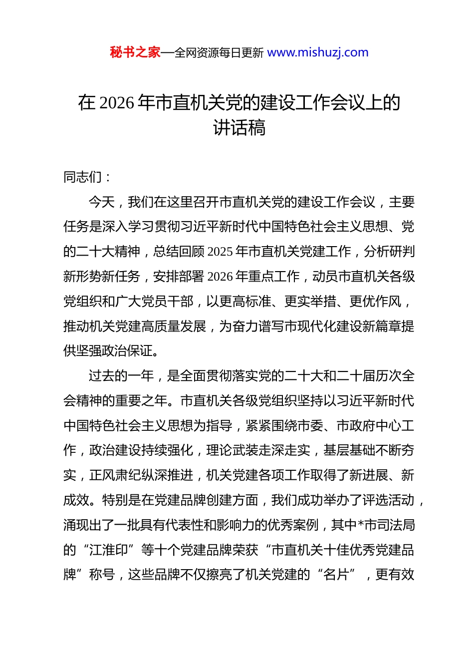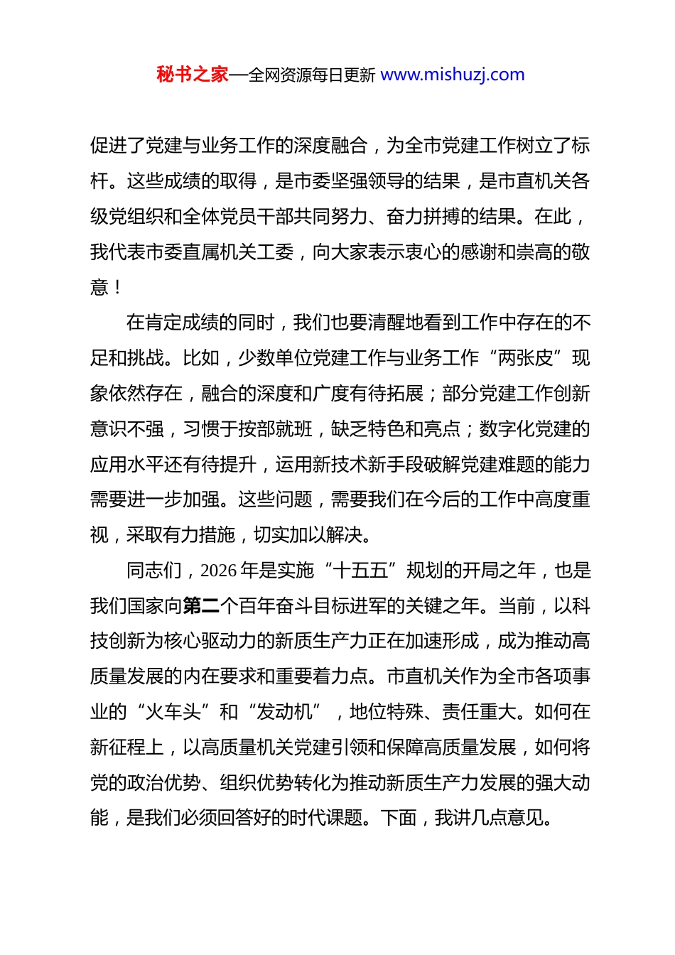 秘书之家—全网资源每日更新 www.mishuzj.com在 2026 年市直机关党的建设工作会议上的讲话稿 同志们:今天,我们在这里召开市直机关党的建设工作会议,主要任务是深入学习贯彻习近平新时代中国特色社会主义思想、党的二十大精神,总结回顾 2025 年市直机关党建工作,分析研判新形势新任务,安排部署 2026 年重点工作,动员市直机关各级党组织和广大党员干部,以更高标准、更实举措、更优作风,推动机关党建高质量发展,为奋力谱写市现代化建设新篇章提供坚强政治保证。过去的一年,是全面贯彻落实党的二十大和二十届历次全会精神的重要之年。市直机关各级党组织坚持以习近平新时代中国特色社会主义思想为指导,紧紧围绕市委、市政府中心工作,政治建设持续强化,理论武装走深走实,基层基础不断夯实,正风肃纪纵深推进,机关党建各项工作取得了新进展、新成效。特别是在党建品牌创建方面,我们成功举办了评选活动,涌现出了一批具有代表性和影响力的优秀案例,其中*市司法局的“江淮印”等十个党建品牌荣获“市直机关十佳优秀党建品牌”称号,这些品牌不仅擦亮了机关党建的“名片”,更有效秘书之家—全网资源每日更新 www.mishuzj.com促进了党建与业务工作的深度融合,为全市党建工作树立了标杆。这些成绩的取得,是市委坚强领导的结果,是市直机关各级党组织和全体党员干部共同努力、奋力拼搏的结果。在此,我代表市委直属机关工委,向大家表示衷心的感谢和崇高的敬意!在肯定成绩的同时,我们也要清醒地看到工作中存在的不足和挑战。比如,少数单位党建工作与业务工作“两张皮”现象依然存在,融合的深度和广度有待拓展;部分党建工作创新意识不强,习惯于按部就班,缺乏特色和亮点;数字化党建的应用水平还有待提升,运用新技术新手段破解党建难题的能力需要进一步加强。这些问题,需要我们在今后的工作中高度重视,采取有力措施,切实加以解决。同志们,2026 年是实施“十五五”规划的开局之年,也是我们国家向第二个百年奋斗目标进军的关键之年。当前,以科技创新为核心驱动力的新质生产力正在加速形成,成为推动高质量发展的内在要求和重要着力点。市直机关作为全市各项事业的“火车头”和“发动机”,地位特殊、责任重大。如何在新征程上,以高质量机关党建引领和保障高质量发展,如何将党的政治优势、组织优势转化为推动新质生产力发展的强大动能,是我们必须回答好的时代课题。下面,我讲几点意见。秘书之家—全网资源每日更新 www.mishuzj.com一、聚焦政治引领筑牢高质量发展的思想根基机关首先是政治机关,政治属性是第一属性。市直机关的一切工作,都必须旗帜鲜明讲政治,确保始终沿着正确的方向前进。(一)要持续强化理论武装。坚持把学习贯彻习近平新时代中国特色社会主义思想作为首要政治任务,持续巩固拓展主题教育和党纪学习教育成果。要深刻认识到,新质生产力这一重大理论创新,是习近平经济思想的最新成果,我们必须先学一步、深学一层。各级党组织要通过理论学习中心组、“三会一课”、主题党日等形式,组织党员干部原原本本学、联系实际学,深刻理解新质生产力的核心要义、丰富内涵和实践要求。要引导广大党员干部自觉做党的创新理论的坚定信仰者和忠实实践者,不断提高政治判断力、政治领悟力、政治执行力,以理论上的清醒保证政治上的坚定。(二)要坚决做到“两个维护”。要把对党绝对忠诚作为根本政治要求,深刻领悟“两个确立”的决定性意义,增强“四个意识”、坚定“四个自信”、做到“两个维护”。要严明政治纪律和政治规矩,确保党中央决策部署和省委、市委工作要求在市直机关不折不扣得到贯彻落实。要将贯彻落实的成效作为检验党建成效的试金石,确保市委、市政府的各项工作秘书之家—全网资源每日更新 www.mishuzj.com部署,特别是关于发展新质生产力、推进高质量发展的战略举措,都能在市直机关落地生根、开花结果。(三)要严肃党内政治生活。高质量的党内政治生活是淬炼党性、提升政治能力的重要熔炉。要严格执行新形势下党内政治生活的若干准则,提高民主生活会和组织生活会质量,用好批评和自我批评这个锐利武器,让党员干部...