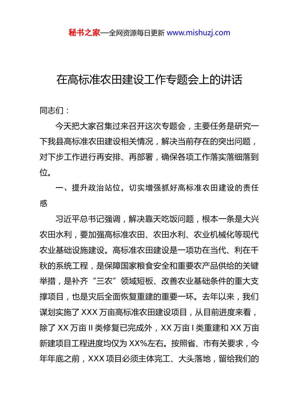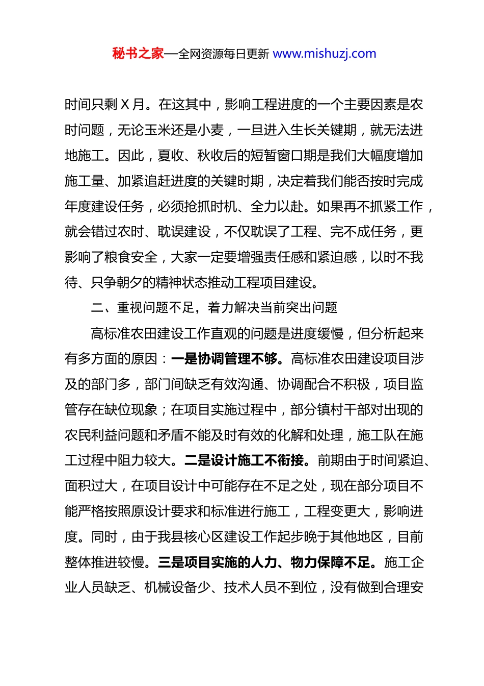 秘书之家—全网资源每日更新 www.mishuzj.com在高标准农田建设工作专题会上的讲话同志们:今天把大家召集过来召开这次专题会,主要任务是研究一下我县高标准农田建设相关情况,解决当前存在的突出问题,对下步工作进行再安排、再部署,确保各项工作落实落细落到位。一、提升政治站位,切实增强抓好高标准农田建设的责任感习近平总书记强调,解决靠天吃饭问题,根本一条是大兴农田水利,要加强高标准农田、农田水利、农业机械化等现代农业基础设施建设。高标准农田建设是一项功在当代、利在千秋的系统工程,是保障国家粮食安全和重要农产品供给的关键举措,是补齐“三农”领域短板、改善农业基础条件的重大支撑项目,也是灾后全面恢复重建的重要一环。去年以来,我们谋划实施了 XXX 万亩高标准农田建设项目,从目前进度来看,除了 XX 万亩 II 类修复已完成外,XX 万亩 I 类重建和 XX 万亩新建项目工程进度均仅为 XX%左右。按照省、市有关要求,今年年底之前,XXX 项目必须主体完工、大头落地,留给我们的秘书之家—全网资源每日更新 www.mishuzj.com时间只剩 X 月。在这其中,影响工程进度的一个主要因素是农时问题,无论玉米还是小麦,一旦进入生长关键期,就无法进地施工。因此,夏收、秋收后的短暂窗口期是我们大幅度增加施工量、加紧追赶进度的关键时期,决定着我们能否按时完成年度建设任务,必须抢抓时机、全力以赴。如果再不抓紧工作,就会错过农时、耽误建设,不仅耽误了工程、完不成任务,更影响了粮食安全,大家一定要增强责任感和紧迫感,以时不我待、只争朝夕的精神状态推动工程项目建设。二、重视问题不足,着力解决当前突出问题高标准农田建设工作直观的问题是进度缓慢,但分析起来有多方面的原因:一是协调管理不够。高标准农田建设项目涉及的部门多,部门间缺乏有效沟通、协调配合不积极,项目监管存在缺位现象;在项目实施过程中,部分镇村干部对出现的农民利益问题和矛盾不能及时有效的化解和处理,施工队在施工过程中阻力较大。二是设计施工不衔接。前期由于时间紧迫、面积过大,在项目设计中可能存在不足之处,现在部分项目不能严格按照原设计要求和标准进行施工,工程变更大,影响进度。同时,由于我县核心区建设工作起步晚于其他地区,目前整体推进较慢。三是项目实施的人力、物力保障不足。施工企业人员缺乏、机械设备少、技术人员不到位,没有做到合理安秘书之家—全网资源每日更新 www.mishuzj.com排和有效调度。归根到底,这些问题还是工作统筹力度不够强、抓得不紧不实造成的,县农业农村局要牵好头,各镇(街道)协同配合,下大力气研究解决当前存在的突出问题,集中人力、物力把进度赶上来,特别是在人力安排上,既要保证 XXX 年施工管理,也要推进已完工项目的验收等各项工作,学会“十个指头弹钢琴”,确保如期完成既定的目标任务。三、逐级压实责任,全力以赴推进农田建设进度工作干的怎么样,关键在于责任能否落实。一要倒排工期、抓紧施工。要加强项目的节点化管控,明确节点任务和完成时限,对工程建设实行台账式管理、清单式推进。要坚持好周例会制度,及时调度工程质量及进展情况,及时解决相关问题,切实做到倒排工期、争分夺秒、挂图作战。二要保证质量、严格标准。高标准农田建设是一项重要的民生工程,工程质量尤为关键。一定要树立“质量第一”的理念,同时也要秉持“质量是建起来的、也是管出来的”思想,管好施工单位,规范质量标准,严格按照设计施工,严把工程质量关。要用好监理单位,坚决杜绝监理走过场,严控进场材料质量、严防偷工减料、半拉子工程、豆腐渣工程、信访工程,对于发现不合格的,责令立整立改,确保工程质量不出任何问题。要建设样板工程,各镇(街道)要加快土地流转工作进度,按照规划安排,抓紧秘书之家—全网资源每日更新 www.mishuzj.com推进。县农业农村局要尽快向市局提交示范区项目建议书,跟进批复,上会研究,抓紧进行 EPC 招标。三要强化监督、落实责任。高标准农田建设项目不仅是 XXXX 的重点项目,也是全县民生实事中的一项大工程,参与的人数众多,涉及到的项目款巨大。因...
