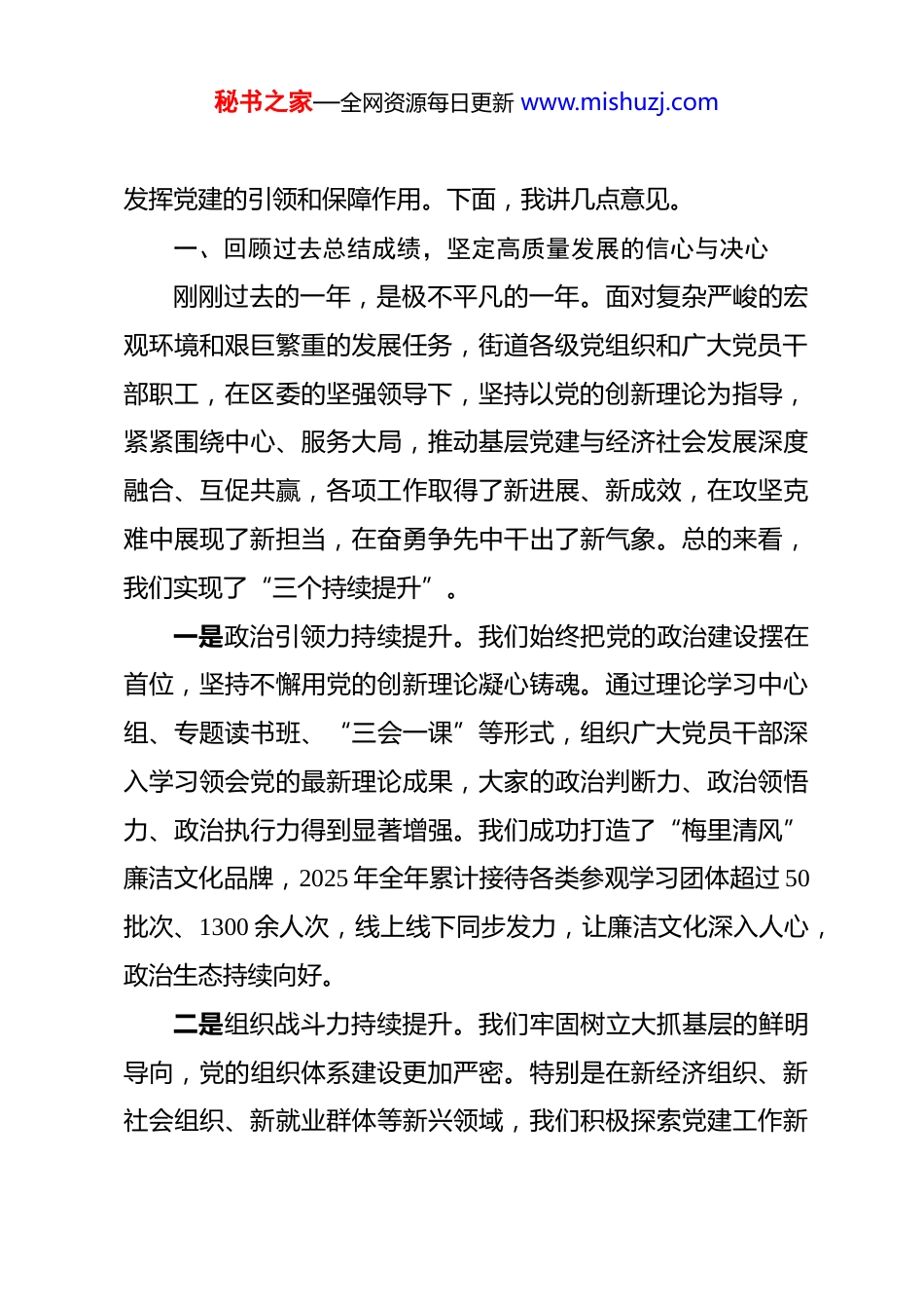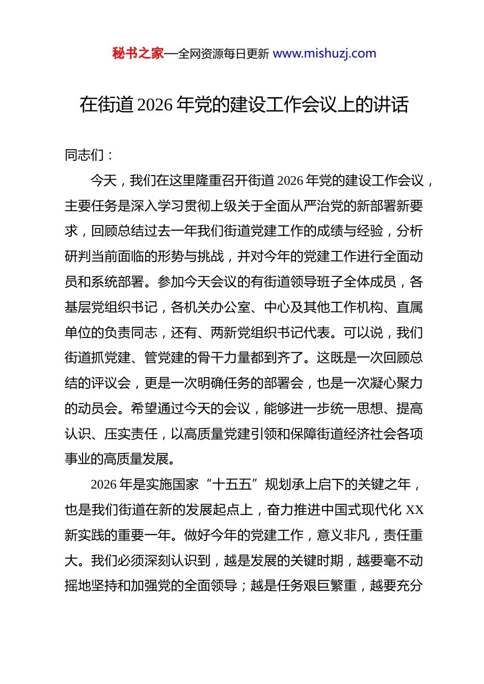 秘书之家—全网资源每日更新 www.mishuzj.com在街道 2026 年党的建设工作会议上的讲话 同志们:今天,我们在这里隆重召开街道 2026 年党的建设工作会议,主要任务是深入学习贯彻上级关于全面从严治党的新部署新要求,回顾总结过去一年我们街道党建工作的成绩与经验,分析研判当前面临的形势与挑战,并对今年的党建工作进行全面动员和系统部署。参加今天会议的有街道领导班子全体成员,各基层党组织书记,各机关办公室、中心及其他工作机构、直属单位的负责同志,还有、两新党组织书记代表。可以说,我们街道抓党建、管党建的骨干力量都到齐了。这既是一次回顾总结的评议会,更是一次明确任务的部署会,也是一次凝心聚力的动员会。希望通过今天的会议,能够进一步统一思想、提高认识、压实责任,以高质量党建引领和保障街道经济社会各项事业的高质量发展。2026 年是实施国家“十五五”规划承上启下的关键之年,也是我们街道在新的发展起点上,奋力推进中国式现代化 XX新实践的重要一年。做好今年的党建工作,意义非凡,责任重大。我们必须深刻认识到,越是发展的关键时期,越要毫不动摇地坚持和加强党的全面领导;越是任务艰巨繁重,越要充分秘书之家—全网资源每日更新 www.mishuzj.com发挥党建的引领和保障作用。下面,我讲几点意见。一、回顾过去总结成绩,坚定高质量发展的信心与决心刚刚过去的一年,是极不平凡的一年。面对复杂严峻的宏观环境和艰巨繁重的发展任务,街道各级党组织和广大党员干部职工,在区委的坚强领导下,坚持以党的创新理论为指导,紧紧围绕中心、服务大局,推动基层党建与经济社会发展深度融合、互促共赢,各项工作取得了新进展、新成效,在攻坚克难中展现了新担当,在奋勇争先中干出了新气象。总的来看,我们实现了“三个持续提升”。一是政治引领力持续提升。我们始终把党的政治建设摆在首位,坚持不懈用党的创新理论凝心铸魂。通过理论学习中心组、专题读书班、“三会一课”等形式,组织广大党员干部深入学习领会党的最新理论成果,大家的政治判断力、政治领悟力、政治执行力得到显著增强。我们成功打造了“梅里清风”廉洁文化品牌,2025 年全年累计接待各类参观学习团体超过 50批次、1300 余人次,线上线下同步发力,让廉洁文化深入人心,政治生态持续向好。二是组织战斗力持续提升。我们牢固树立大抓基层的鲜明导向,党的组织体系建设更加严密。特别是在新经济组织、新社会组织、新就业群体等新兴领域,我们积极探索党建工作新秘书之家—全网资源每日更新 www.mishuzj.com模式,实现了党的组织和工作覆盖动态优化。我们创新实施的“四‘新’聚力激活基层治理‘新’动能”案例,更是成功入选了全国性的党建创新案例库,充分展示了我们基层党组织的创造力与活力。广大党员的先锋模范作用在项目建设、征地拆迁、疫情防控、安全生产等急难险重任务中得到充分彰显,基层党组织真正成为了坚强的战斗堡垒。三是服务治理效能显著提升。我们坚持以党建引领基层治理,不断完善网格化管理、精细化服务、信息化支撑的基层治理平台。通过深化“我为群众办实事”实践活动,用心用情用力解决了一大批群众急难愁盼问题。我们探索的“党建+社工+党员义工”联动服务模式,有效整合了各类资源,将服务精准送达居民身边,群众的获得感、幸福感、安全感更加充实。这些成绩的取得,是上级党委正确领导的结果,是街道各级党组织和全体党员干部团结拼搏、共同努力的结果。在此,我代表街道党工委,向在座的各位,并通过你们向辛勤工作在各条战线上的同志们,表示衷心的感谢!在肯定成绩的同时,我们也要清醒地看到,对标新时代党的建设总要求,对标高质量发展的新任务,我们的工作还存在一些短板和不足。比如,少数基层党组织政治功能和组织功能还不够强,党建工作与中心工作融合得还不够紧密,个别党员秘书之家—全网资源每日更新 www.mishuzj.com干部的能力素质和担当精神还有待进一步提升等等。对于这些问题,我们必须高度重视,并在今年的工作中采取有力措施,切实加以解决。二、聚焦重点精准发力,全面提升新一年党建工作质量做好 2026 年的党建工作,我...