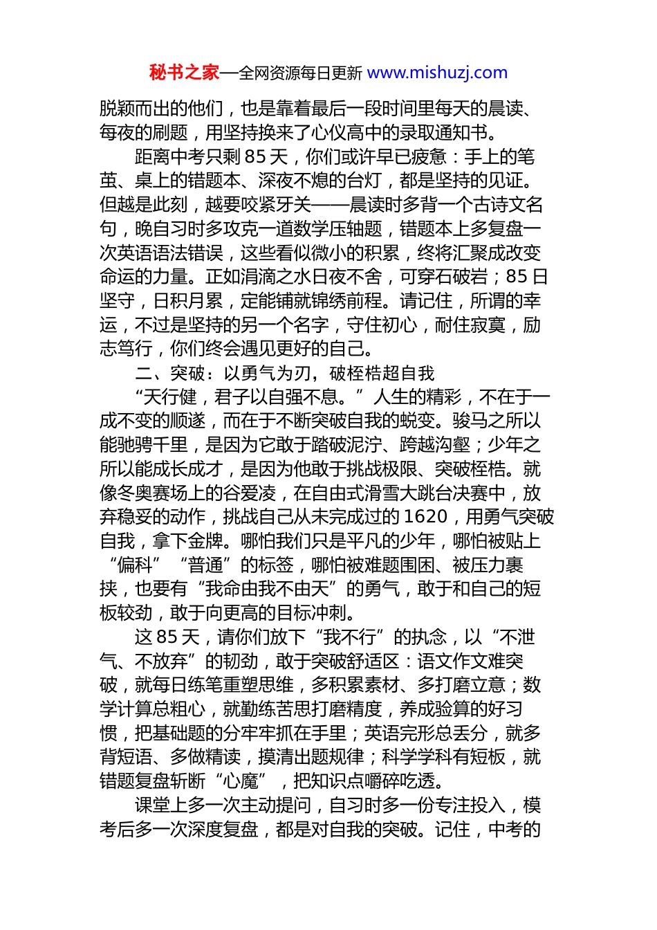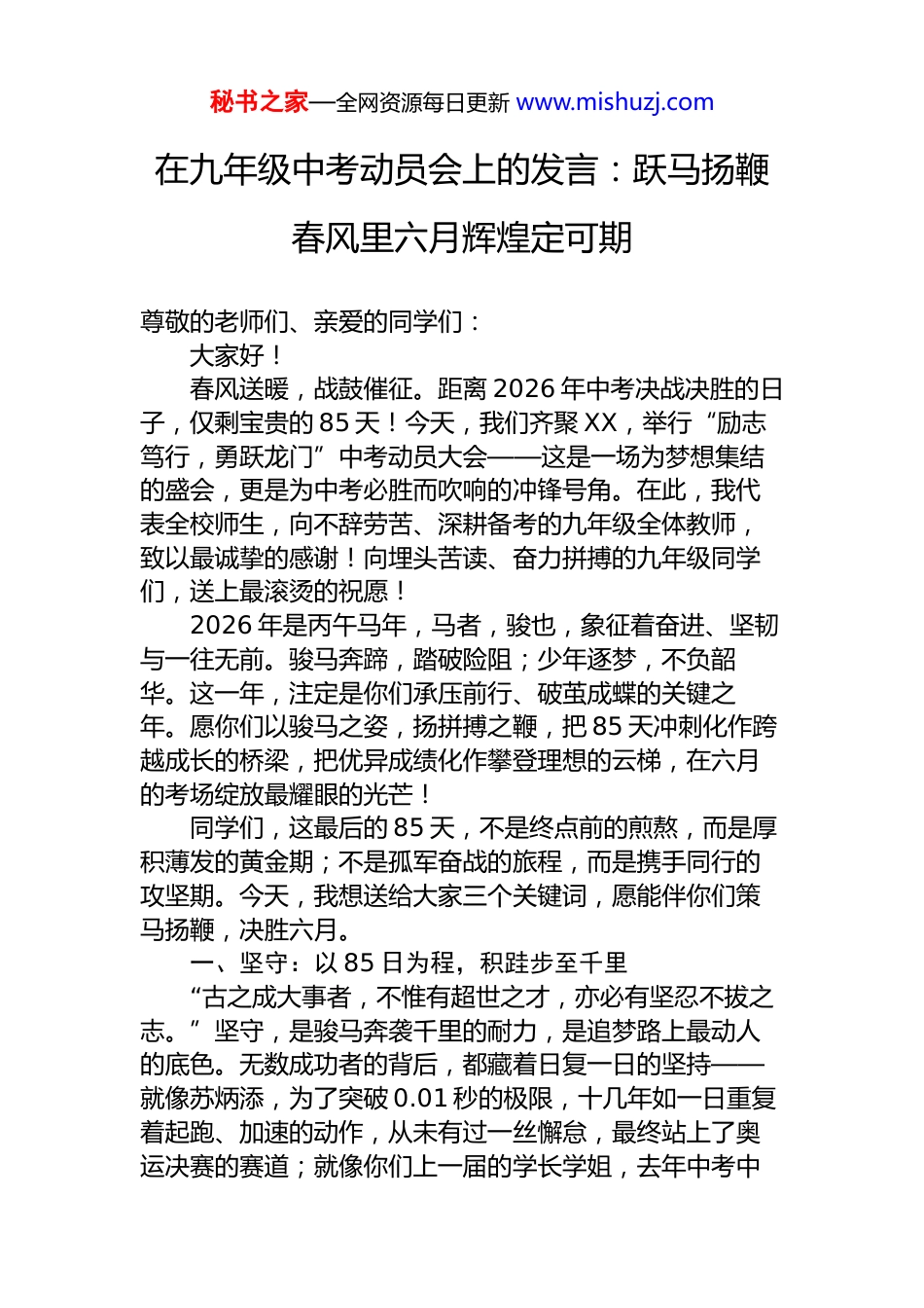 秘书之家—全网资源每日更新 www.mishuzj.com在九年级中考动员会上的发言:跃马扬鞭春风里六月辉煌定可期尊敬的老师们、亲爱的同学们:大家好!春风送暖,战鼓催征。距离 2026 年中考决战决胜的日子,仅剩宝贵的 85 天!今天,我们齐聚 XX,举行“励志笃行,勇跃龙门”中考动员大会——这是一场为梦想集结的盛会,更是为中考必胜而吹响的冲锋号角。在此,我代表全校师生,向不辞劳苦、深耕备考的九年级全体教师,致以最诚挚的感谢!向埋头苦读、奋力拼搏的九年级同学们,送上最滚烫的祝愿!2026 年是丙午马年,马者,骏也,象征着奋进、坚韧与一往无前。骏马奔蹄,踏破险阻;少年逐梦,不负韶华。这一年,注定是你们承压前行、破茧成蝶的关键之年。愿你们以骏马之姿,扬拼搏之鞭,把 85 天冲刺化作跨越成长的桥梁,把优异成绩化作攀登理想的云梯,在六月的考场绽放最耀眼的光芒!同学们,这最后的 85 天,不是终点前的煎熬,而是厚积薄发的黄金期;不是孤军奋战的旅程,而是携手同行的攻坚期。今天,我想送给大家三个关键词,愿能伴你们策马扬鞭,决胜六月。一、坚守:以 85 日为程,积跬步至千里“古之成大事者,不惟有超世之才,亦必有坚忍不拔之志。”坚守,是骏马奔袭千里的耐力,是追梦路上最动人的底色。无数成功者的背后,都藏着日复一日的坚持——就像苏炳添,为了突破 0.01 秒的极限,十几年如一日重复着起跑、加速的动作,从未有过一丝懈怠,最终站上了奥运决赛的赛道;就像你们上一届的学长学姐,去年中考中秘书之家—全网资源每日更新 www.mishuzj.com脱颖而出的他们,也是靠着最后一段时间里每天的晨读、每夜的刷题,用坚持换来了心仪高中的录取通知书。距离中考只剩 85 天,你们或许早已疲惫:手上的笔茧、桌上的错题本、深夜不熄的台灯,都是坚持的见证。但越是此刻,越要咬紧牙关——晨读时多背一个古诗文名句,晚自习时多攻克一道数学压轴题,错题本上多复盘一次英语语法错误,这些看似微小的积累,终将汇聚成改变命运的力量。正如涓滴之水日夜不舍,可穿石破岩;85 日坚守,日积月累,定能铺就锦绣前程。请记住,所谓的幸运,不过是坚持的另一个名字,守住初心,耐住寂寞,励志笃行,你们终会遇见更好的自己。二、突破:以勇气为刃,破桎梏超自我“天行健,君子以自强不息。”人生的精彩,不在于一成不变的顺遂,而在于不断突破自我的蜕变。骏马之所以能驰骋千里,是因为它敢于踏破泥泞、跨越沟壑;少年之所以能成长成才,是因为他敢于挑战极限、突破桎梏。就像冬奥赛场上的谷爱凌,在自由式滑雪大跳台决赛中,放弃稳妥的动作,挑战自己从未完成过的 1620,用勇气突破自我,拿下金牌。哪怕我们只是平凡的少年,哪怕被贴上“偏科”“普通”的标签,哪怕被难题围困、被压力裹挟,也要有“我命由我不由天”的勇气,敢于和自己的短板较劲,敢于向更高的目标冲刺。这 85 天,请你们放下“我不行”的执念,以“不泄气、不放弃”的韧劲,敢于突破舒适区:语文作文难突破,就每日练笔重塑思维,多积累素材、多打磨立意;数学计算总粗心,就勤练苦思打磨精度,养成验算的好习惯,把基础题的分牢牢抓在手里;英语完形总丢分,就多背短语、多做精读,摸清出题规律;科学学科有短板,就错题复盘斩断“心魔”,把知识点嚼碎吃透。课堂上多一次主动提问,自习时多一份专注投入,模考后多一次深度复盘,都是对自我的突破。记住,中考的秘书之家—全网资源每日更新 www.mishuzj.com赛场,不只是与他人的较量,更是与过去的自己比拼——每一次进步,都是一次华丽的蜕变;每一次突破,都是在为梦想铺路。哪怕只是多考一分,哪怕只是弄懂一个知识点,都是超越了昨天的自己,这就值得骄傲!三、同心:以并肩为盾,聚微光成星河骏马驰骋草原,从不独骑孤身;少年奔赴战场,从来都有同行之人。这 85 天,你们从来都不是一个人在战斗,你们的身后,站着最坚定的后盾、最温暖的同行者。亲爱的老师们,会做你们 85 天冲刺路上的引路人、护航者,他们会深耕考点、精研试卷,会为你们答疑解惑、疏解心情,会用自己的专业和陪伴,陪你们走过这最关键的 85天;亲...