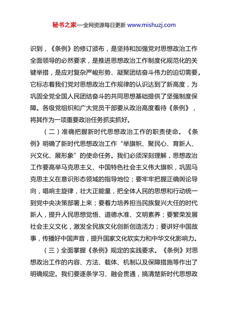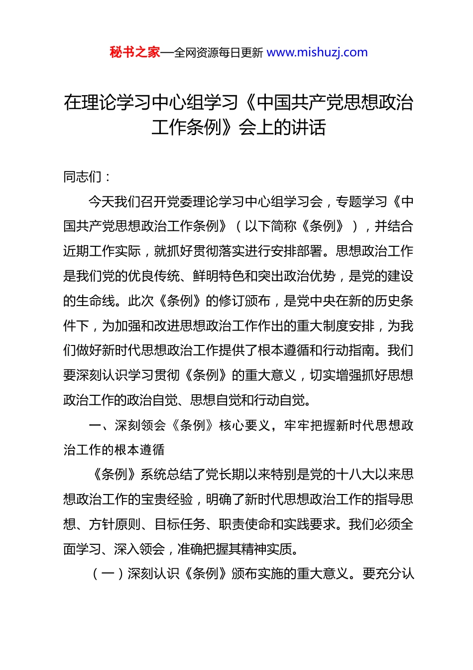 秘书之家—全网资源每日更新 www.mishuzj.com在理论学习中心组学习《中国共产党思想政治工作条例》会上的讲话 同志们:今天我们召开党委理论学习中心组学习会,专题学习《中国共产党思想政治工作条例》(以下简称《条例》),并结合近期工作实际,就抓好贯彻落实进行安排部署。思想政治工作是我们党的优良传统、鲜明特色和突出政治优势,是党的建设的生命线。此次《条例》的修订颁布,是党中央在新的历史条件下,为加强和改进思想政治工作作出的重大制度安排,为我们做好新时代思想政治工作提供了根本遵循和行动指南。我们要深刻认识学习贯彻《条例》的重大意义,切实增强抓好思想政治工作的政治自觉、思想自觉和行动自觉。一、深刻领会《条例》核心要义,牢牢把握新时代思想政治工作的根本遵循《条例》系统总结了党长期以来特别是党的十八大以来思想政治工作的宝贵经验,明确了新时代思想政治工作的指导思想、方针原则、目标任务、职责使命和实践要求。我们必须全面学习、深入领会,准确把握其精神实质。(一)深刻认识《条例》颁布实施的重大意义。要充分认秘书之家—全网资源每日更新 www.mishuzj.com识到,《条例》的修订颁布,是坚持和加强党对思想政治工作全面领导的必然要求,是推进思想政治工作制度化规范化的关键举措,是应对复杂严峻形势、凝聚团结奋斗伟力的迫切需要。它标志着我们党对思想政治工作规律的认识达到了新高度,为巩固全党全国人民团结奋斗的共同思想基础提供了坚强制度保障。各级党组织和广大党员干部要从政治高度看待《条例》,将其作为一项重要政治任务抓实抓好。(二)准确把握新时代思想政治工作的职责使命。《条例》明确了新时代思想政治工作“举旗帜、聚民心、育新人、兴文化、展形象”的使命任务。我们必须深刻理解,思想政治工作要高举马克思主义、中国特色社会主义伟大旗帜,巩固马克思主义在意识形态领域的指导地位;要牢牢把握正确舆论导向,唱响主旋律,壮大正能量,把全体人民的思想和行动统一到党中央决策部署上来;要着力培养担当民族复兴大任的时代新人,提升人民思想觉悟、道德水准、文明素养;要繁荣发展社会主义文化,激发全民族文化创新创造活力;要讲好中国故事,传播好中国声音,提升国家文化软实力和中华文化影响力。(三)全面掌握《条例》规定的实践要求。《条例》对思想政治工作的内容、方法、载体、机制以及保障措施等作出了明确规定。我们要逐条学习、融会贯通,搞清楚新时代思想政秘书之家—全网资源每日更新 www.mishuzj.com治工作“干什么、怎么干、谁来干、如何保障”等基本问题。要重点掌握坚持用党的创新理论武装全党、教育人民这一首要任务,掌握理想信念教育、社会主义核心价值观培育践行、形势政策教育、法治宣传教育、人文关怀和心理疏导等主要内容,掌握改进创新工作方法、建强用好各类阵地、健全完善领导体制和工作机制等实践路径,确保思想政治工作有章可循、规范运行。二、紧密结合工作实际,推动《条例》各项规定落地生根学习贯彻《条例》,关键在于落实。我们要坚持学以致用用以促学,把《条例》要求融入中心工作、贯穿发展全过程,转化为推动事业发展的强大动力和实际成效。(一)在强化理论武装上持续用力。坚持把学习宣传贯彻党的创新理论作为思想政治工作的重中之重。一是要深化理论学习。健全完善党委(党组)理论学习中心组学习制度,发挥领导干部领学促学作用,带动全体党员干部读原著、学原文、悟原理,深刻领会党的创新理论的核心要义、精神实质、丰富内涵和实践要求。二是要创新宣传阐释。针对不同群体特点,运用通俗易懂的语言、生动鲜活的事例、丰富多样的形式,推动党的创新理论进机关、进企业、进社区、进校园、进网络,使之深入人心、落地生根。三是要加强研究阐释。围绕重大理秘书之家—全网资源每日更新 www.mishuzj.com论和现实问题,组织力量开展深入研究,推出有分量、有价值的研究成果,为科学决策和实践发展提供学理支撑。(二)在服务中心大局上精准发力。紧紧围绕党委中心工作和改革发展稳定大局谋划推进思想政治工作。一是要凝聚发展共识。结合当前正在推进的重点任务、重大项...
