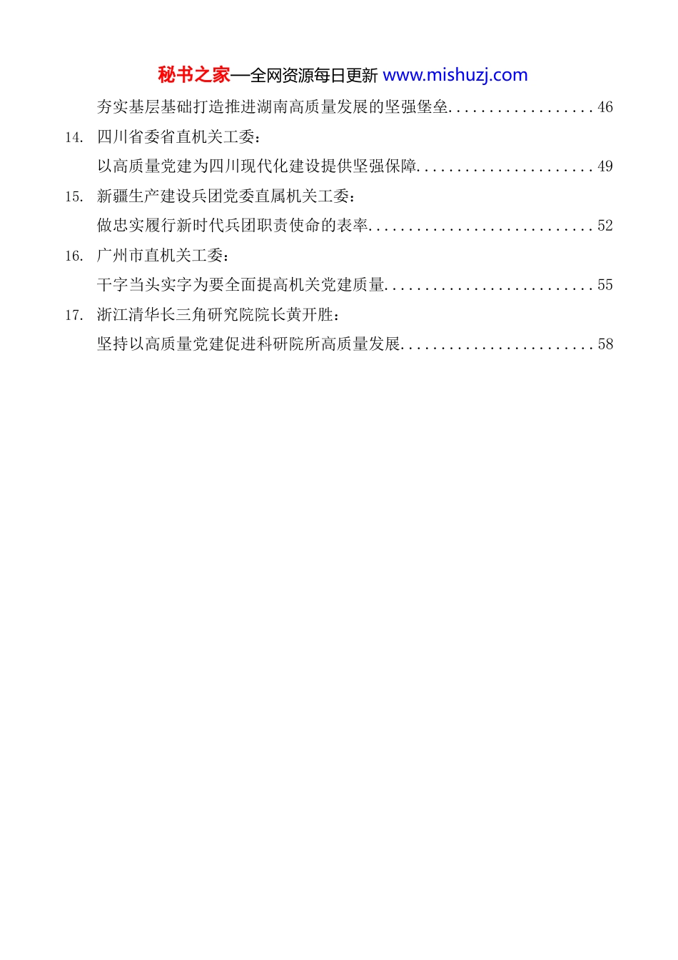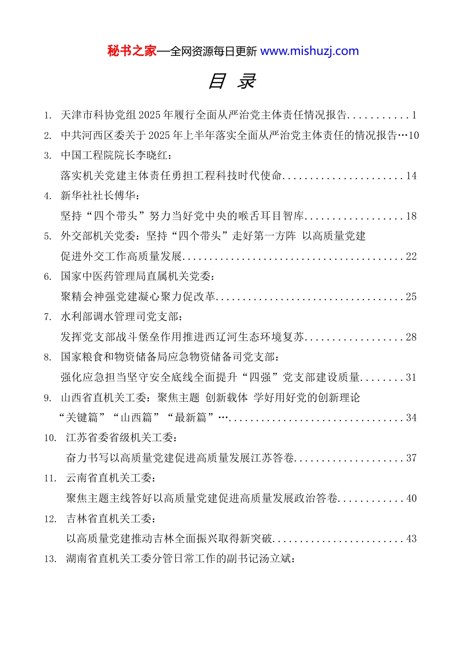 秘书之家—全网资源每日更新 www.mishuzj.com目 录1. 天津市科协党组 2025 年履行全面从严治党主体责任情况报告...........1 2. 中共河西区委关于 2025 年上半年落实全面从严治党主体责任的情况报告…10 3. 中国工程院院长李晓红: 落实机关党建主体责任勇担工程科技时代使命......................14 4. 新华社社长傅华: 坚持“四个带头”努力当好党中央的喉舌耳目智库..................18 5. 外交部机关党委:坚持“四个带头”走好第一方阵 以高质量党建 促进外交工作高质量发展.........................................22 6. 国家中医药管理局直属机关党委: 聚精会神强党建凝心聚力促改革...................................25 7. 水利部调水管理司党支部: 发挥党支部战斗堡垒作用推进西辽河生态环境复苏..................28 8. 国家粮食和物资储备局应急物资储备司党支部: 强化应急担当坚守安全底线全面提升“四强”党支部建设质量........31 9. 山西省直机关工委:聚焦主题 创新载体 学好用好党的创新理论 “关键篇”“山西篇”“最新篇”…................................34 10. 江苏省委省级机关工委: 奋力书写以高质量党建促进高质量发展江苏答卷....................37 11. 云南省直机关工委: 聚焦主题主线答好以高质量党建促进高质量发展政治答卷............40 12. 吉林省直机关工委: 以高质量党建推动吉林全面振兴取得新突破........................43 13. 湖南省直机关工委分管日常工作的副书记汤立斌: 秘书之家—全网资源每日更新 www.mishuzj.com夯实基层基础打造推进湖南高质量发展的坚强堡垒..................46 14. 四川省委省直机关工委: 以高质量党建为四川现代化建设提供坚强保障......................49 15. 新疆生产建设兵团党委直属机关工委: 做忠实履行新时代兵团职责使命的表率............................52 16. 广州市直机关工委: 干字当头实字为要全面提高机关党建质量..........................55 17. 浙江清华长三角研究院院长黄开胜: 坚持以高质量党建促进科研院所高质量发展........................58秘书之家—全网资源每日更新 www.mishuzj.com天津市科协党组 2025 年履行全面从严治党主体责任情况报告(2025 年 11 月 29 日)今年以来,在市委市政府的坚强领导下,在市纪委监委和派驻纪检监察组的监督指导下,市科协党组深入学习党的二十大和历次全会精神,深入贯彻落实习近平总书记视察天津重要讲话精神、关于全面从严治党的重要论述以及科“协工作、科技工作的重要指示要求,围绕科协组织政治引领主责和 1+3+2”主“”“”“业,聚焦服务天津 十项行动 和 三新三量 生动实践,推进实施 品牌塑”“” 造 和 聚力攻坚 专项行动,扎实开展深入贯彻中央八项规定精神学习教育, 全力支持配合市委巡视工作,进一步全面加强党的政治、思想、组织、作风、纪律、制度和党风廉政建设,为科协事业高质量发展提供了坚强保证。现将主要情况报告如下:一、始终坚持政治统领,做到“两个维护”更加坚定自觉一是把牢政治方向,旗帜鲜明讲政治。持续深入学习习近平新时代中国特色社会主义思想,坚决学习贯彻党的二十大和四中全会精神,贯彻落实习近平总书记视察天津重要讲话精神、关于全面从严治党、加强作风建设的重要论述和对天津工作、科协工作的系列重要指示精神和市委部署要求。坚持首要政治“”任务首位抓,认真落实 第一议题 制度,召开党组会 25 次、党组理论学习中心组学习 8 次,举办专题读书班 2 次,制定《市科协学习宣传贯彻党的二十届四中全会精神工作安排》《市科协关于开展深入贯彻中央八项规定精神学习教育工作安排》,科协党组充分发挥把方向、管大局、保落实作用,带动所属三个党委切实把思想和行动统一到中央和市委决策部署上来。组织召开市科协全委会、常委会,胜利召开市科协第十次代表大会,市委敏尔书记、中国科协军科书记出席大会并讲话,市政府、市人大、市政协主要领导出席会议,桂平副书记主持开幕会,广大科技...