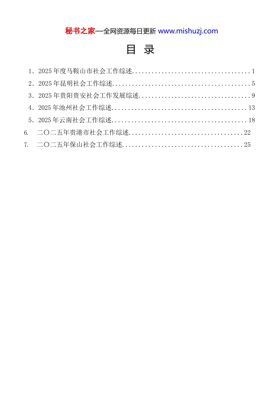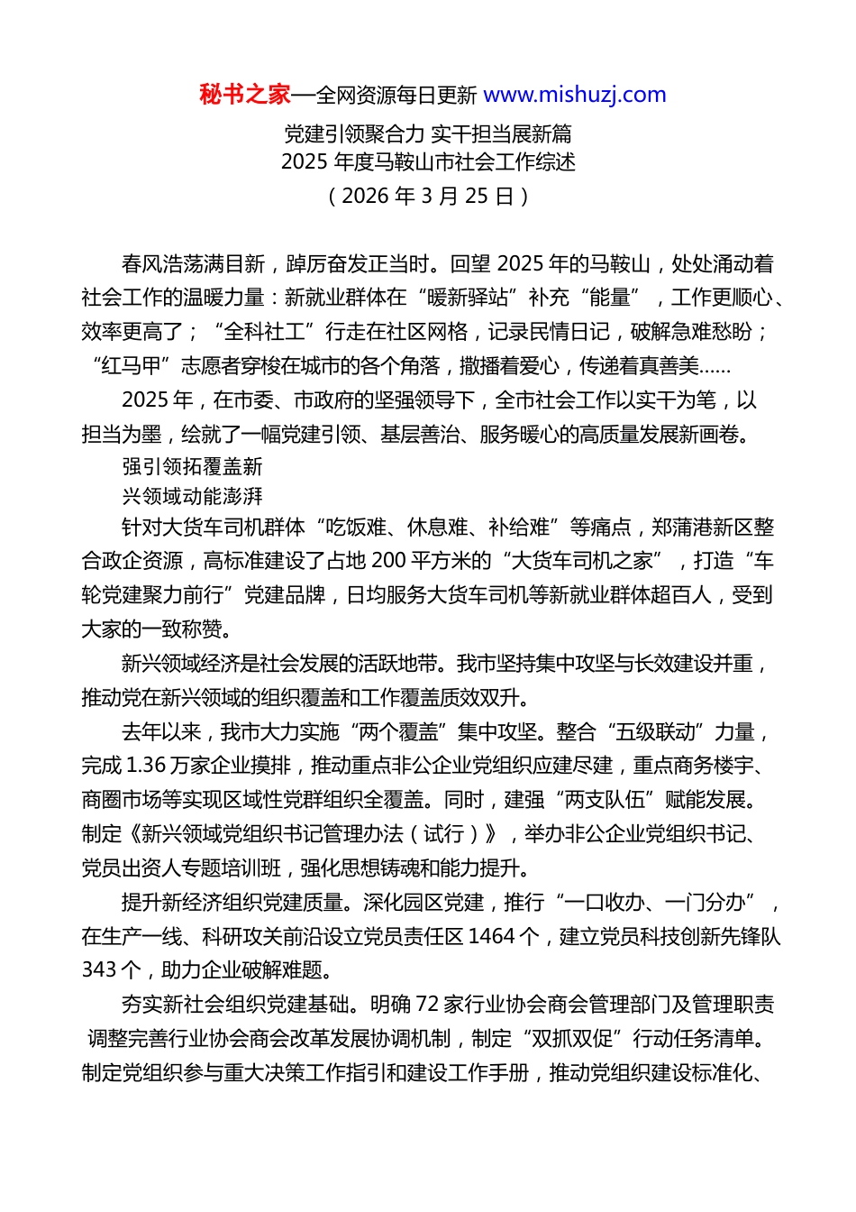 秘书之家—全网资源每日更新 www.mishuzj.com目 录1.2025 年度马鞍山市社会工作综述....................................1 2.2025 年昆明社会工作综述..........................................5 3.2025 年贵阳贵安社会工作发展综述..................................9 4.2025 年池州社会工作综述.........................................13 5.2025 年云南社会工作综述.........................................18 6.二〇二五年贵港市社会工作综述...................................22 7.二〇二五年保山社会工作综述.....................................25 秘书之家—全网资源每日更新 www.mishuzj.com党建引领聚合力 实干担当展新篇2025 年度马鞍山市社会工作综述(2026 年 3 月 25 日)春风浩荡满目新,踔厉奋发正当时。回望 2025 年的马鞍山,处处涌动着社会工作的温暖力量:新就业群体在“暖新驿站”补充“能量”,工作更顺心、效率更高了;“全科社工”行走在社区网格,记录民情日记,破解急难愁盼;“红马甲”志愿者穿梭在城市的各个角落,撒播着爱心,传递着真善美……2025 年,在市委、市政府的坚强领导下,全市社会工作以实干为笔,以担当为墨,绘就了一幅党建引领、基层善治、服务暖心的高质量发展新画卷。强引领拓覆盖新兴领域动能澎湃针对大货车司机群体“吃饭难、休息难、补给难”等痛点,郑蒲港新区整合政企资源,高标准建设了占地 200 平方米的“大货车司机之家”,打造“车轮党建聚力前行”党建品牌,日均服务大货车司机等新就业群体超百人,受到大家的一致称赞。新兴领域经济是社会发展的活跃地带。我市坚持集中攻坚与长效建设并重, 推动党在新兴领域的组织覆盖和工作覆盖质效双升。去年以来,我市大力实施“两个覆盖”集中攻坚。整合“五级联动”力量, 完成 1.36 万家企业摸排,推动重点非公企业党组织应建尽建,重点商务楼宇、商圈市场等实现区域性党群组织全覆盖。同时,建强“两支队伍”赋能发展。制定《新兴领域党组织书记管理办法(试行)》,举办非公企业党组织书记、党员出资人专题培训班,强化思想铸魂和能力提升。提升新经济组织党建质量。深化园区党建,推行“一口收办、一门分办”,在生产一线、科研攻关前沿设立党员责任区 1464 个,建立党员科技创新先锋队343 个,助力企业破解难题。夯实新社会组织党建基础。明确 72 家行业协会商会管理部门及管理职责 调整完善行业协会商会改革发展协调机制,制定“双抓双促”行动任务清单。制定党组织参与重大决策工作指引和建设工作手册,推动党组织建设标准化、秘书之家—全网资源每日更新 www.mishuzj.com作用发挥常态化。加强新就业群体关心关爱。实施“暖新十件事”2.0 版,推动“友好场景”秘书之家—全网资源每日更新 www.mishuzj.com提质扩面,打造星悦广场暖“新”驿站、军民路“友好美食街”、暖“新”餐厅、友好医院等一批友好设施。探索治理“合伙人”等模式,组织快递、外卖小哥担任“微网格员”“食品安全监督员”等,参与志愿服务超 1.5 万人次,3人获评“省十佳新就业群体”。和县“新就业群体变身城市‘合伙人’”入选全国 2025 年度新兴领域党建创新案例。优机制提效能基层治理纵深推进基层治,则天下安。我市始终坚持以人民为中心的发展思想,以党建引领基层治理为核心,持续完善机制,深化减负增效,构建多元共治,推动基层治理体系和治理能力现代化建设水平稳步提升。完善协同治理机制。健全完善市、县两级党建引领基层治理协调机制,实现全覆盖并常态化运行。推深做实四级书记领办项目机制,2025 年,我市四级书记领办项目 608 个,全面覆盖产业发展、民生服务等多个领域。当涂县大陇镇麻村村党总支书记领办“菱”聚麻村产业项目,培育本土主播 20 余名,销售菱角 45 吨,销售额达 45 万元。花山区委书记领办体育路夜市项目,通过统一规划、系统治理、规范运营,将 300 余家流动摊点引入 6366 平方米规范夜市,变“治理痛点”为“幸福支点”,入选安徽省“皖美消费”新场景。深化“六尺巷工作法”运用。由市...