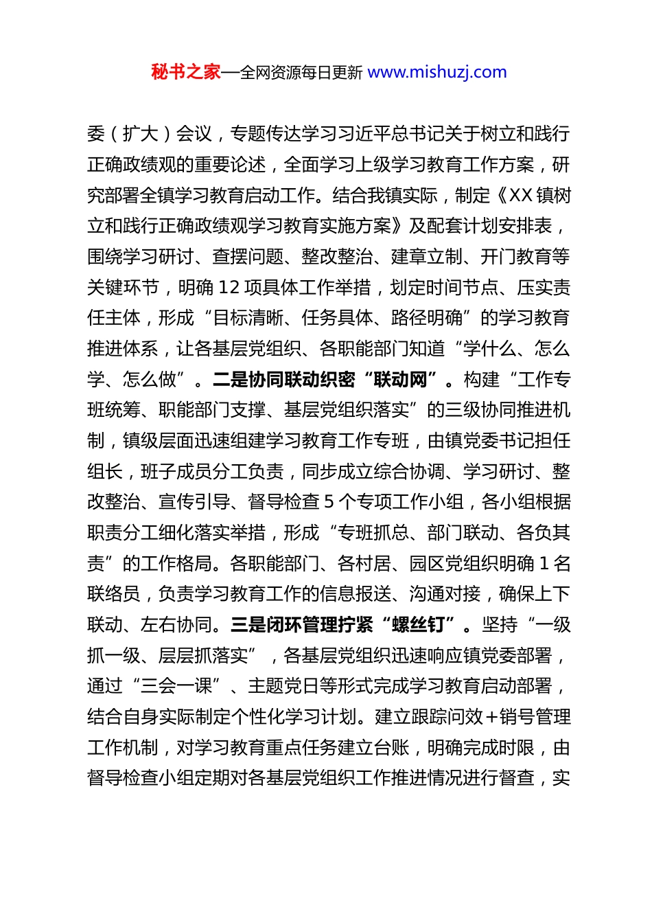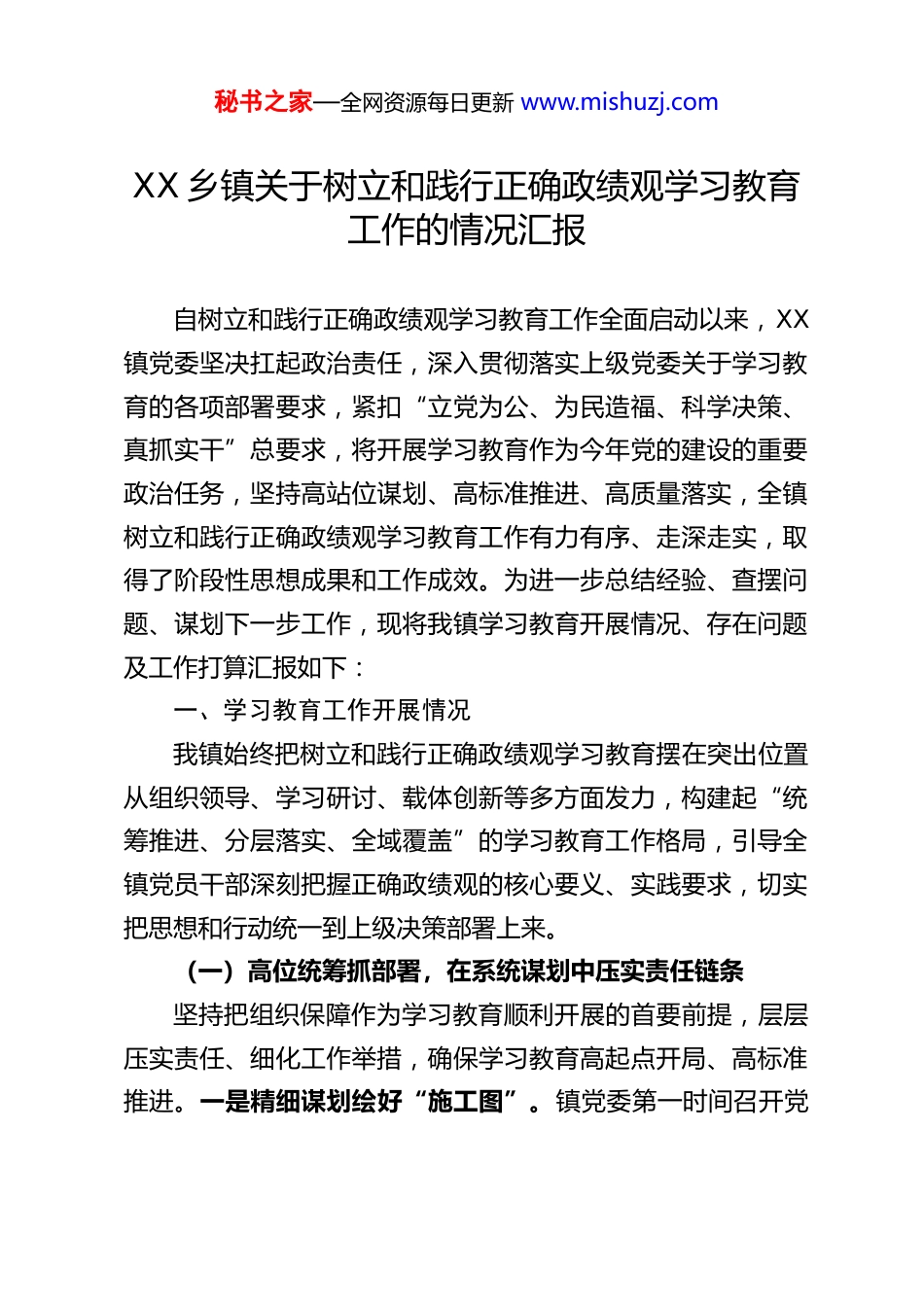 秘书之家—全网资源每日更新 www.mishuzj.comXX 乡镇关于树立和践行正确政绩观学习教育工作的情况汇报自树立和践行正确政绩观学习教育工作全面启动以来,XX镇党委坚决扛起政治责任,深入贯彻落实上级党委关于学习教育的各项部署要求,紧扣“立党为公、为民造福、科学决策、真抓实干”总要求,将开展学习教育作为今年党的建设的重要政治任务,坚持高站位谋划、高标准推进、高质量落实,全镇树立和践行正确政绩观学习教育工作有力有序、走深走实,取得了阶段性思想成果和工作成效。为进一步总结经验、查摆问题、谋划下一步工作,现将我镇学习教育开展情况、存在问题及工作打算汇报如下:一、学习教育工作开展情况我镇始终把树立和践行正确政绩观学习教育摆在突出位置从组织领导、学习研讨、载体创新等多方面发力,构建起“统筹推进、分层落实、全域覆盖”的学习教育工作格局,引导全镇党员干部深刻把握正确政绩观的核心要义、实践要求,切实把思想和行动统一到上级决策部署上来。(一)高位统筹抓部署,在系统谋划中压实责任链条坚持把组织保障作为学习教育顺利开展的首要前提,层层压实责任、细化工作举措,确保学习教育高起点开局、高标准推进。一是精细谋划绘好“施工图”。镇党委第一时间召开党秘书之家—全网资源每日更新 www.mishuzj.com委(扩大)会议,专题传达学习习近平总书记关于树立和践行正确政绩观的重要论述,全面学习上级学习教育工作方案,研究部署全镇学习教育启动工作。结合我镇实际,制定《XX 镇树立和践行正确政绩观学习教育实施方案》及配套计划安排表,围绕学习研讨、查摆问题、整改整治、建章立制、开门教育等关键环节,明确 12 项具体工作举措,划定时间节点、压实责任主体,形成“目标清晰、任务具体、路径明确”的学习教育推进体系,让各基层党组织、各职能部门知道“学什么、怎么学、怎么做”。二是协同联动织密“联动网”。构建“工作专班统筹、职能部门支撑、基层党组织落实”的三级协同推进机制,镇级层面迅速组建学习教育工作专班,由镇党委书记担任组长,班子成员分工负责,同步成立综合协调、学习研讨、整改整治、宣传引导、督导检查 5 个专项工作小组,各小组根据职责分工细化落实举措,形成“专班抓总、部门联动、各负其责”的工作格局。各职能部门、各村居、园区党组织明确 1 名联络员,负责学习教育工作的信息报送、沟通对接,确保上下联动、左右协同。三是闭环管理拧紧“螺丝钉”。坚持“一级抓一级、层层抓落实”,各基层党组织迅速响应镇党委部署,通过“三会一课”、主题党日等形式完成学习教育启动部署,结合自身实际制定个性化学习计划。建立跟踪问效+销号管理工作机制,对学习教育重点任务建立台账,明确完成时限,由督导检查小组定期对各基层党组织工作推进情况进行督查,实秘书之家—全网资源每日更新 www.mishuzj.com时掌握工作进度,对完成的任务及时销号,对推进滞后的情况督促整改,初步形成“部署-落实-督查-反馈-提升”的工作闭环,确保学习教育各项任务落地见效。(二)头雁领航深研学,在分层分类中推动学深悟透坚持把理论学习作为学习教育的核心内容,以“头雁领航全域覆盖”为思路,分层分类开展学习研讨,引导党员干部在深学细悟中筑牢树立和践行正确政绩观的思想根基。一是领导班子示范学,做好“排头兵”。镇党委班子充分发挥“关键少数”示范引领作用,深化理论学习中心组**“1+2+X”学习模式**(1 个核心学习专题、2 次专题集中研讨、X 项特色学习活动),坚持先学一步、学深一层,把《习近平关于树立和践行正确政绩观论述摘编》作为必学教材,通过个人自学、领学导学、集体研讨相结合的方式,原原本本学、逐字逐句悟,深刻领会正确政绩观的丰富内涵和实践要求。班子成员结合分管工作开展专题研讨,分享学习心得、交流思想认识,共开展中心组专题学习 2 次、集中研讨 1 次,形成研讨材料 10 余篇,切实把学习成果转化为谋划工作的思路、推动工作的举措。二是全域覆盖精准学,确保“无死角”。依托我镇“小美课堂”学习品牌,组织镇领导班子成员、各基层党组织书记、党员骨干开展专题学习,邀请区...
