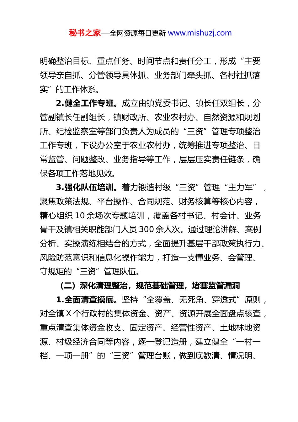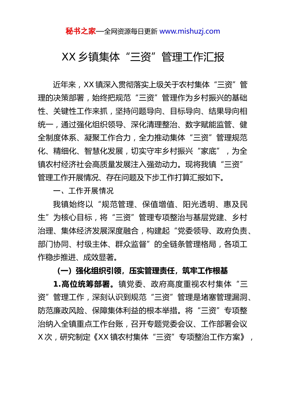 秘书之家—全网资源每日更新 www.mishuzj.comXX 乡镇集体“三资”管理工作汇报近年来,XX 镇深入贯彻落实上级关于农村集体“三资”管理的决策部署,始终把规范“三资”管理作为乡村振兴的基础性、关键性工作来抓,坚持问题导向、目标导向、结果导向相统一,通过强化组织领导、深化清理整治、数字赋能监管、健全制度体系、凝聚工作合力,全力推动集体“三资”管理规范化、精细化、智慧化发展,切实守牢乡村振兴“家底”,为全镇农村经济社会高质量发展注入强劲动力。现将我镇“三资”管理工作开展情况、存在问题及下步工作打算汇报如下。一、工作开展情况我镇始终以“规范管理、保值增值、阳光透明、惠及民生”为核心目标,将“三资”管理专项整治与基层党建、乡村治理、集体经济发展深度融合,构建起“党委领导、政府负责、部门协同、村级主体、群众监督”的全链条管理格局,各项工作稳步推进、成效显著。(一)强化组织引领,压实管理责任,筑牢工作根基1.高位统筹部署。镇党委、政府高度重视农村集体“三资”管理工作,深刻认识到规范“三资”管理是堵塞管理漏洞、防范廉政风险、保障集体利益的根本举措。将“三资”专项整治纳入全镇重点工作台账,召开专题党委会议、工作部署会议X 次,研究制定《XX 镇农村集体“三资”专项整治工作方案》,秘书之家—全网资源每日更新 www.mishuzj.com明确整治目标、重点任务、时间节点和责任分工,形成“主要领导亲自抓、分管领导具体抓、业务部门牵头抓、各村社抓落实”的工作体系。2.健全工作专班。成立由镇党委书记、镇长任双组长,分管副镇长任副组长,镇财政所、农业农村办、自然资源和规划所、纪检监察室等部门负责人为成员的“三资”管理专项整治工作专班,下设办公室于农业农村办,统筹推进专项整治、日常监管、问题整改、业务指导等工作,层层压实责任链条,确保各项工作落地见效。3.强化队伍培训。着力锻造村级“三资”管理“主力军”,聚焦政策法规、平台操作、合同规范、财务核算等核心内容,精心组织 10 余场次专题培训,覆盖各村书记、村会计、业务骨干及镇相关职能部门人员 300 余人次。通过理论讲解、案例分析、实操演练相结合的方式,全面提升基层干部政策执行力、风险防范意识和信息化操作能力,打造一支懂业务、会管理、守规矩的“三资”管理队伍。(二)深化清理整治,规范基础管理,堵塞监管漏洞1.全面清查摸底。坚持“全覆盖、无死角、穿透式”原则,对全镇 X 个行政村的集体资金、资产、资源开展全面盘点核查,重点清查集体资金收支、固定资产、经营性资产、土地林地资源、村级经济合同等内容,逐一登记造册,建立健全“一村一档、一项一册”的“三资”管理台账,做到底数清、情况明、秘书之家—全网资源每日更新 www.mishuzj.com数据准。2.从严清理合同。针对村级合同不规范、价格偏低、期限过长、欠款拖欠等突出问题,组建专项审核专班,联合法律专家对全镇 84 份村级经营性合同、资源发包合同开展逐份审核、精准研判。坚持分类处置、立行立改,同步推进“补程序、修条款、追欠款”工作,其中沙墩村原超低价格租赁合同经审核整改后,重新签订规范合同,有效堵塞资产流失漏洞,保障集体资产保值增值。3.狠抓问题整改。建立“排查—建档—整改—销号”闭环管理机制,对清查发现的资金管理不规范、资产处置程序缺失、资源发包不合理等问题,明确整改责任人、整改措施和整改时限,实行销号管理。截至目前,各类排查问题已全部整改到位,整改完成率达 100%。(三)数字赋能监管,提升智慧水平,实现阳光运行1.依托平台监管。全面对接省级农村集体“三资”信息化监管平台,将全镇集体资金、资产、资源数据全部录入系统,实现基础数据高质量归集、常态化更新,构建起精准化、动态化、可视化的智慧监管体系,彻底解决传统管理“底数不清、监管滞后、效率低下”的问题。2.强化预警处置。充分发挥信息化监管平台自动预警功能,对资金异常支出、合同到期未续签、资产闲置等情况实时预警,安排专人负责预警信息接收、核实、处置、反馈,累计处理各秘书之家—全网资源每日更新 www.mishuzj.com类预警信息 193 ...