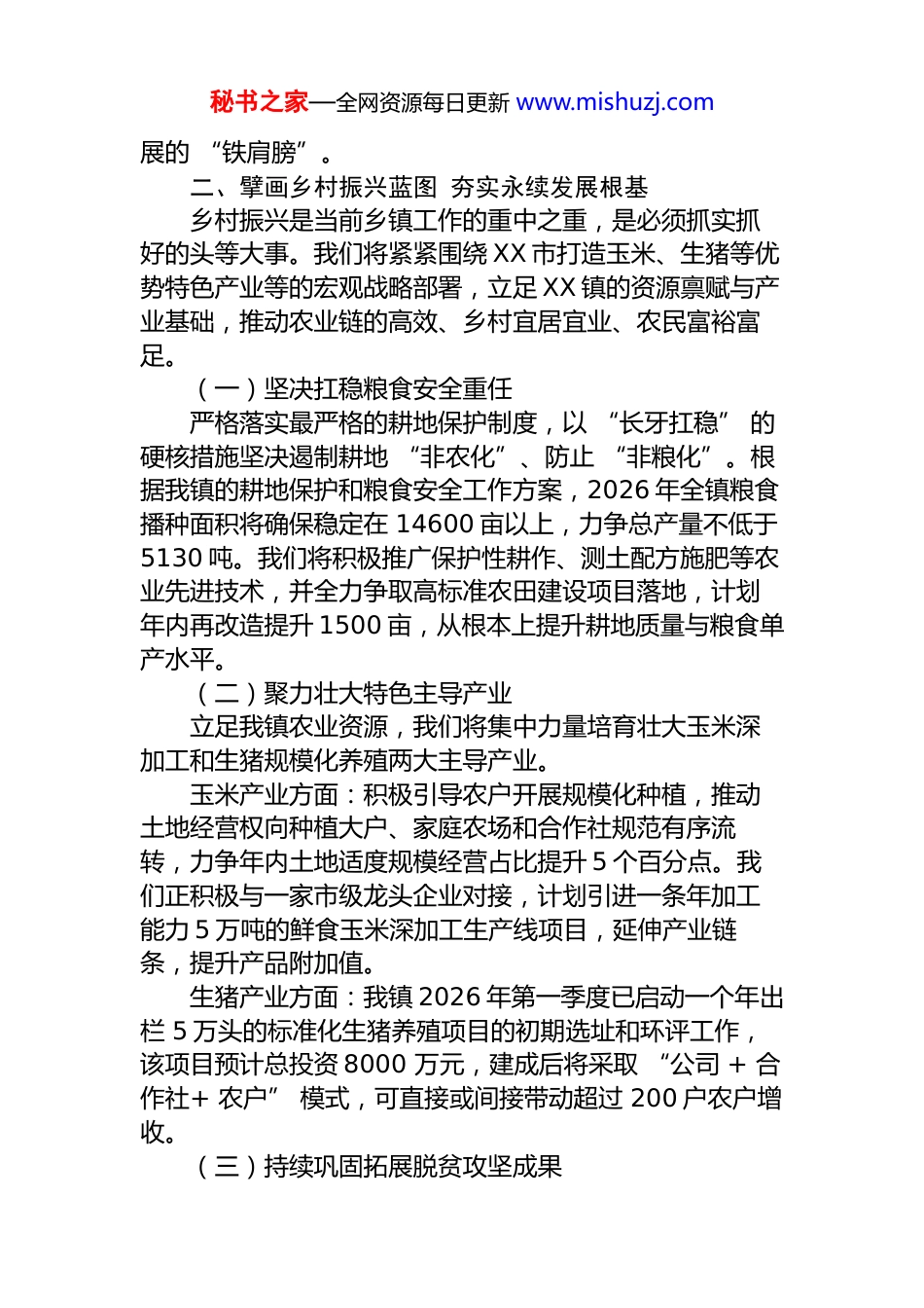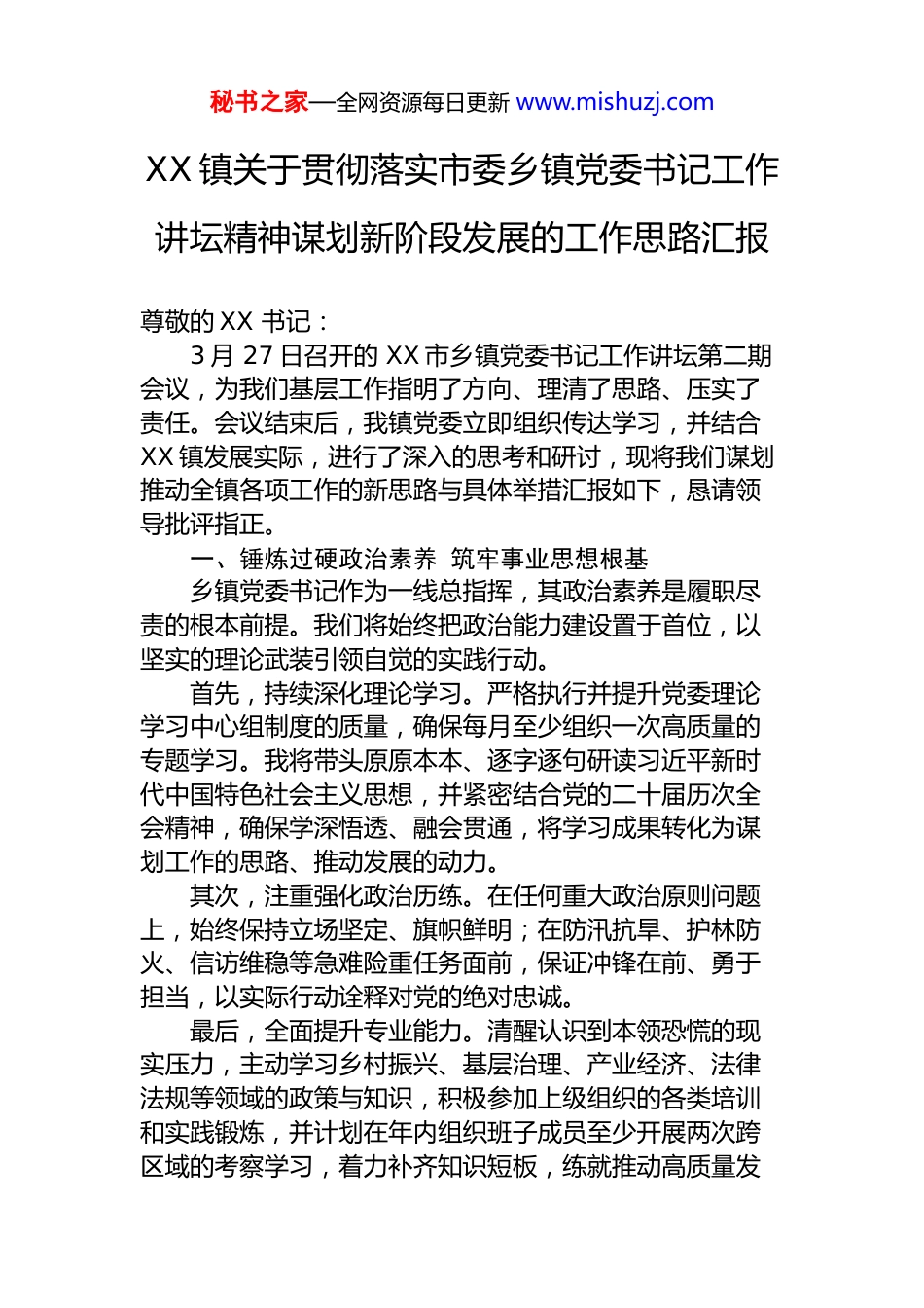 秘书之家—全网资源每日更新 www.mishuzj.comXX 镇关于贯彻落实市委乡镇党委书记工作讲坛精神谋划新阶段发展的工作思路汇报尊敬的 XX 书记:3 月 27 日召开的 XX 市乡镇党委书记工作讲坛第二期会议,为我们基层工作指明了方向、理清了思路、压实了责任。会议结束后,我镇党委立即组织传达学习,并结合XX 镇发展实际,进行了深入的思考和研讨,现将我们谋划推动全镇各项工作的新思路与具体举措汇报如下,恳请领导批评指正。一、锤炼过硬政治素养 筑牢事业思想根基乡镇党委书记作为一线总指挥,其政治素养是履职尽责的根本前提。我们将始终把政治能力建设置于首位,以坚实的理论武装引领自觉的实践行动。首先,持续深化理论学习。严格执行并提升党委理论学习中心组制度的质量,确保每月至少组织一次高质量的专题学习。我将带头原原本本、逐字逐句研读习近平新时代中国特色社会主义思想,并紧密结合党的二十届历次全会精神,确保学深悟透、融会贯通,将学习成果转化为谋划工作的思路、推动发展的动力。其次,注重强化政治历练。在任何重大政治原则问题上,始终保持立场坚定、旗帜鲜明;在防汛抗旱、护林防火、信访维稳等急难险重任务面前,保证冲锋在前、勇于担当,以实际行动诠释对党的绝对忠诚。最后,全面提升专业能力。清醒认识到本领恐慌的现实压力,主动学习乡村振兴、基层治理、产业经济、法律法规等领域的政策与知识,积极参加上级组织的各类培训和实践锻炼,并计划在年内组织班子成员至少开展两次跨区域的考察学习,着力补齐知识短板,练就推动高质量发秘书之家—全网资源每日更新 www.mishuzj.com展的 “铁肩膀”。二、擘画乡村振兴蓝图 夯实永续发展根基乡村振兴是当前乡镇工作的重中之重,是必须抓实抓好的头等大事。我们将紧紧围绕 XX 市打造玉米、生猪等优势特色产业等的宏观战略部署,立足 XX 镇的资源禀赋与产业基础,推动农业链的高效、乡村宜居宜业、农民富裕富足。(一)坚决扛稳粮食安全重任严格落实最严格的耕地保护制度,以 “长牙扛稳” 的硬核措施坚决遏制耕地 “非农化”、防止 “非粮化”。根据我镇的耕地保护和粮食安全工作方案,2026 年全镇粮食播种面积将确保稳定在 14600 亩以上,力争总产量不低于5130 吨。我们将积极推广保护性耕作、测土配方施肥等农业先进技术,并全力争取高标准农田建设项目落地,计划年内再改造提升 1500 亩,从根本上提升耕地质量与粮食单产水平。(二)聚力壮大特色主导产业立足我镇农业资源,我们将集中力量培育壮大玉米深加工和生猪规模化养殖两大主导产业。玉米产业方面:积极引导农户开展规模化种植,推动土地经营权向种植大户、家庭农场和合作社规范有序流转,力争年内土地适度规模经营占比提升 5 个百分点。我们正积极与一家市级龙头企业对接,计划引进一条年加工能力 5 万吨的鲜食玉米深加工生产线项目,延伸产业链条,提升产品附加值。生猪产业方面:我镇 2026 年第一季度已启动一个年出栏 5 万头的标准化生猪养殖项目的初期选址和环评工作,该项目预计总投资 8000 万元,建成后将采取 “公司 + 合作社+ 农户” 模式,可直接或间接带动超过 200 户农户增收。(三)持续巩固拓展脱贫攻坚成果秘书之家—全网资源每日更新 www.mishuzj.com坚持 “四个不摘”,持续完善常态动态监测和帮扶机制,对全镇所有脱贫户、监测户实行常态化跟踪回访,确保不发生一户规模性返贫。同时,强化产业带动和就业帮扶,完善新型农业经营主体与农户的利益联结机制,确保脱贫群众收入增速高于全镇居民平均水平。三、深化人居环境整治 绘就和美宜居乡村农村人居环境整治是提升群众幸福感、获得感最直接的体现,是乡村振兴的 “面子” 更是 “里子”。我们将按照 XX 市全面推进宜居宜业和美乡村建设的部署要求,以绣花功夫持续用力、久久为功。(一)常态化推进村庄清洁行动以 “三清一改” 为抓手,将村庄清洁行动从集中整治转向常态化、制度化管理。目前,我镇已建立起 “户分类、村收集、镇转运、县处理” 的农村生活垃圾收运处置长效机制,城乡环卫一体化覆盖率达到 100%,从源...